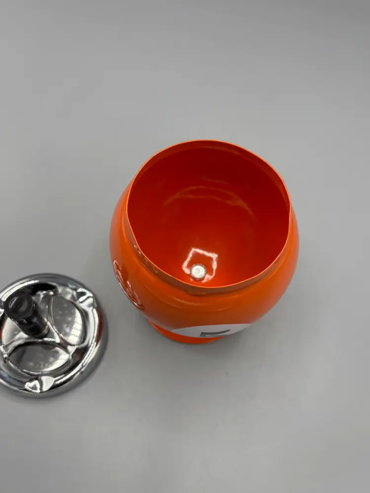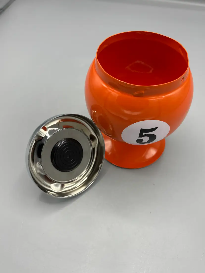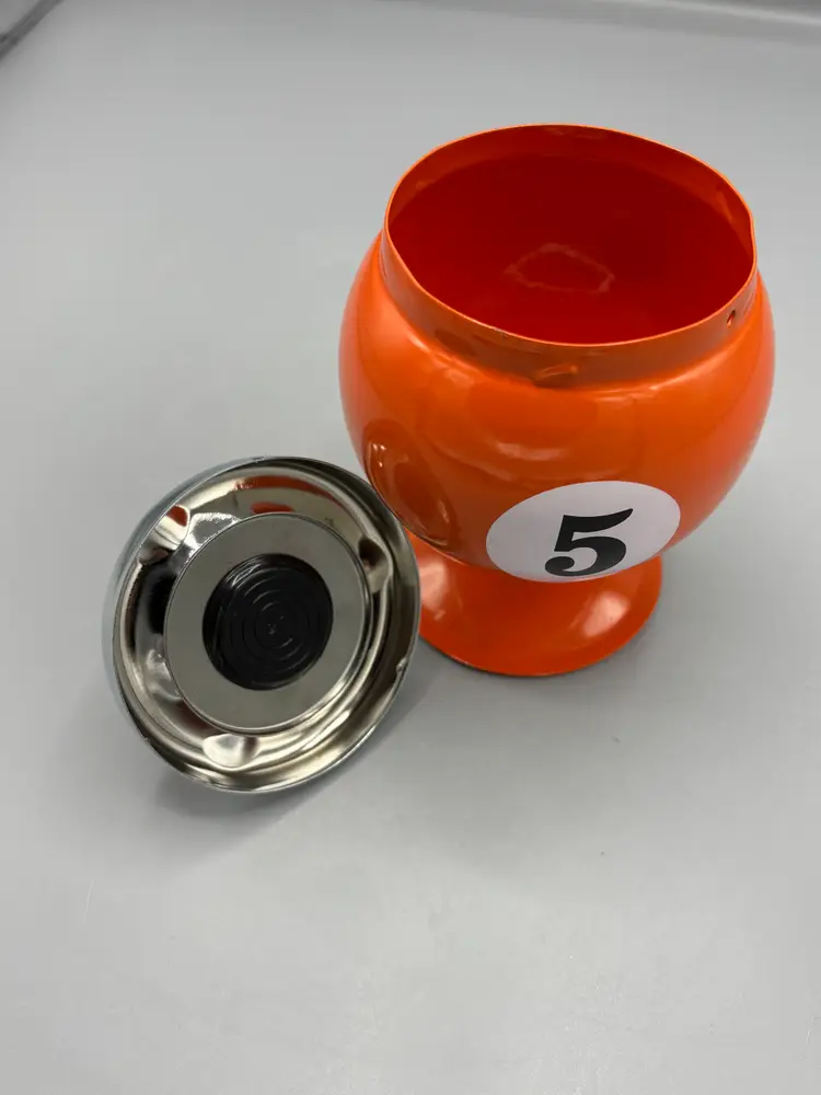 This distinctive pool ball-shaped ashtray captures mid-century charm with its vibrant orange finish. Sized at 4 by 7 inches, it serves as both a functional smoking accessory and a nostalgic conversation piece. The vintage aesthetic makes it an ideal addition to game rooms, bars, or collections of retro memorabilia.