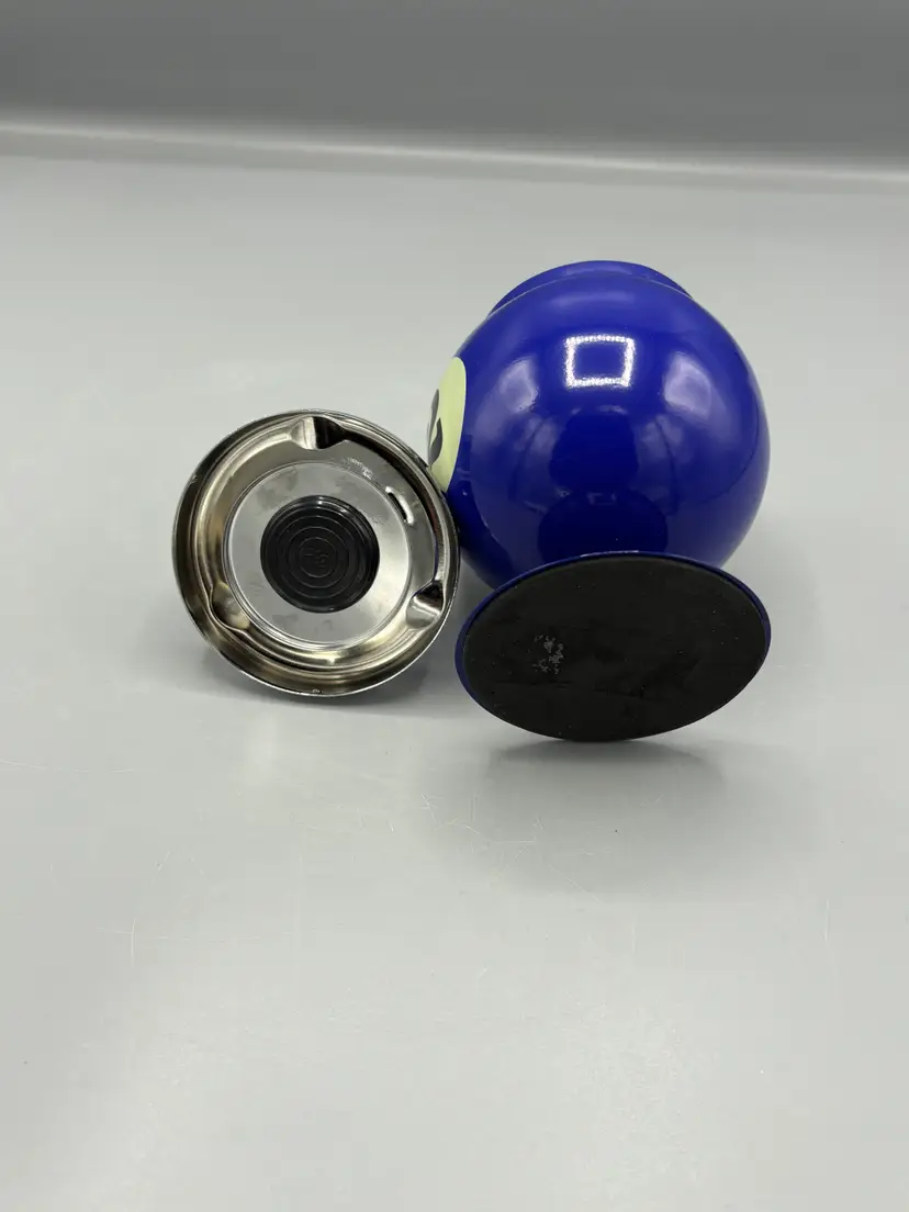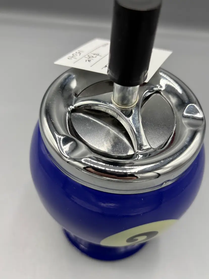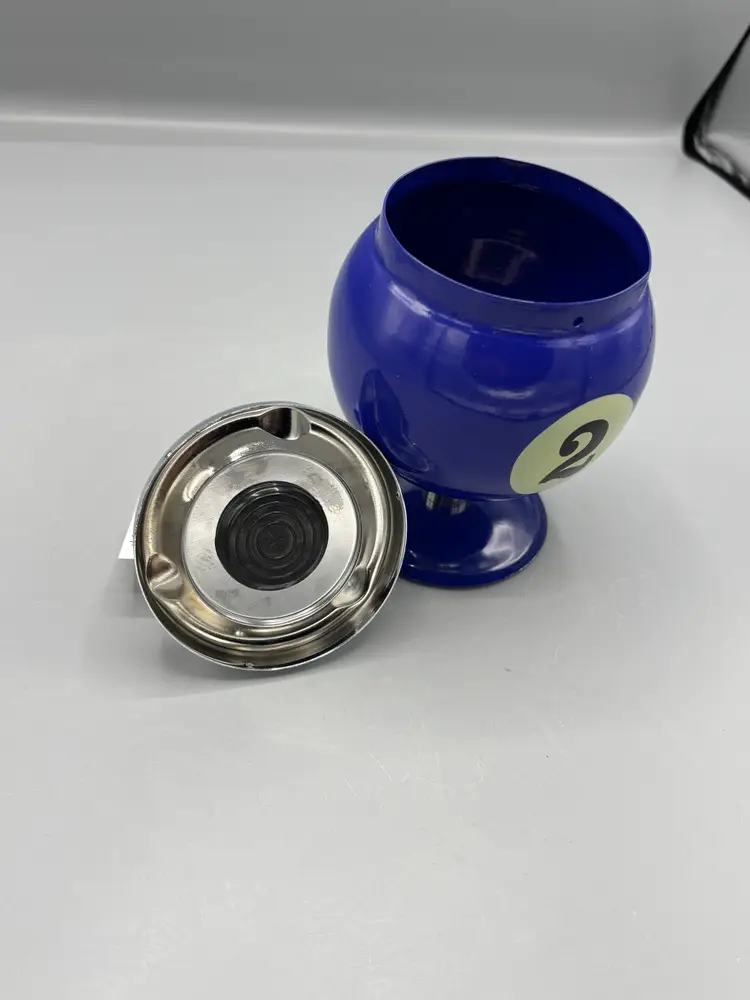 A distinctive vintage ashtray featuring classic pool ball imagery in striking blue tones. This collectible piece measures 4 by 7 inches, making it an ideal accent for retro enthusiasts and nostalgic décor collections. The sign-style design captures mid-century charm while serving as both functional tabletop accessory and conversation-starting display piece.