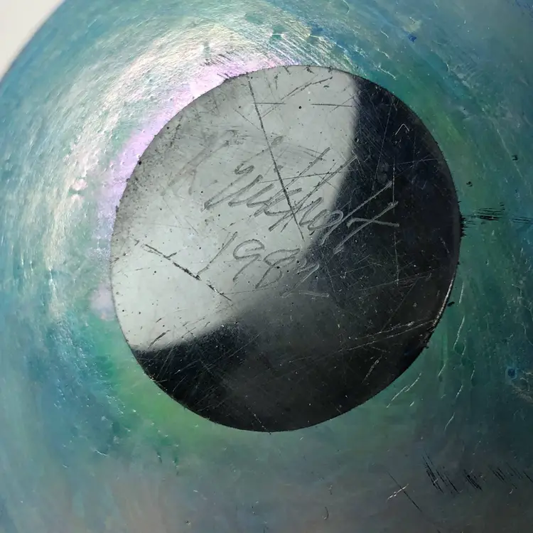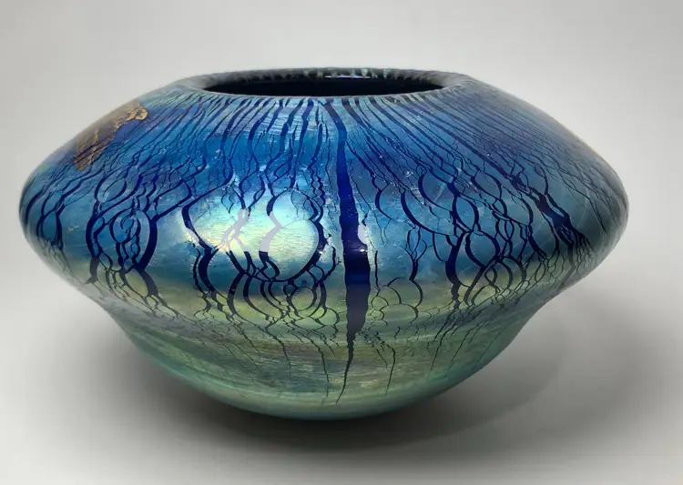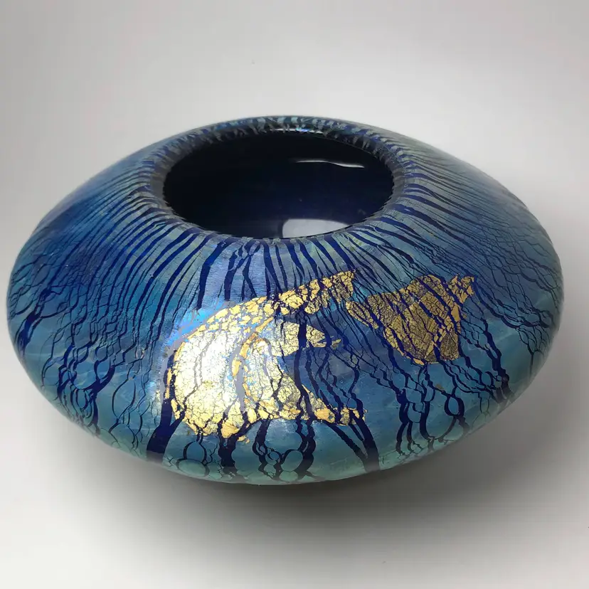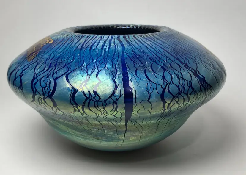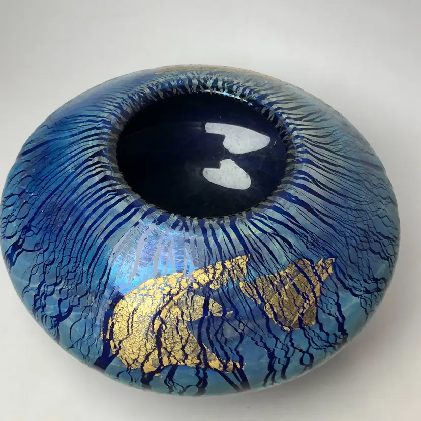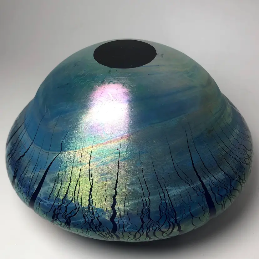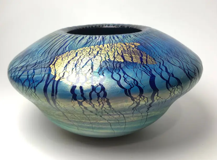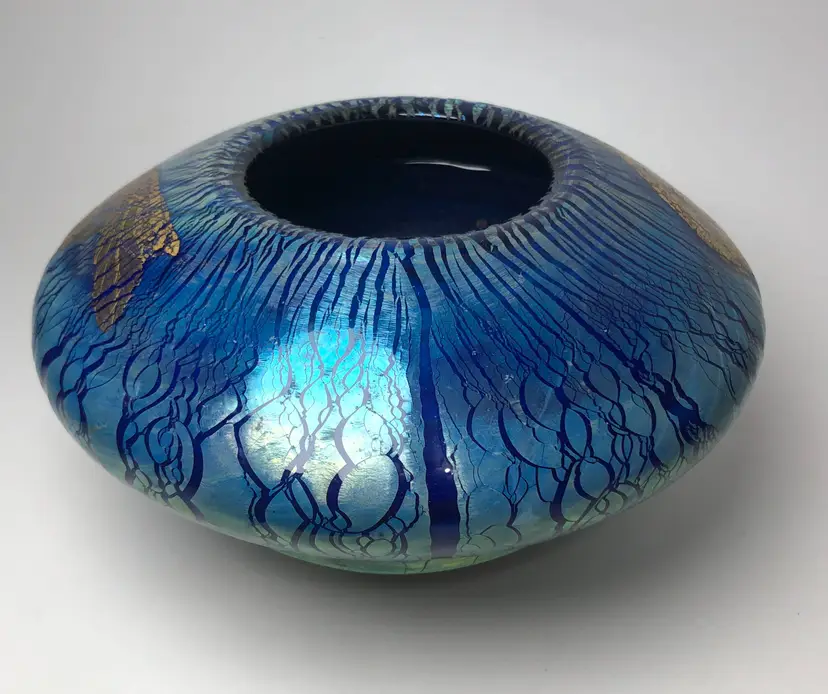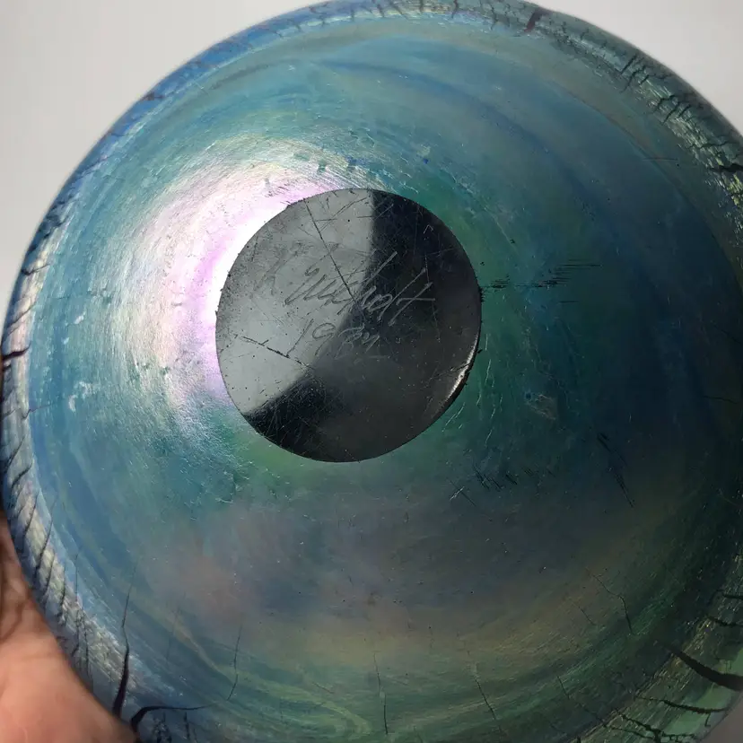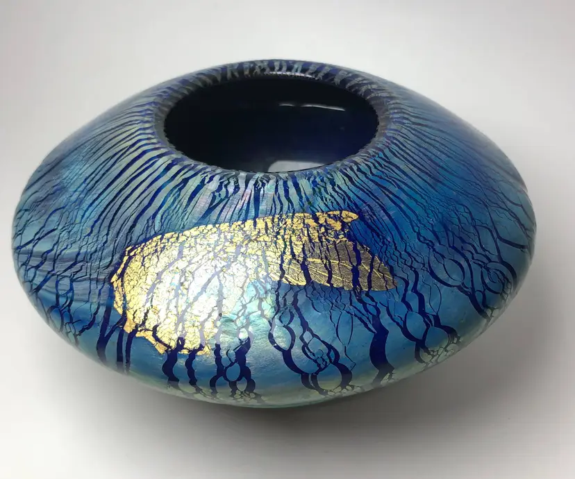 Vintage Signed Robert Eickholt Hand Blown Art Glass Volcano Vase Blue Green Iridescent Dichroic Gold Leaf UFO Shape 1982. No chips, no cracks. Great condition. 4.75" tall x 8" diameter x 3" diameter opening.