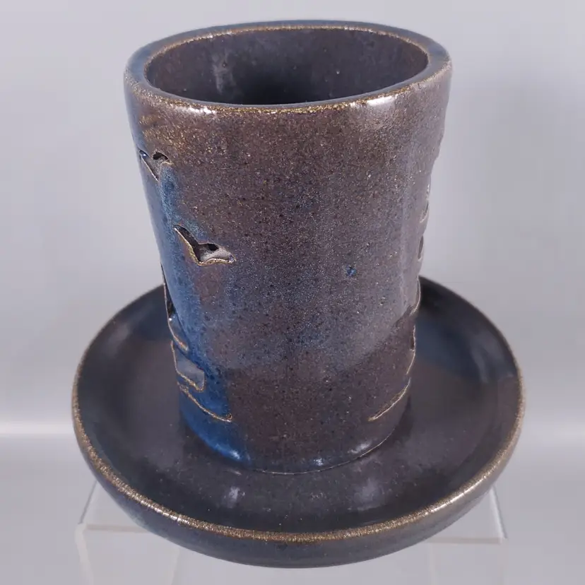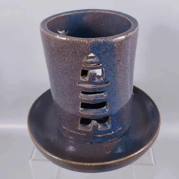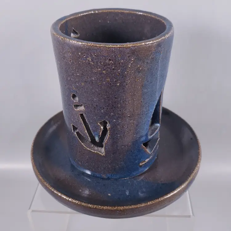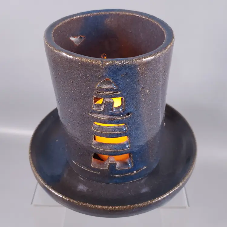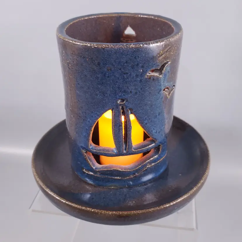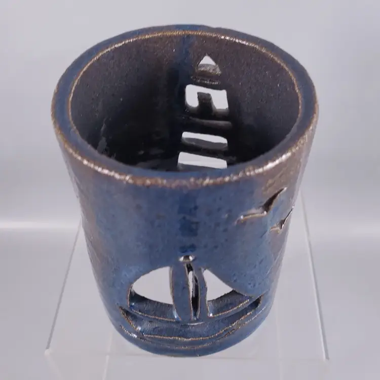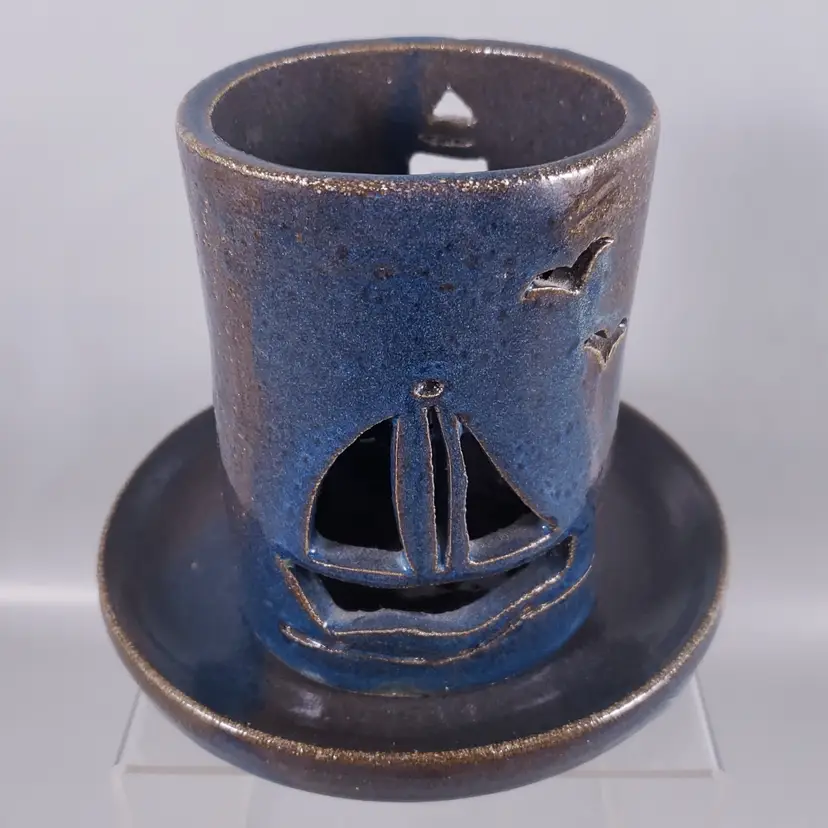 Vintage SIGNED STONEWARE ART POTTERY Sail Boat Lighthouse TEA LIGHT LUMINARY