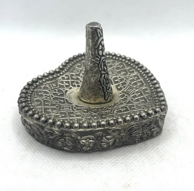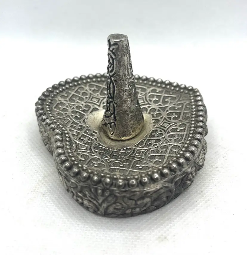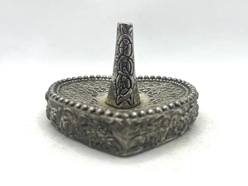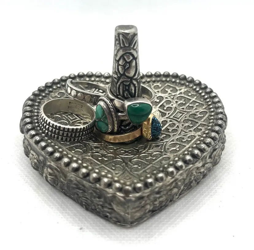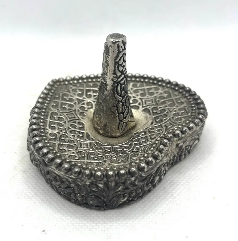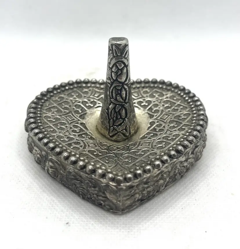 Vintage Silver Tone Metal Heart Ring Holder, Tree, Dish, Trinket Tray. 2.5” tall x 3.25” x 3”. Minor surface wear and aged patina. Felt bottom.