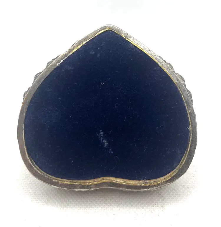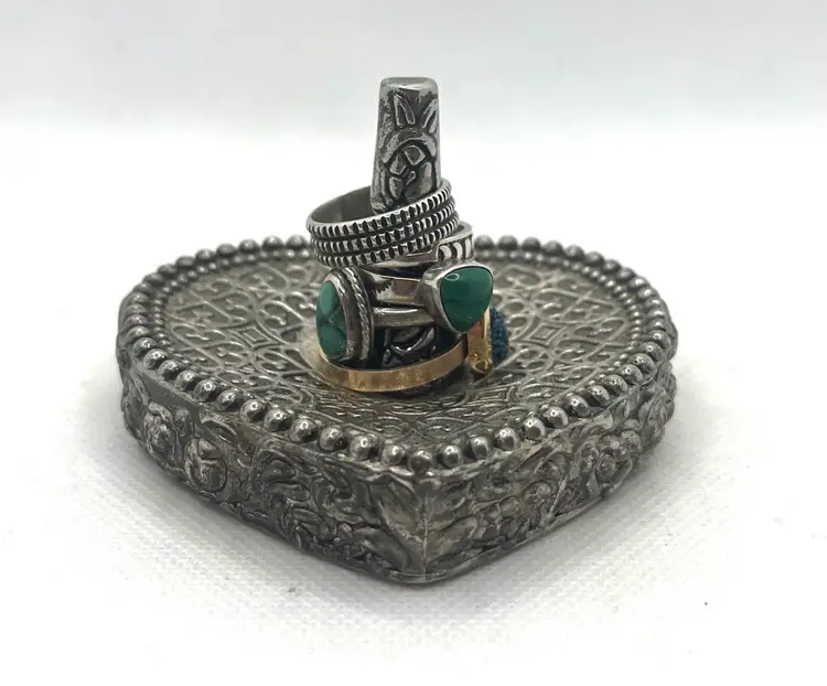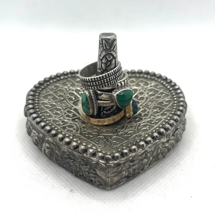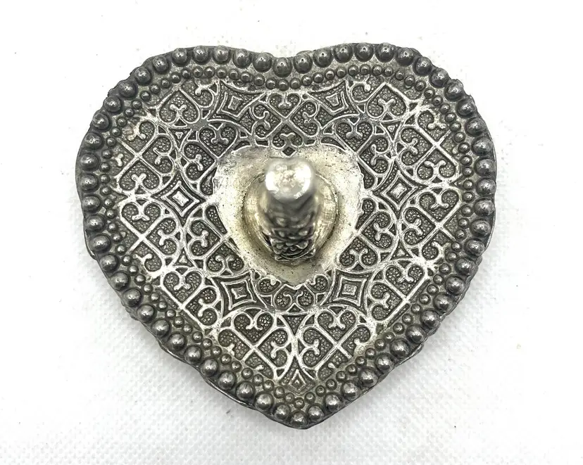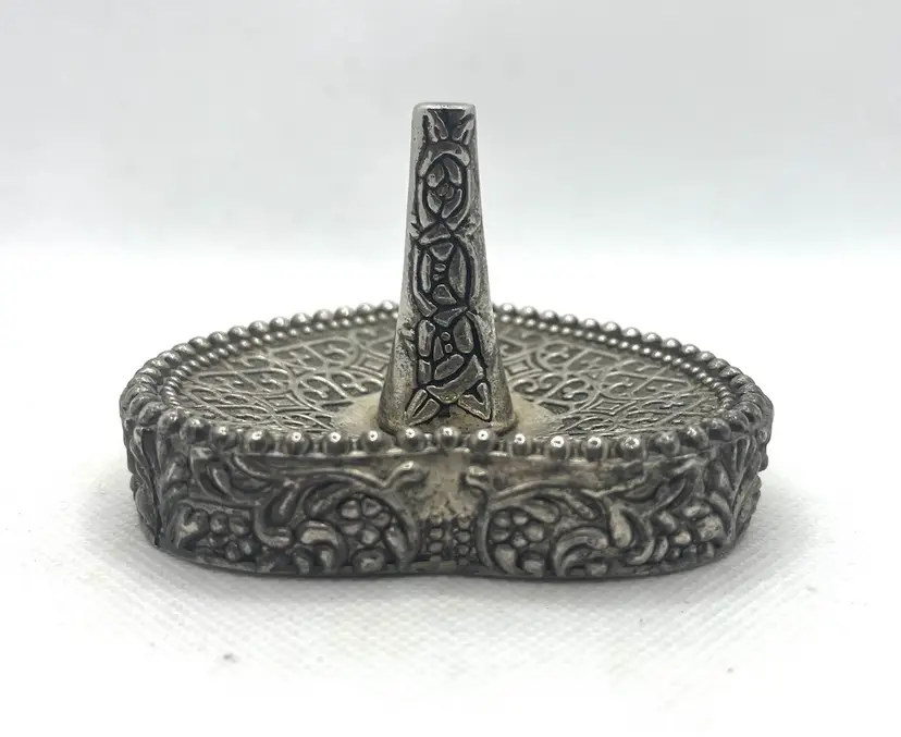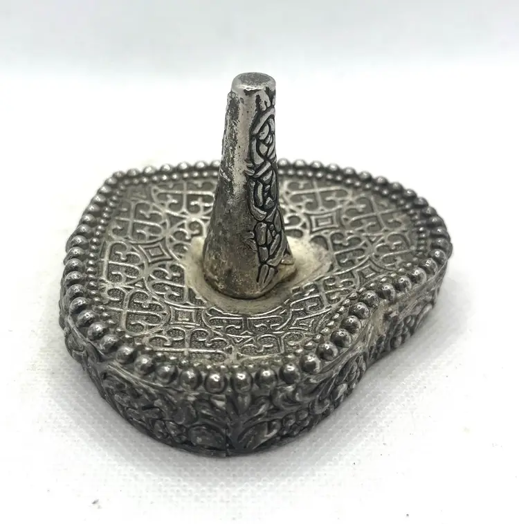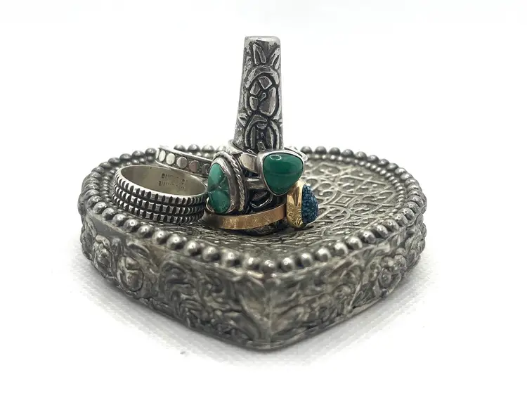 Vintage Silver Tone Metal Heart Ring Holder, Tree, Dish, Trinket Tray. 2.5” tall x 3.25” x 3”. Minor surface wear and aged patina. Felt bottom.