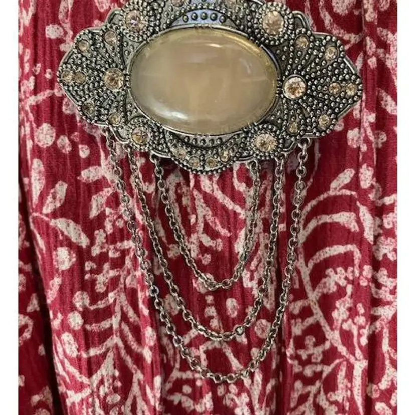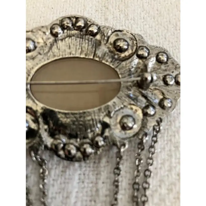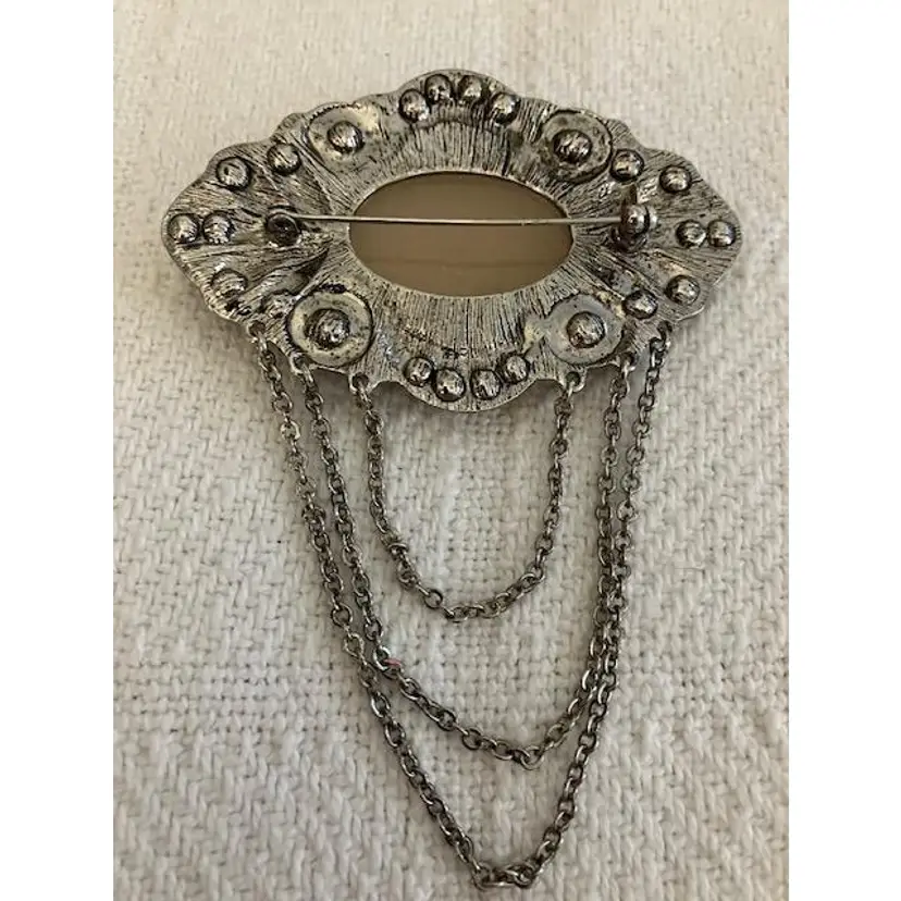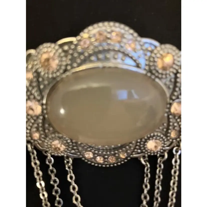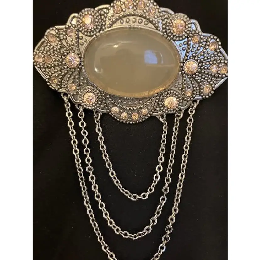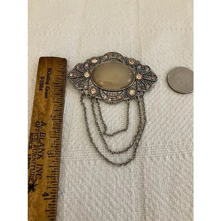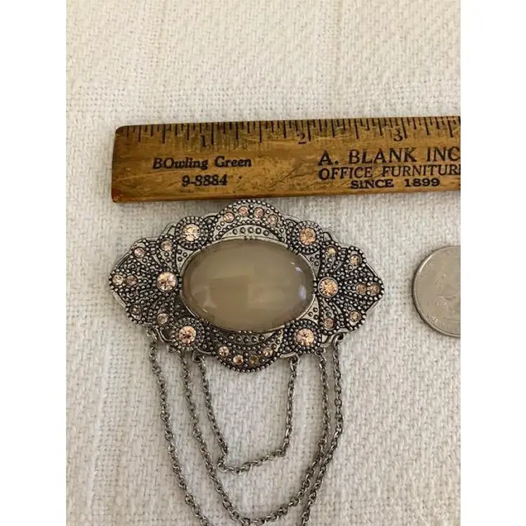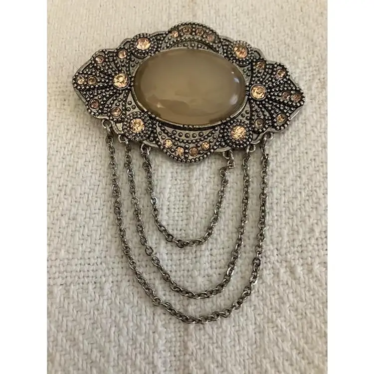 Silver tone, pink rhinestones, translucent oval center. Three articulated chains hang from the bottom. Rollover clasp.