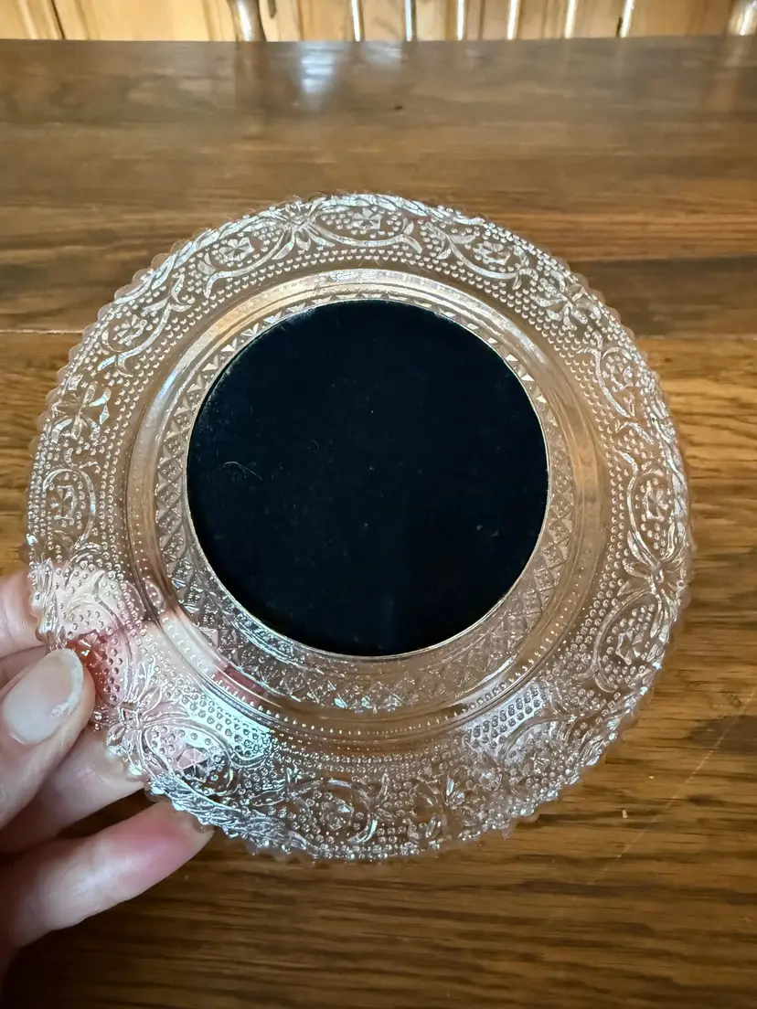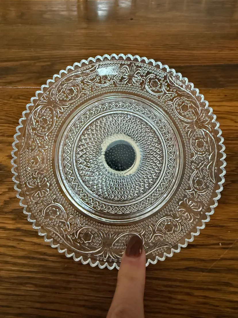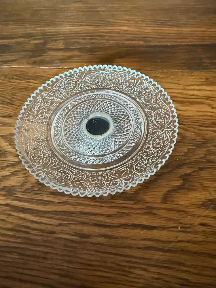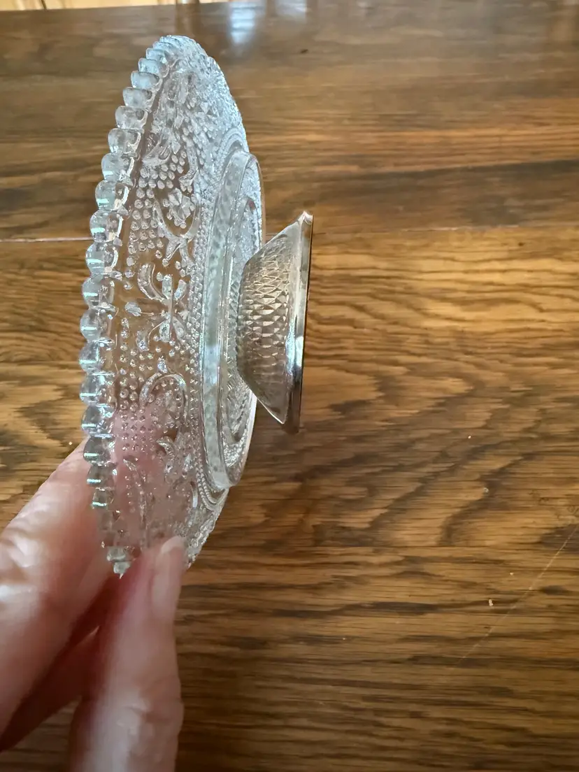 Details: 6" diameter × approx. 2.5" tall Clear pressed glass top with ornate floral and diamond design Silverplated pedestal base Excellent vintage condition, box shows light wear Free shipping from Paige’s Plates