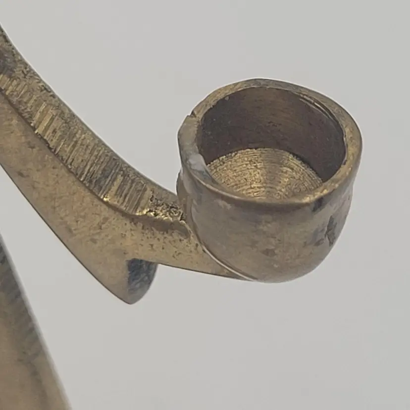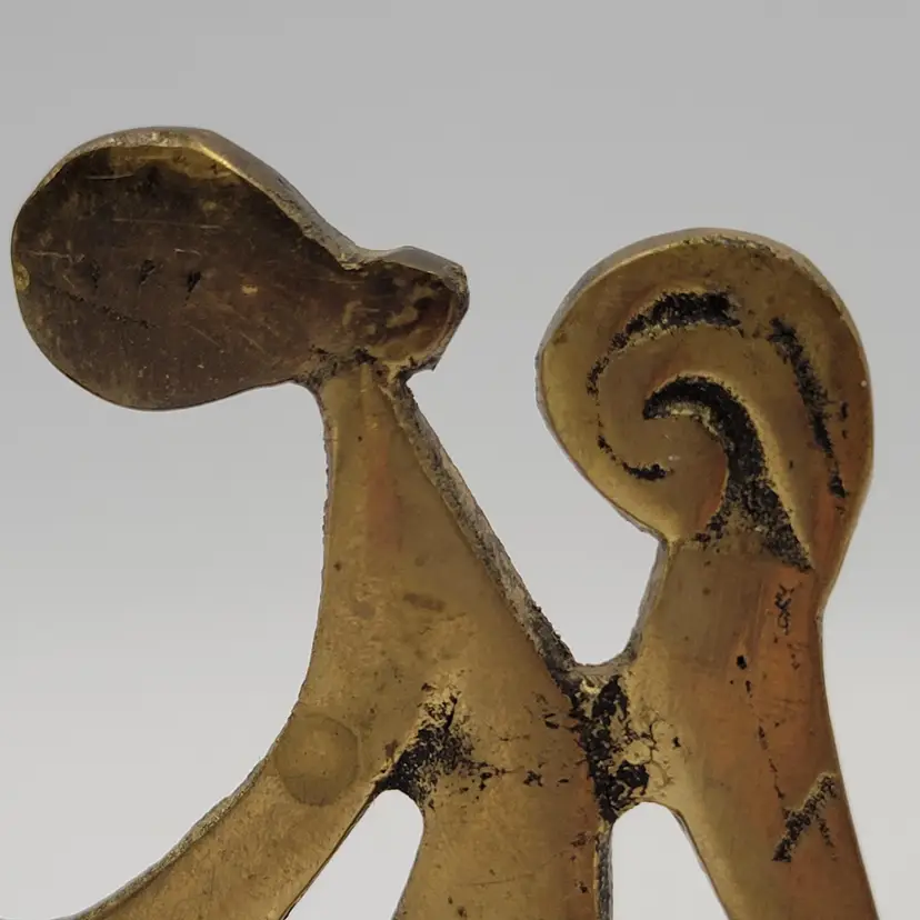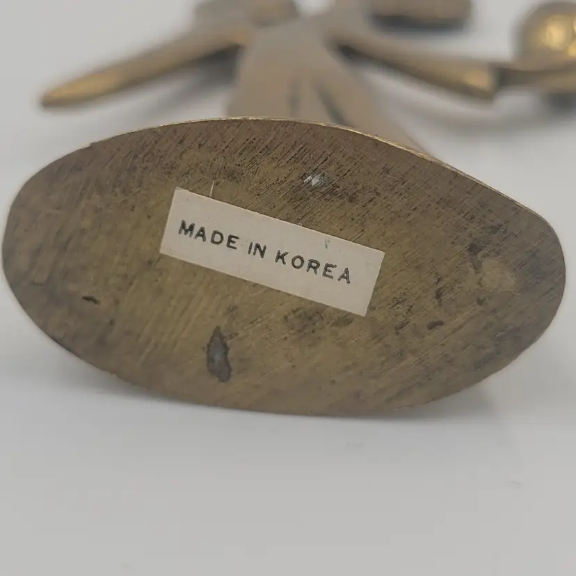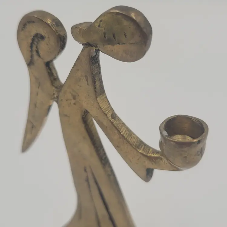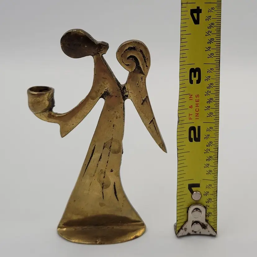 This little brass angel candle holder will hold a small little candle. She was made in Korea and has the original sticker on the bottom (see photos). She measures about 3.50" tall and 2 25" wide. She has some wear and spots on the brass (see photos).