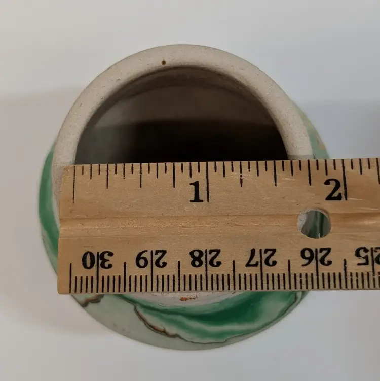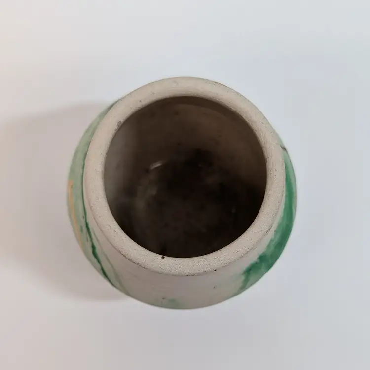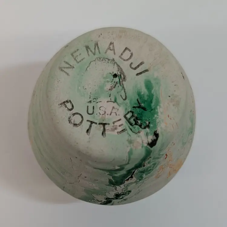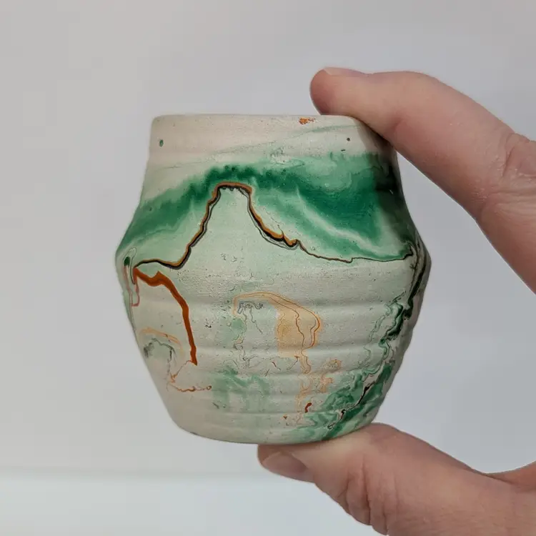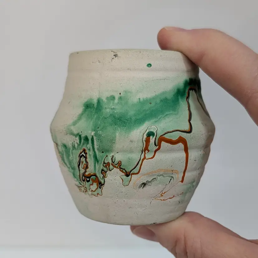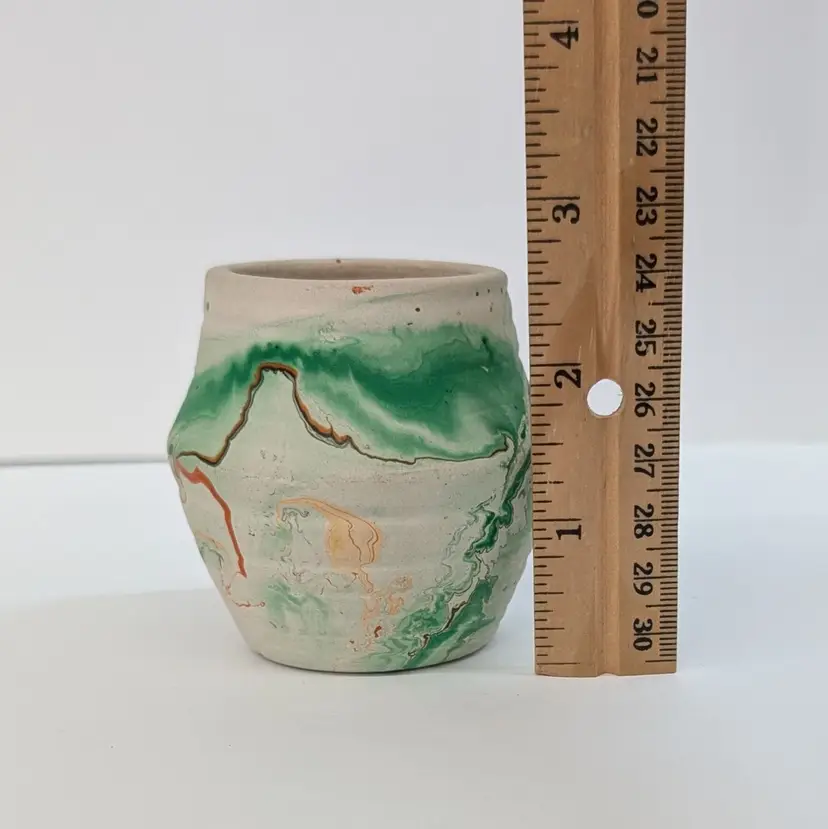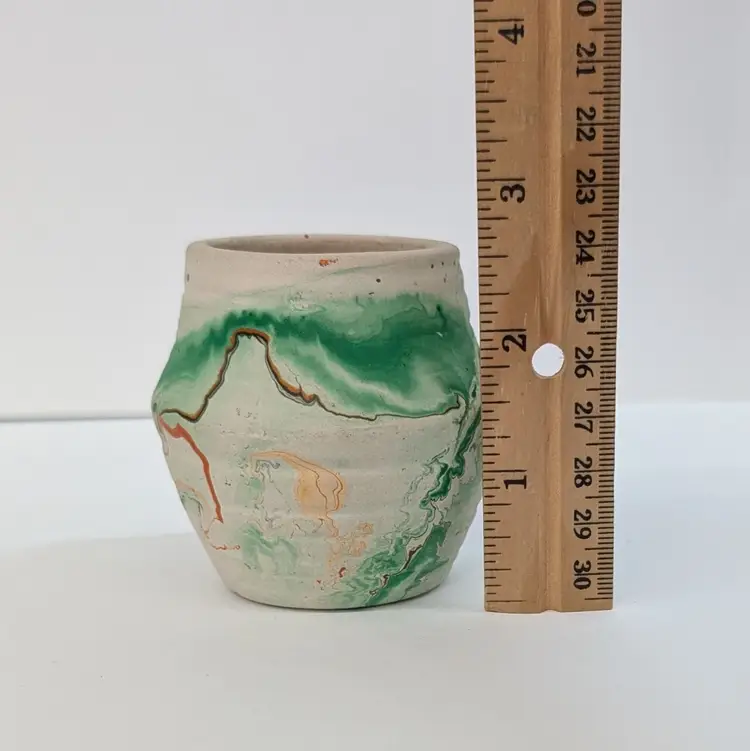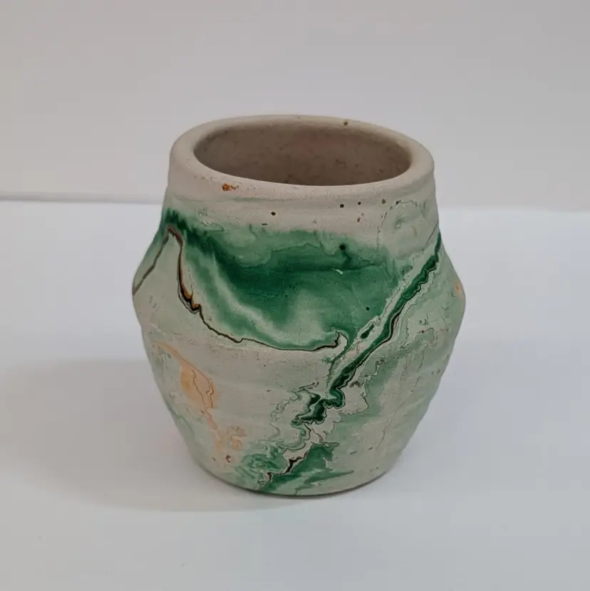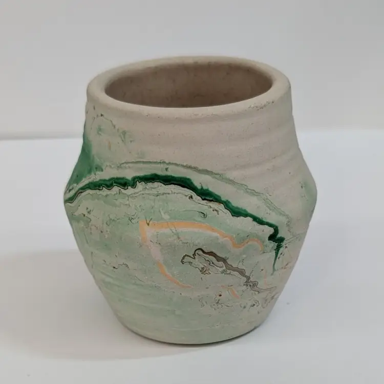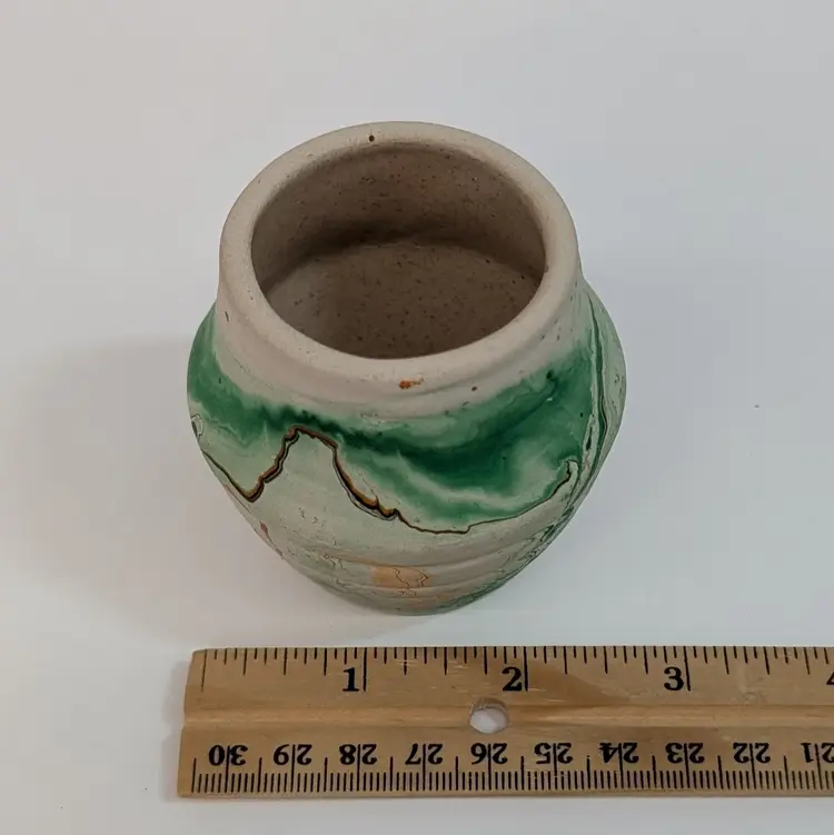 Cute, little clay art pottery vase form Nemadji with a green, orange and brown swirl. In nice, used condition with minimal wear and scuffs. Measurements ~ 2.5 x 2.5"