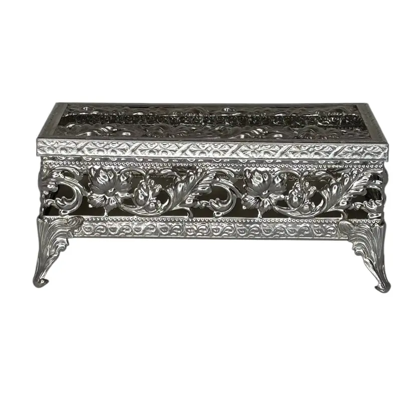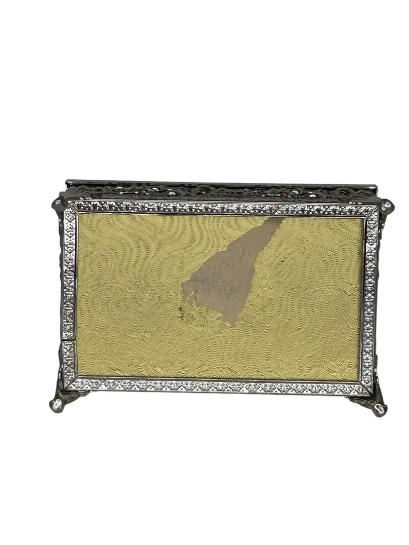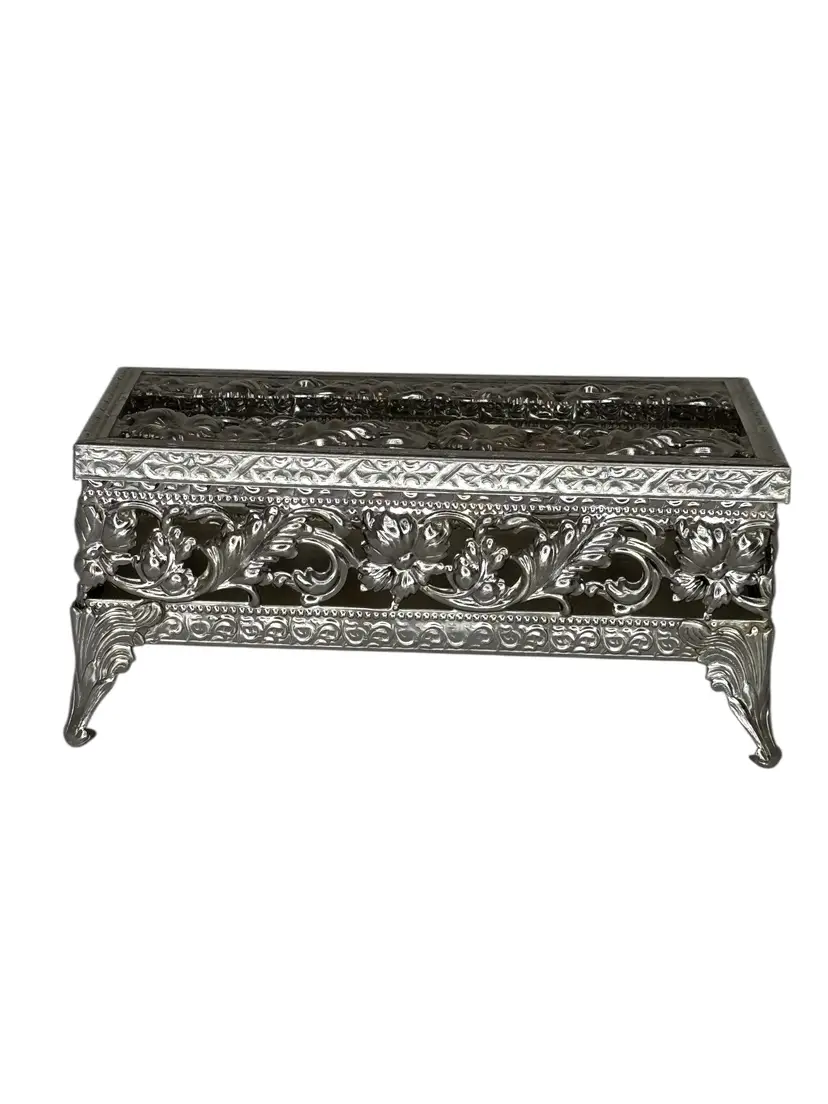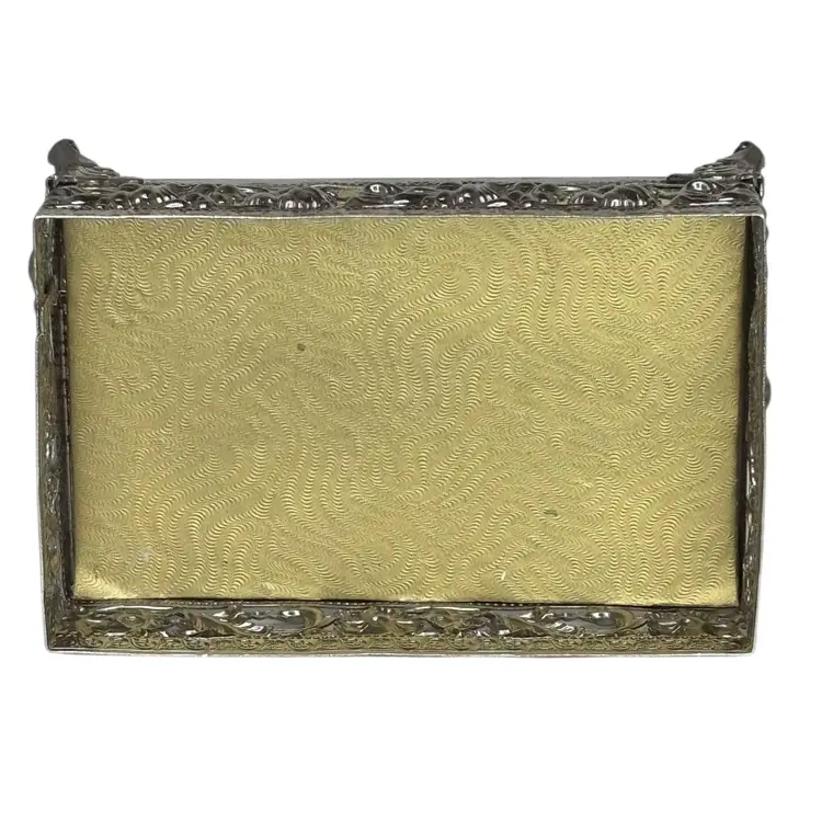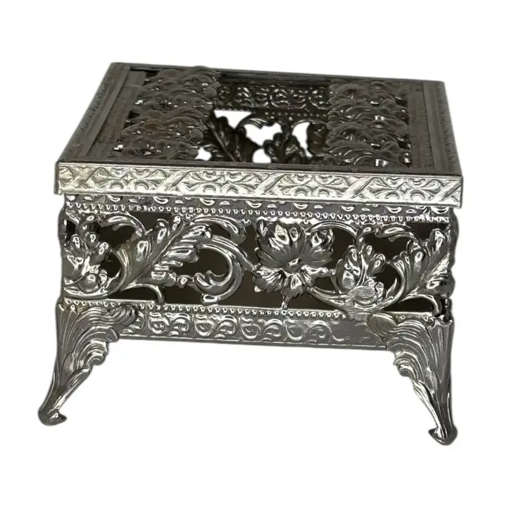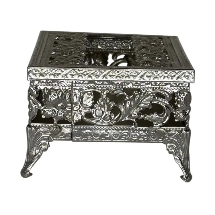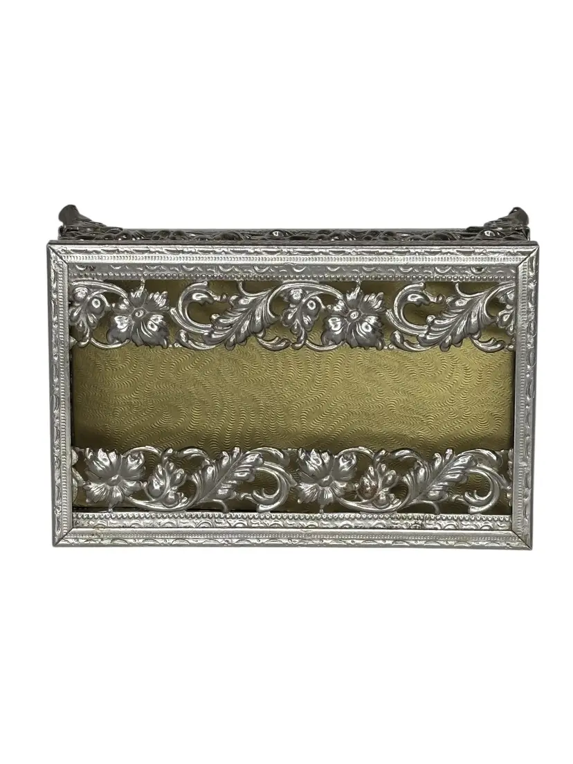 This tissue box cover measures approximately 4 1/2" L x 2 7/8" W x 2" H. It is for purse size tissues. It is a silver toned metal and has a flower and leaf pattern. It is footed. The bottom of the box is a gold cardboard and is removable. The box has some wear but is in overall nice condition. Please see photos for condition, and feel free to contact me with any questions. Thank you.