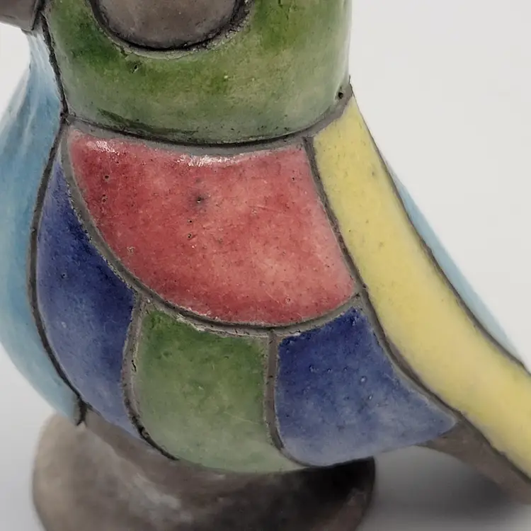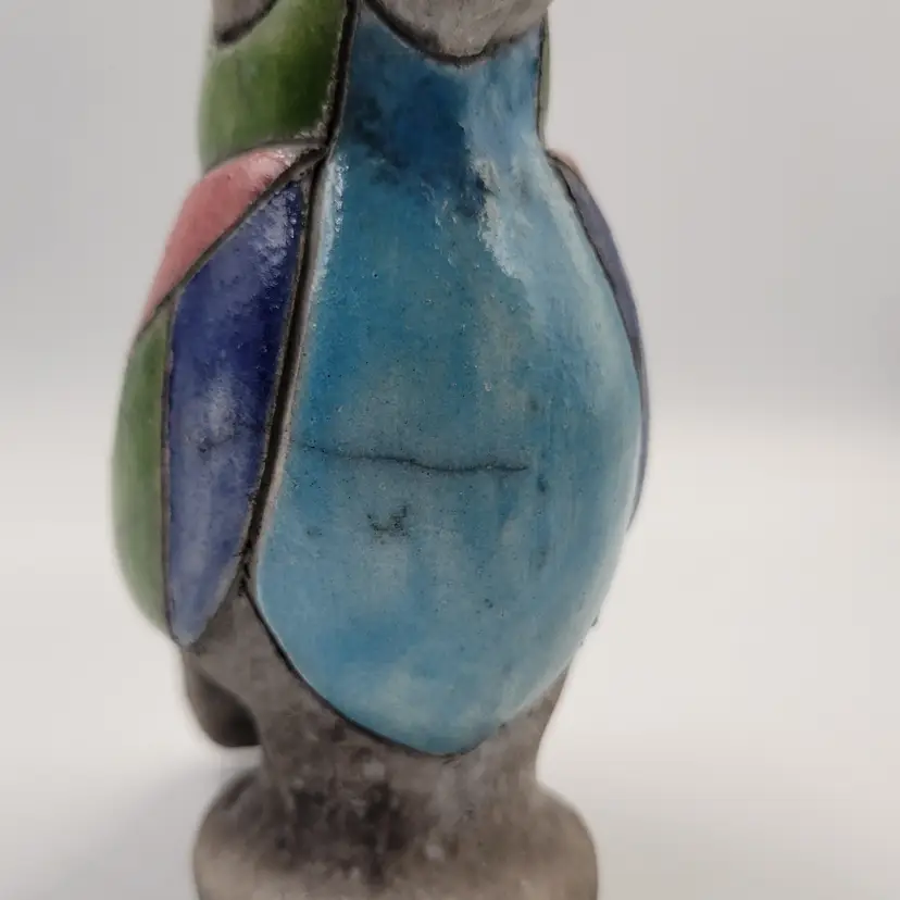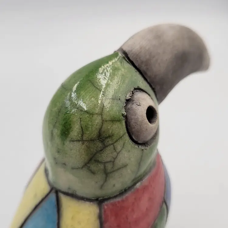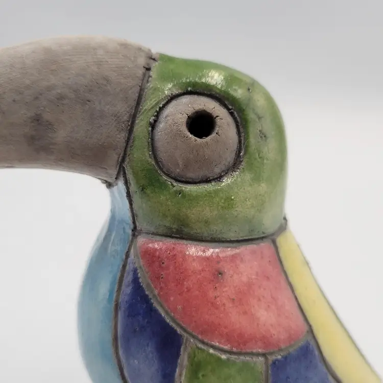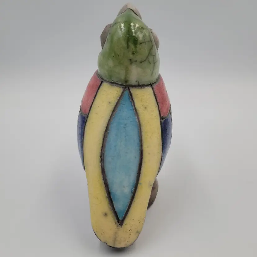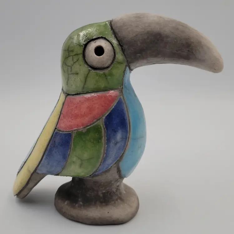 This colorful pottery toucan was made in South Africa. This pottery is Raku pottery. The toucan has green, yellow, red, blue and light blue glaze and the beak, eyes and base are dark gray raku. Raku pottery has cracks that a present in the color glazed areas. You'll find those cracks in different places on 4he bird. This piece measures about 5.75 inches tall. There are no chips in this pottery piece