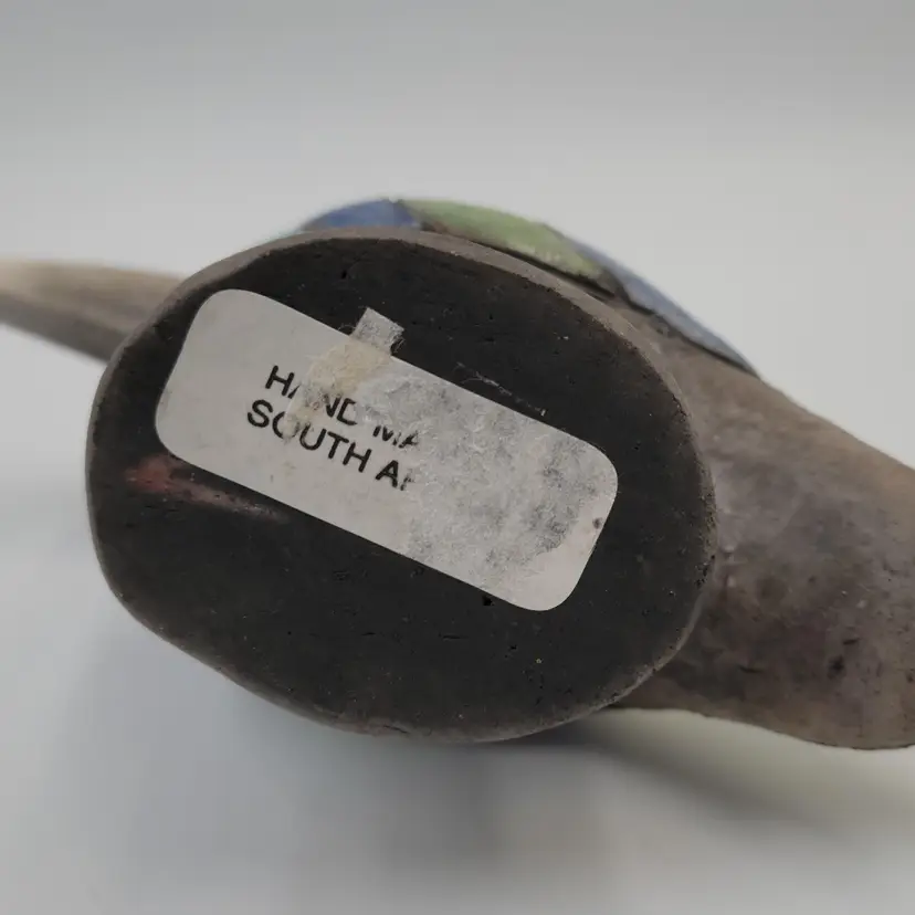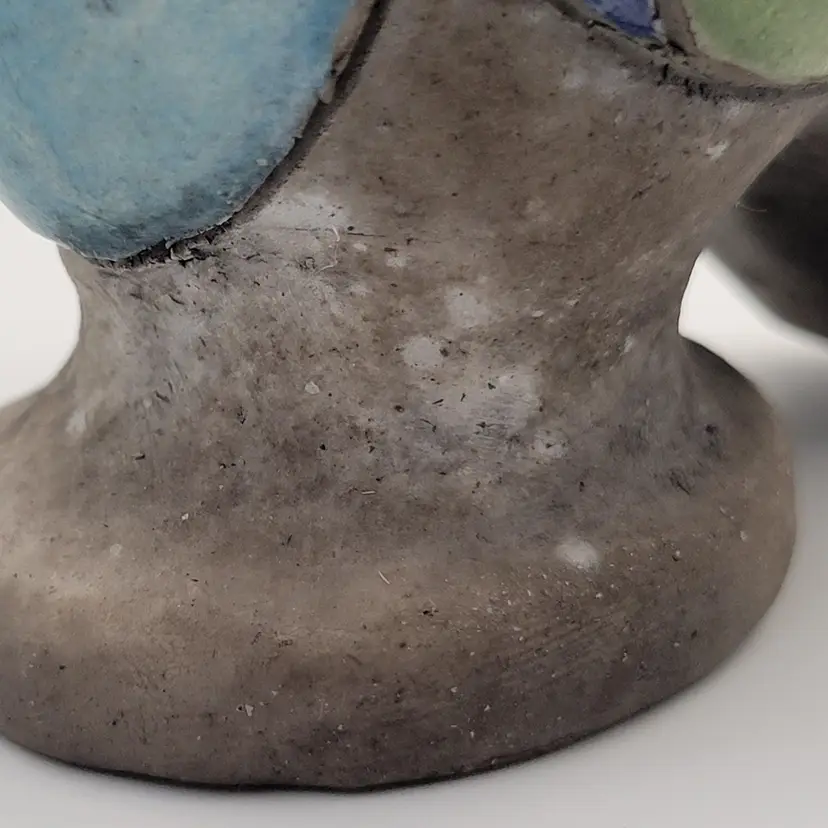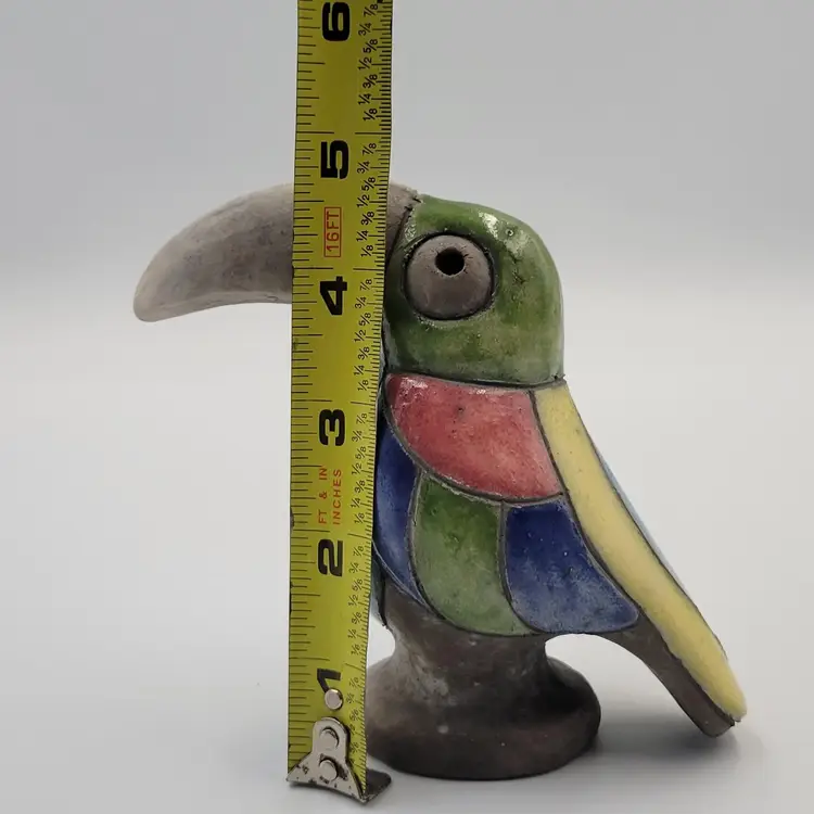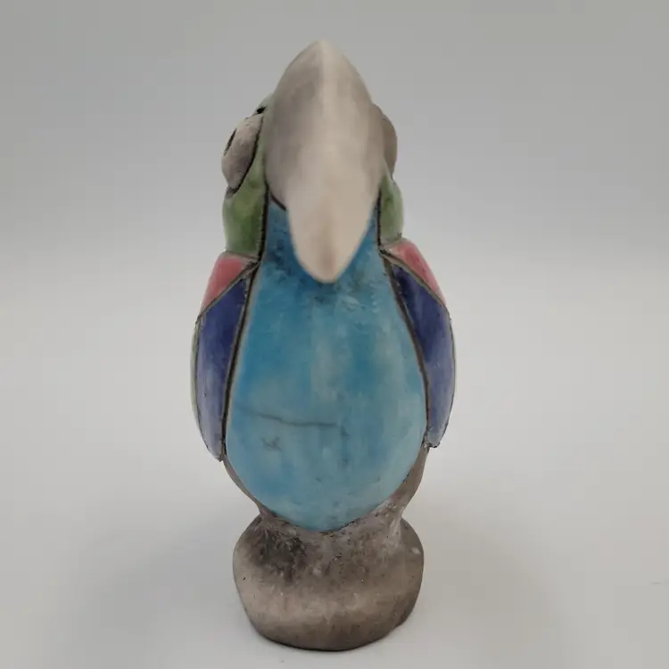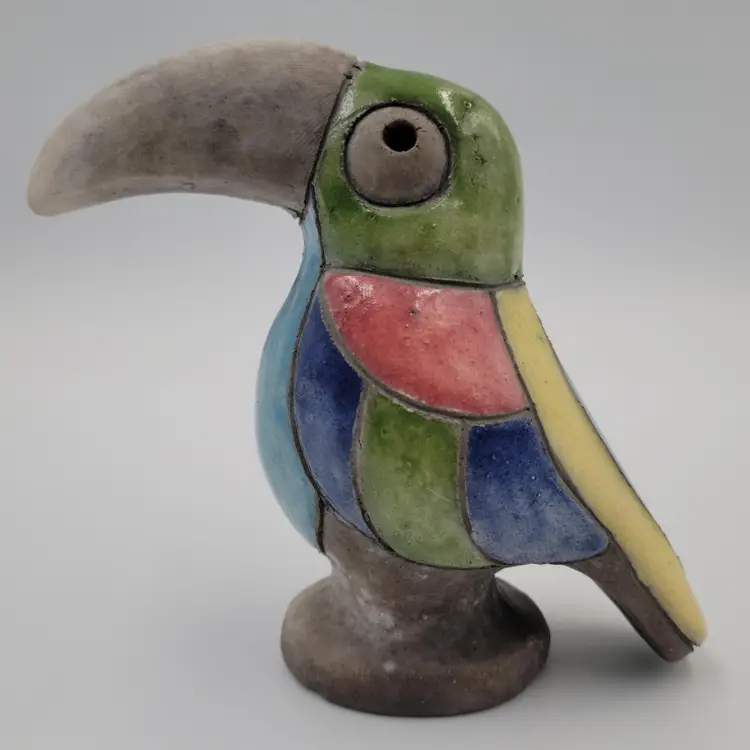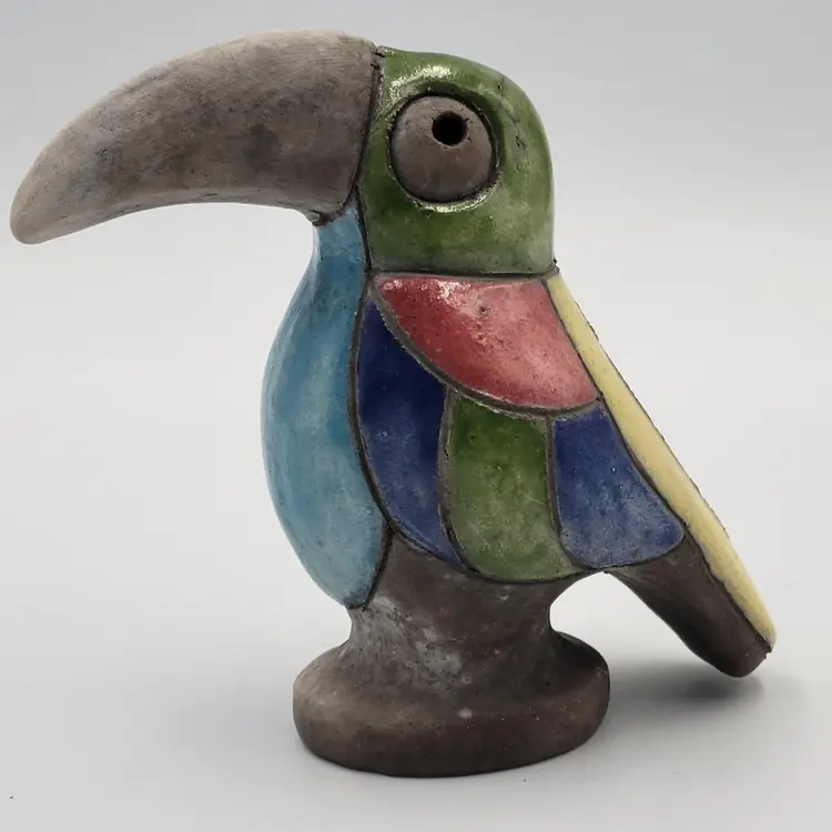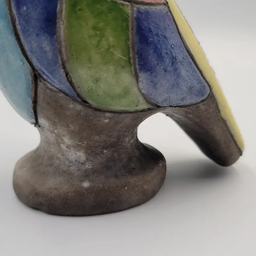 This colorful pottery toucan was made in South Africa. This pottery is Raku pottery. The toucan has green, yellow, red, blue and light blue glaze and the beak, eyes and base are dark gray raku. Raku pottery has cracks that a present in the color glazed areas. You'll find those cracks in different places on 4he bird. This piece measures about 5.75 inches tall. There are no chips in this pottery piece