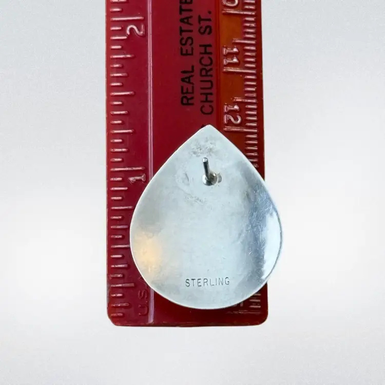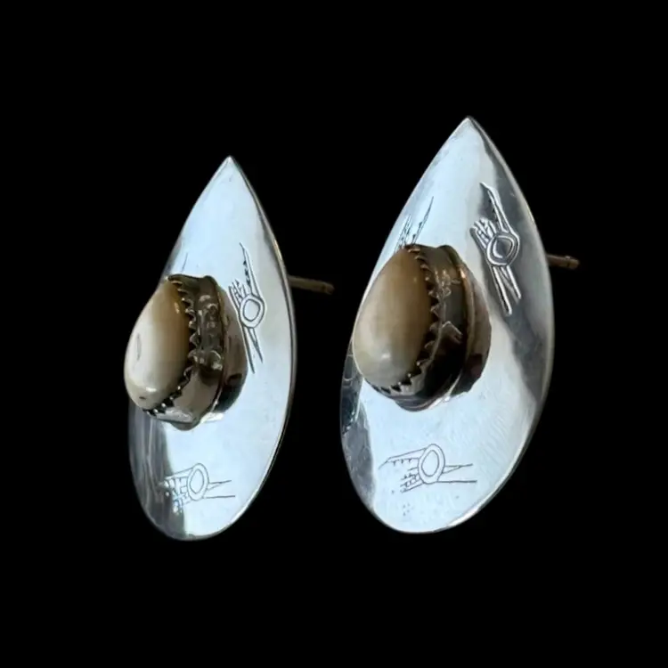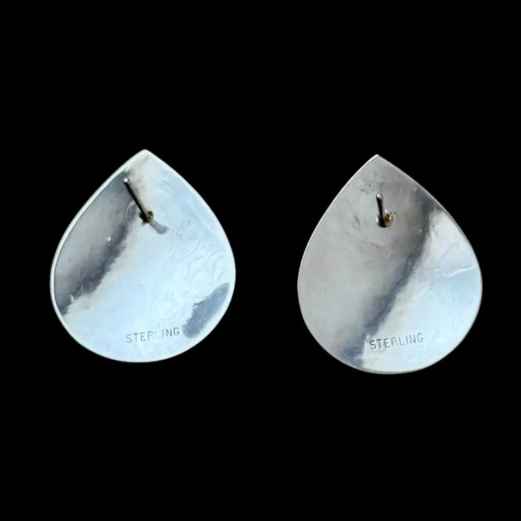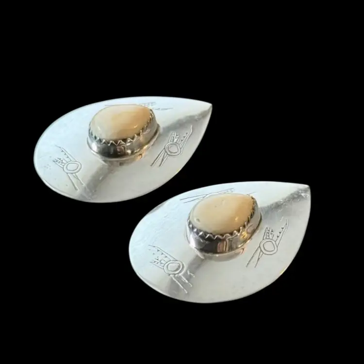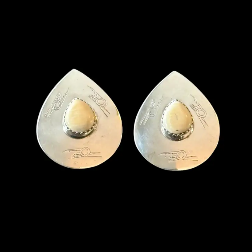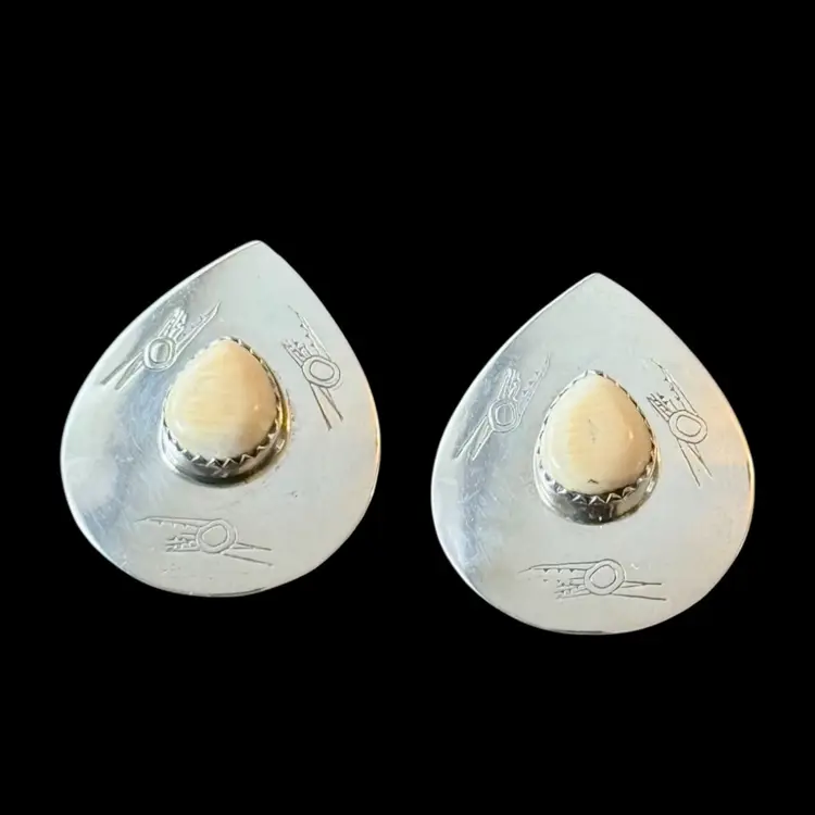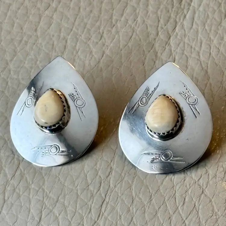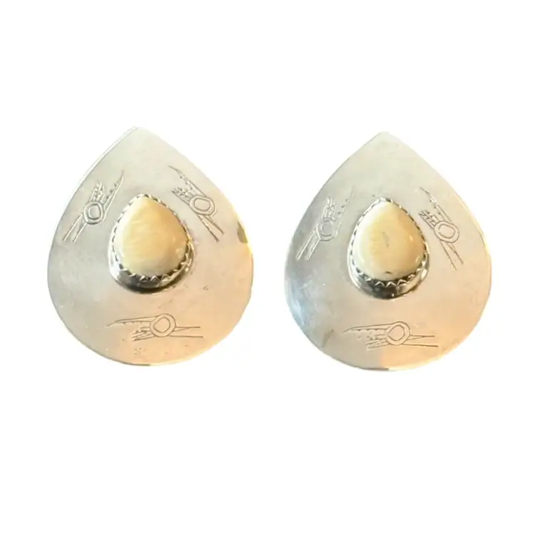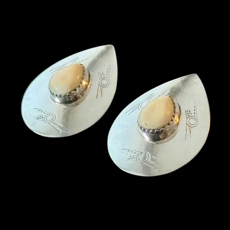Beautiful vintage Southwest design sterling earrings featuring a white teardrop center stone surrounded by petroglyph indigenous bird stamped motif. Very unique measuring 1.25” from top to bottom they are stamped Sterling on reverse side and jeweler test positive for sterling silver.