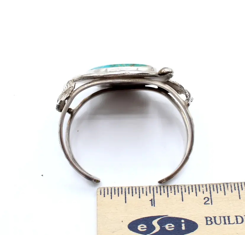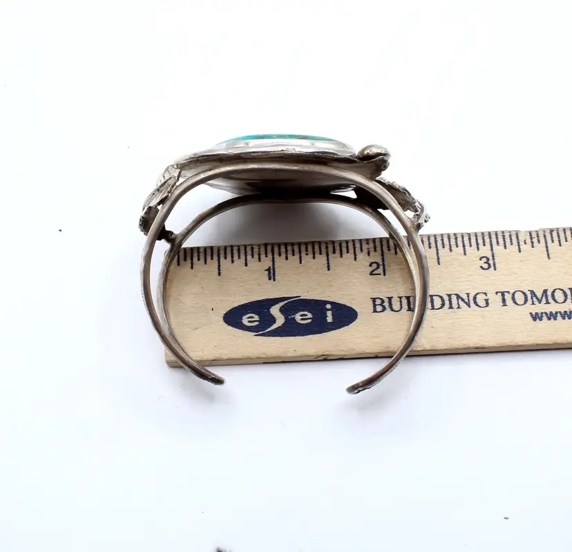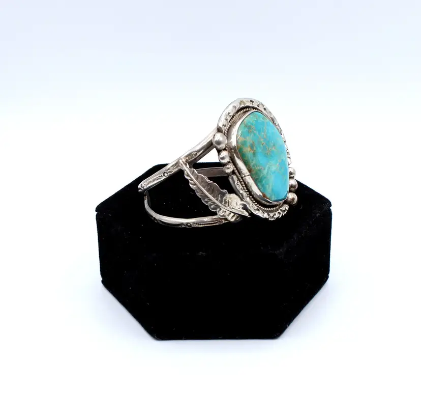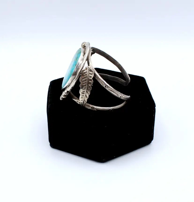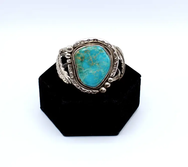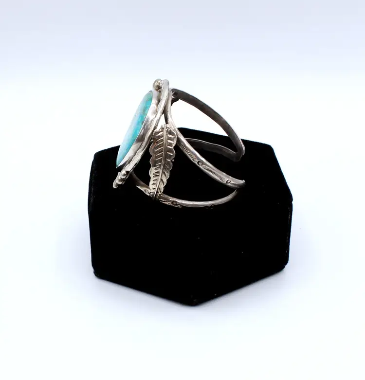 Nice unsigned large stone turquoise bracelet. The beautiful matrix stone is set in a smooth bezel and adorned with twisted wire and a hand stamped gallery with large dot accents. Set on a two rail wire cuff adorned with leaves/feathers on sides. Inner diameter 5.75", gap 1', 2' wide.