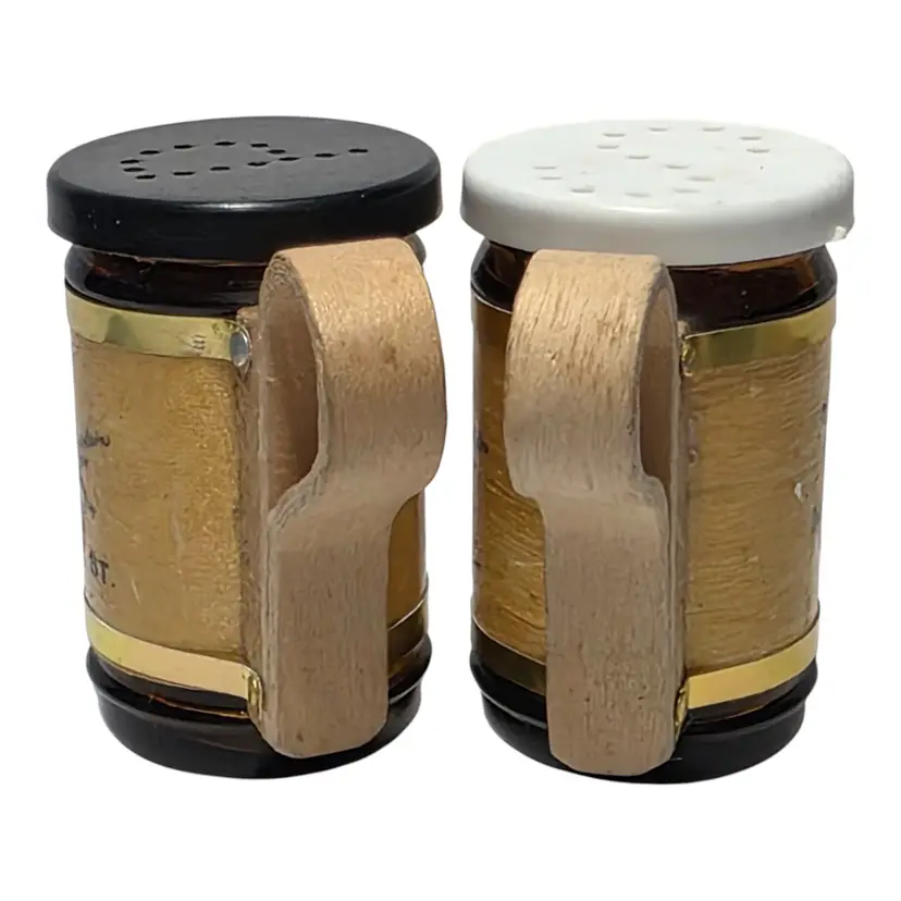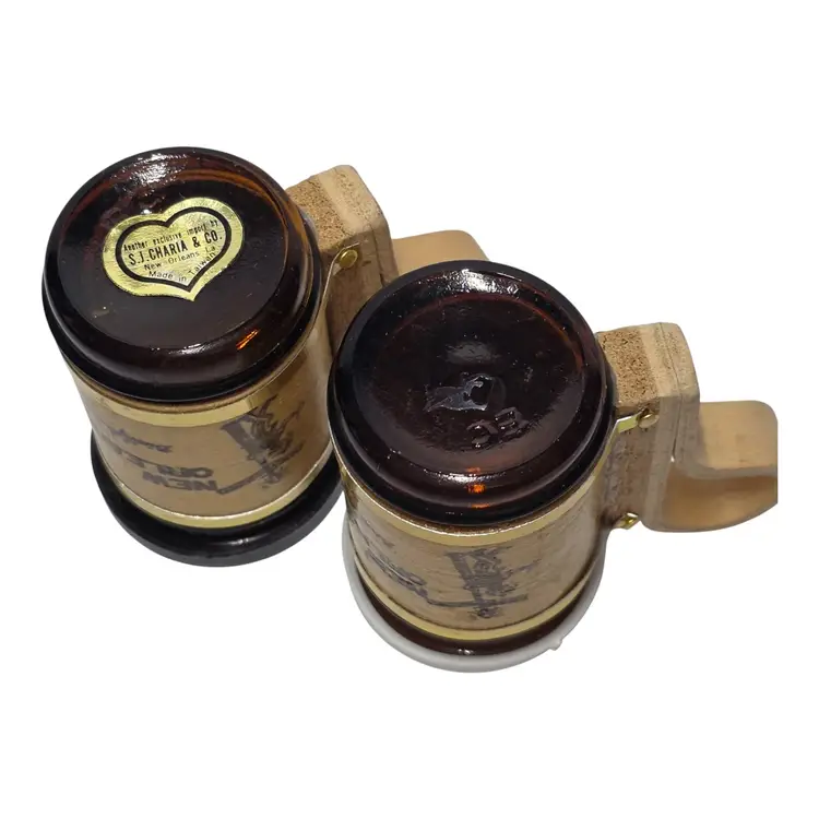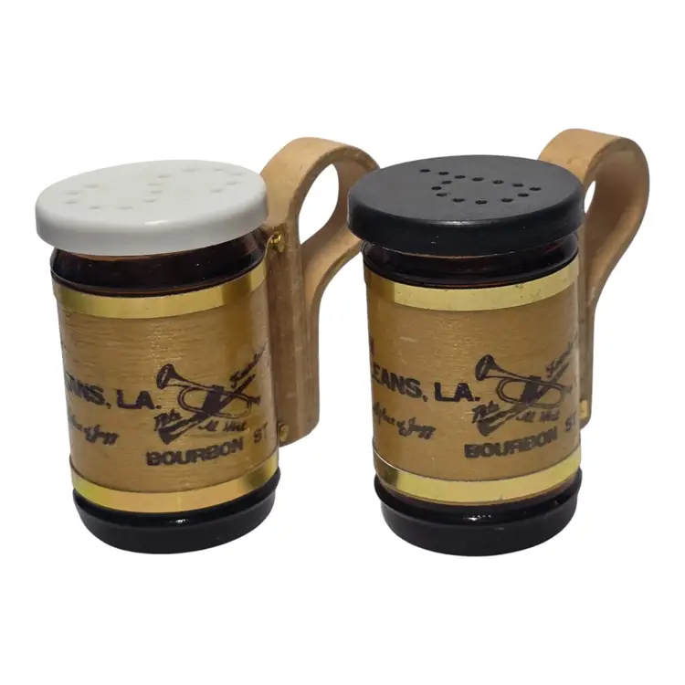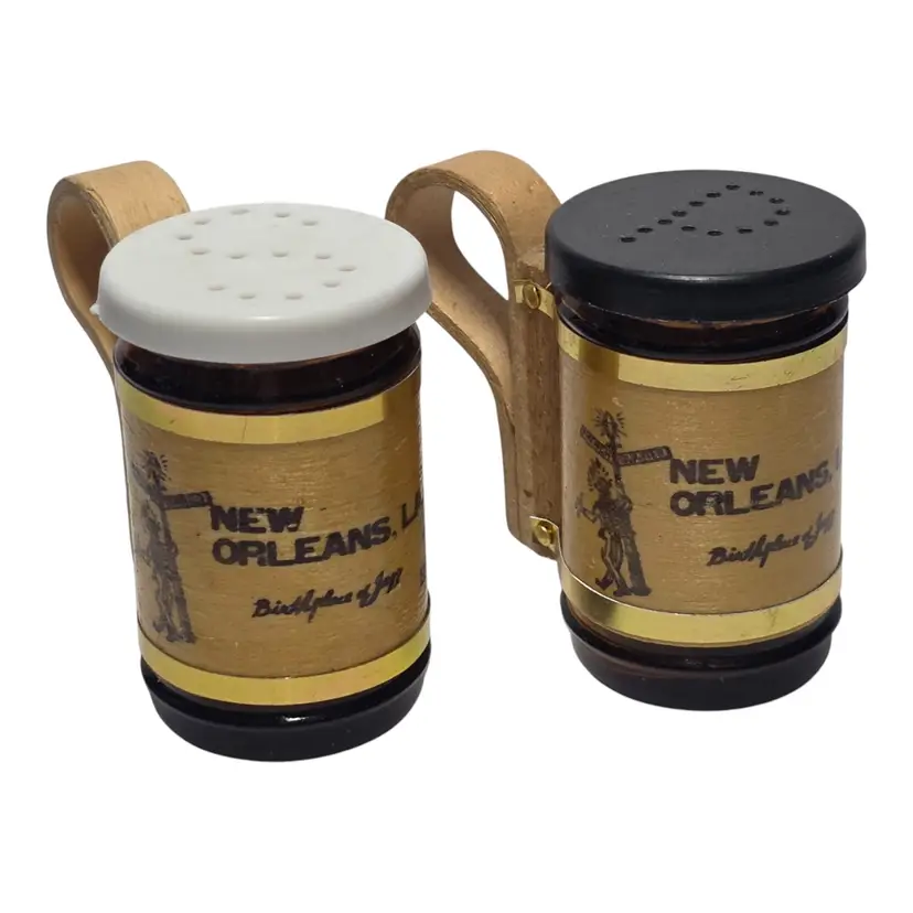 Add a touch of nostalgia to your dining table with these vintage New Orleans souvenir salt and pepper shakers, shaped like charming brown glass beer barrels. Perfect for collectors or as a unique gift.