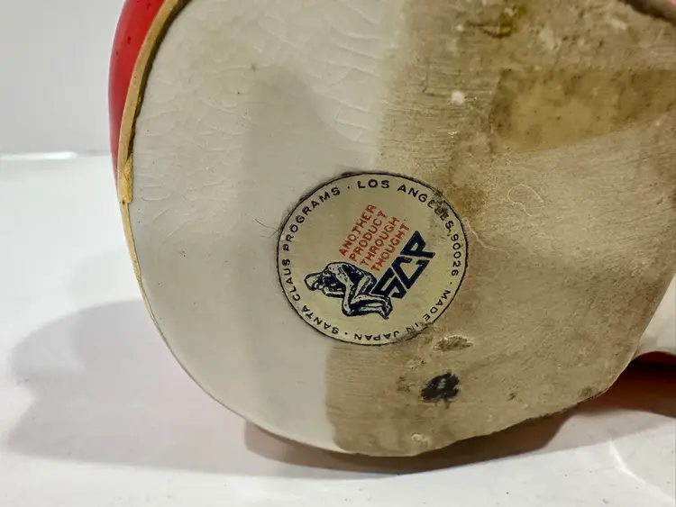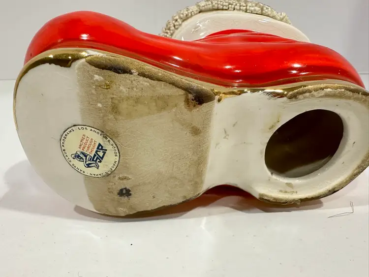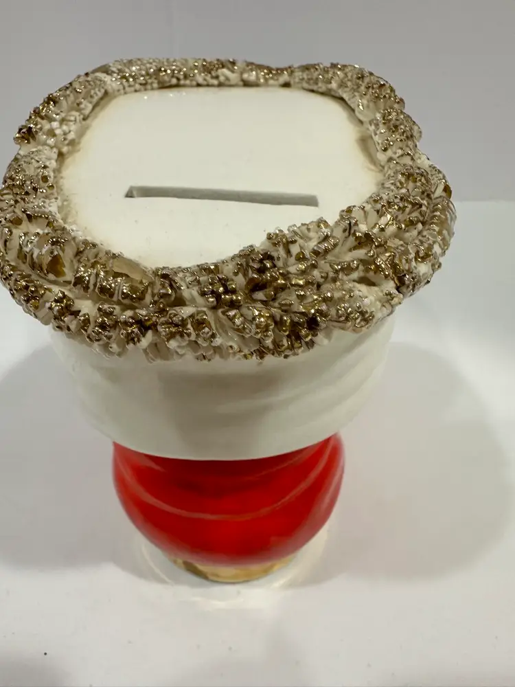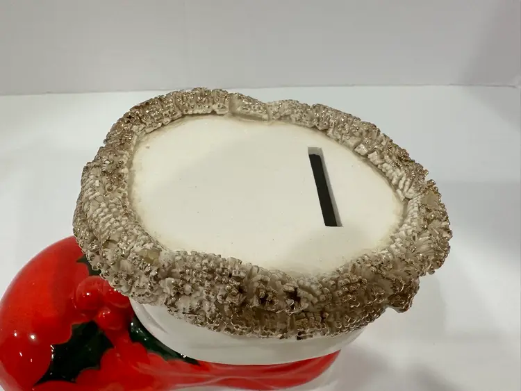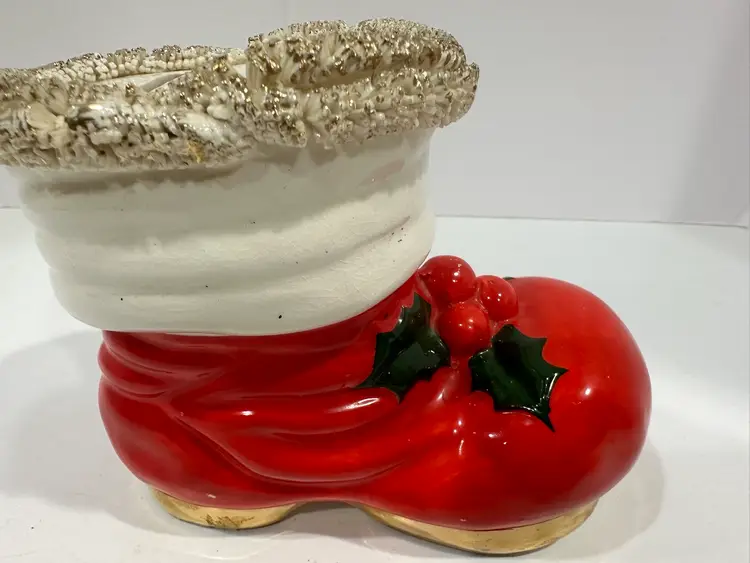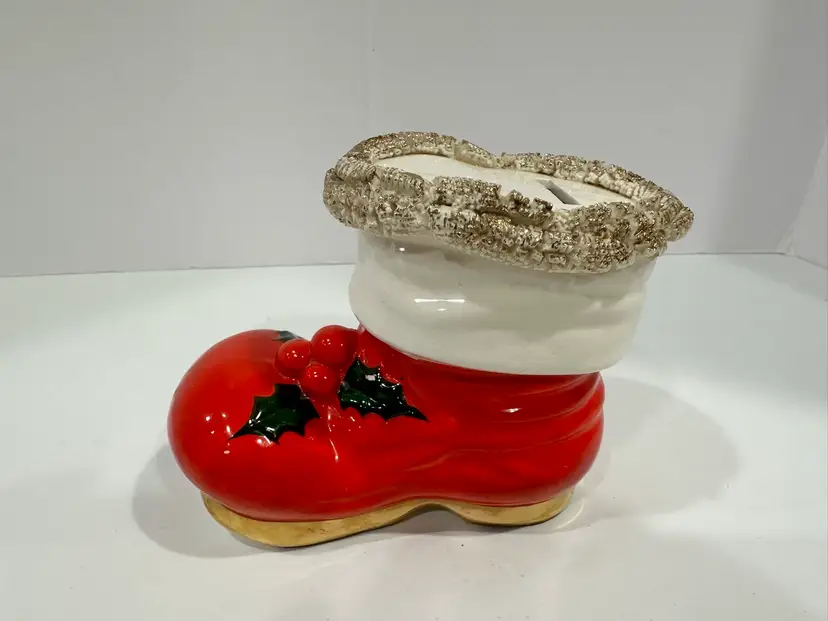1950-60's Vintage Santa's Boot Ceramic Coin Bank-Santal Prod.- 5" x 6" Spaghetti Trim Christmas Decor Gold Trim Sole Holly Accent Decor.