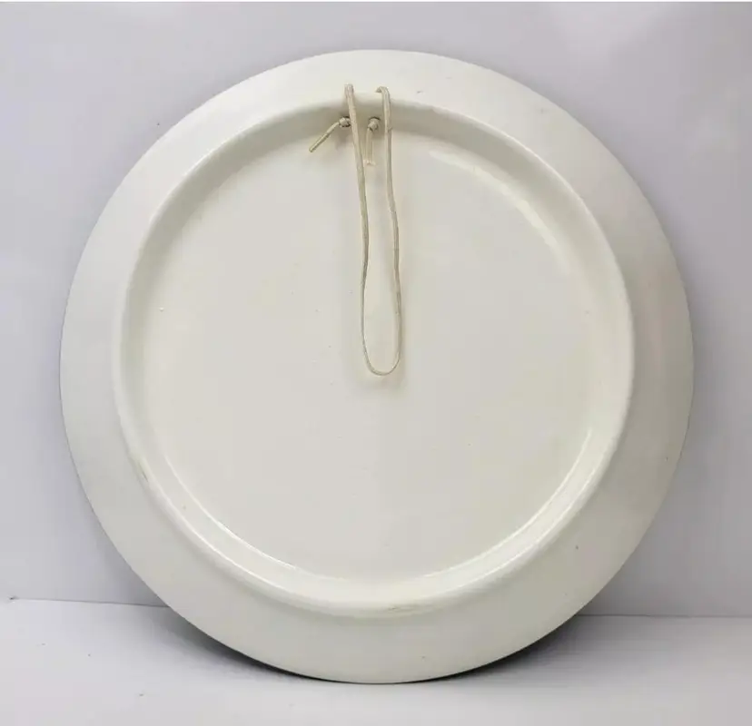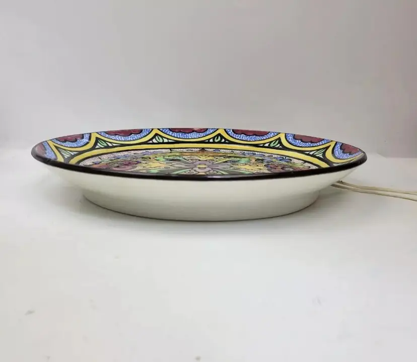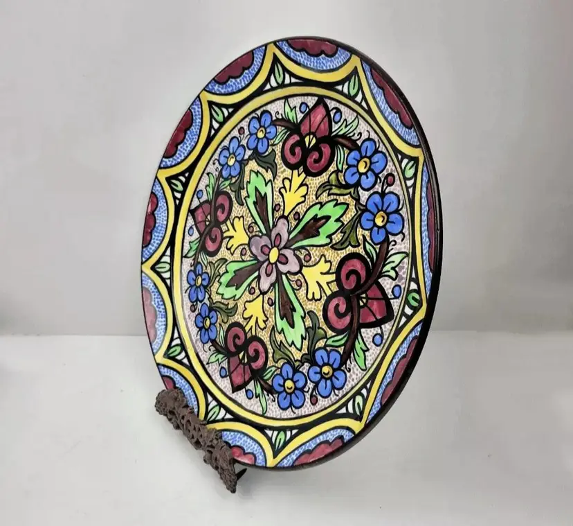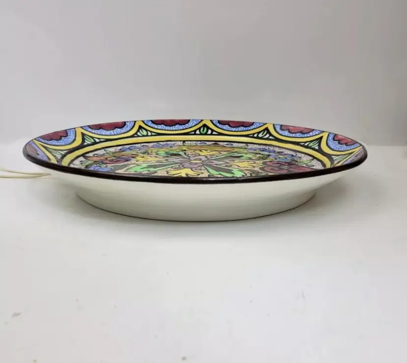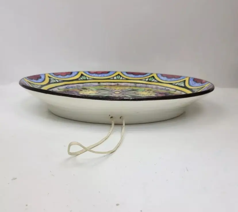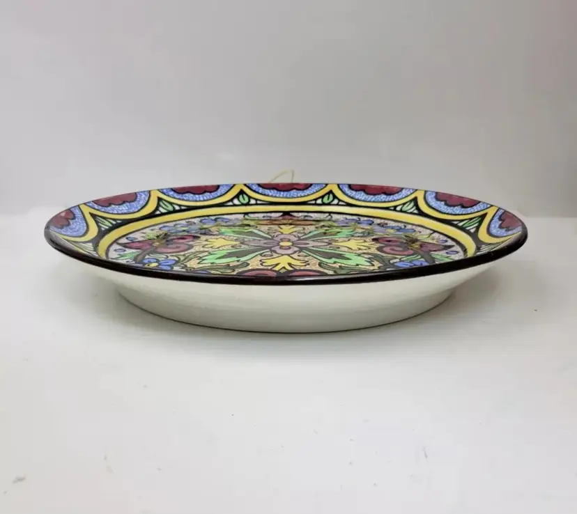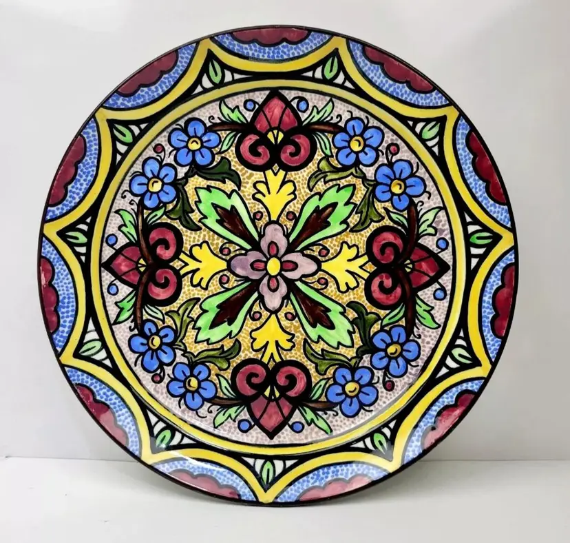 Vintage Spanish Decorative Plate Handmade Glazed Ceramic Floral Wall Hanging 14" Beautiful, large ceramic hand painted decorative wall plate with a vibrant Mediterranean floral design.