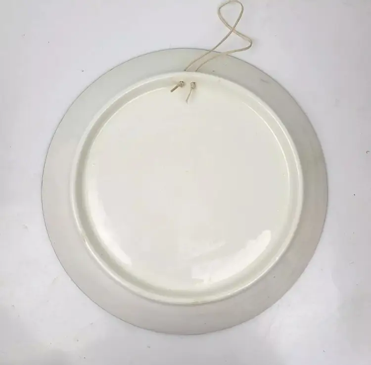 There are two pre-drilled holes on the back of the plate with an attached cord for hanging (although there is a string attached, I would recommend replacing with wire for strength due to the weight of the plate).