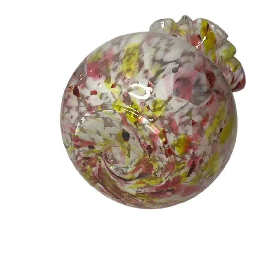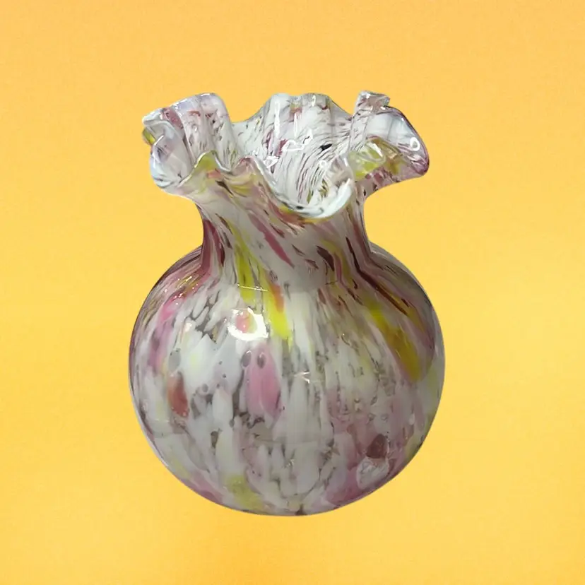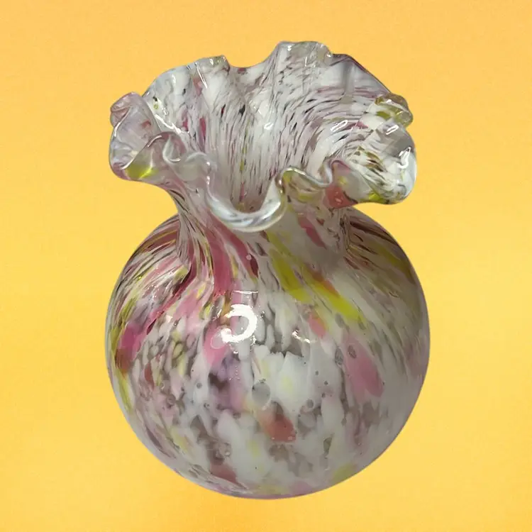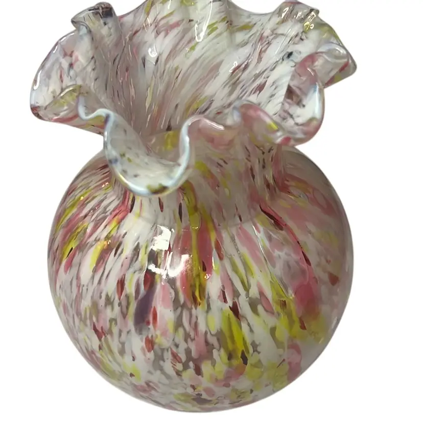 Has pink, yellow and white colors. Also has a ruffled rim. No damage and measures 8.5” tall & 4.5” wide.