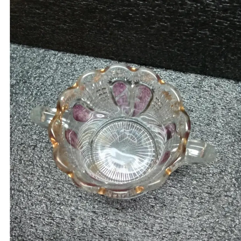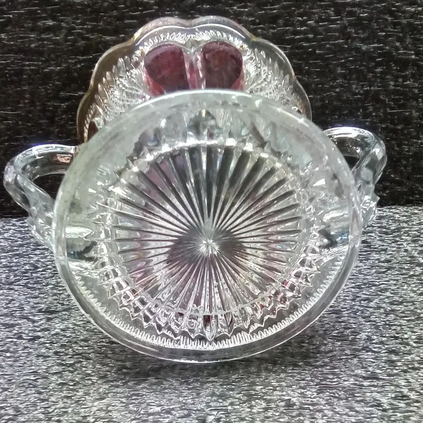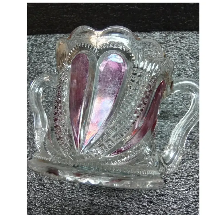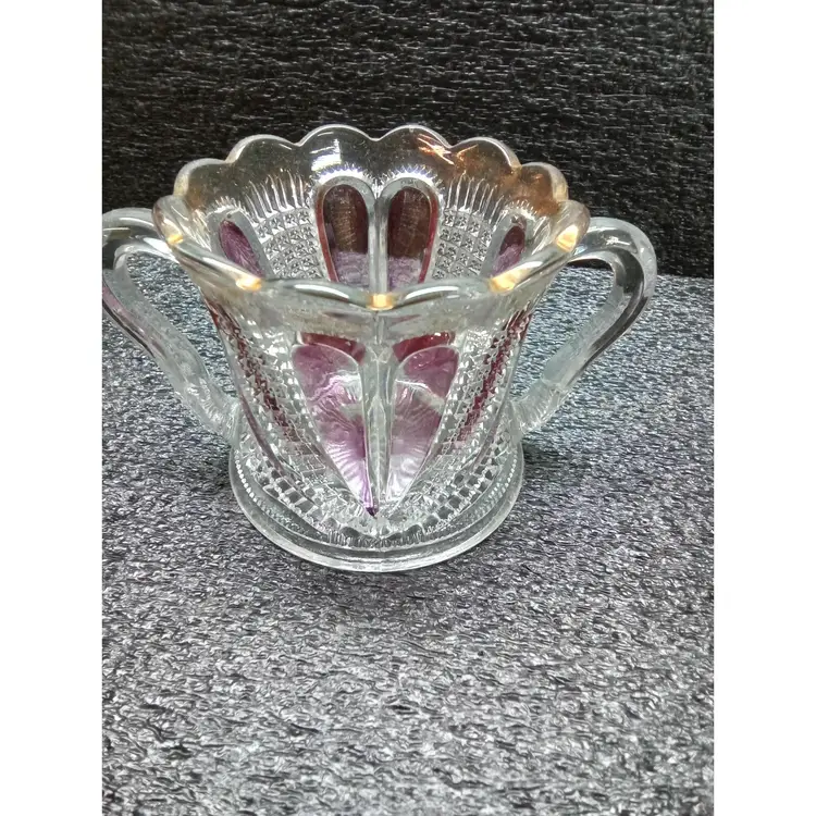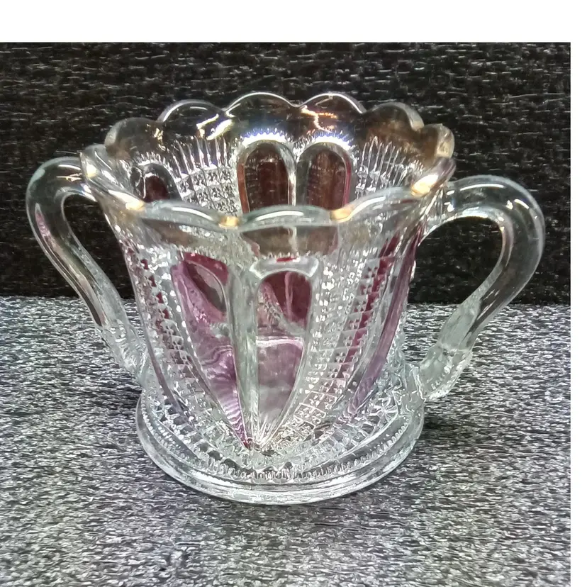 This spooner is early american pattern glass from US Glass Company No. 15154 introduced in the teens. I'm not sure of the exact age of this piece. Measures approximately 3 1/4" tall, and 3 1/2" across. Very nice condition, with no chips or cracks.