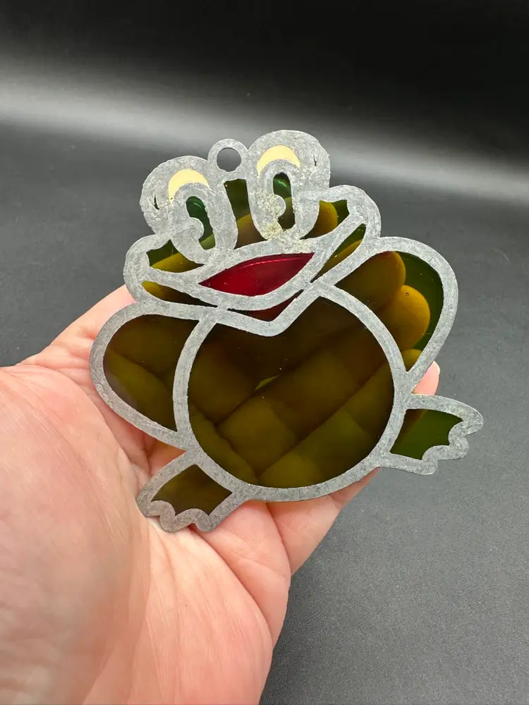 Adorable froggie with the biggest smile cuz he gets to stare outside all day! Unmarked, glass not plastic.