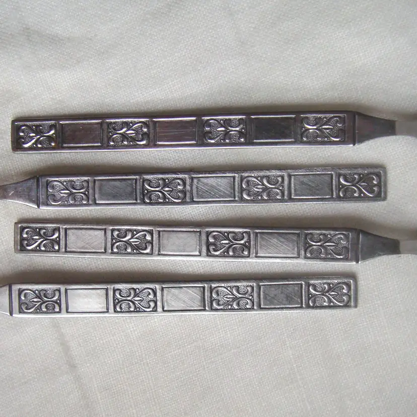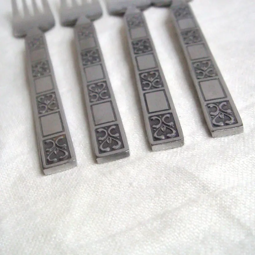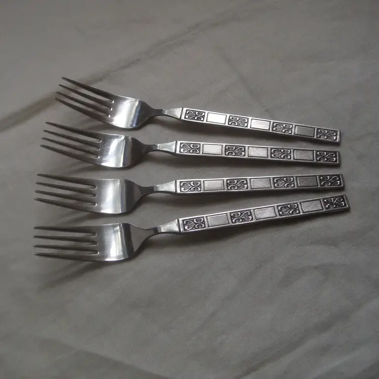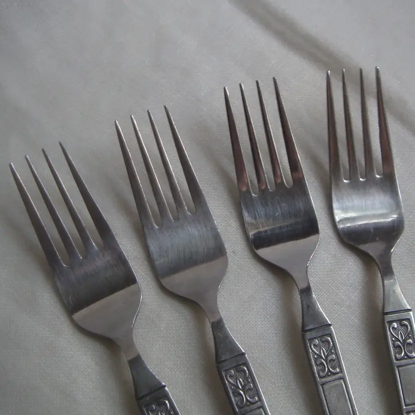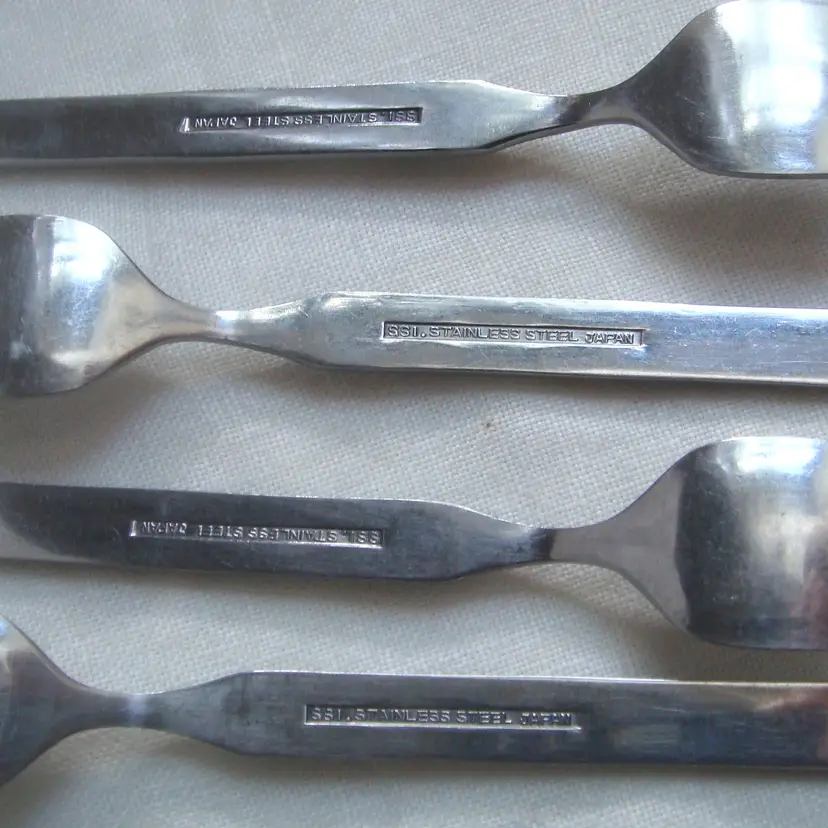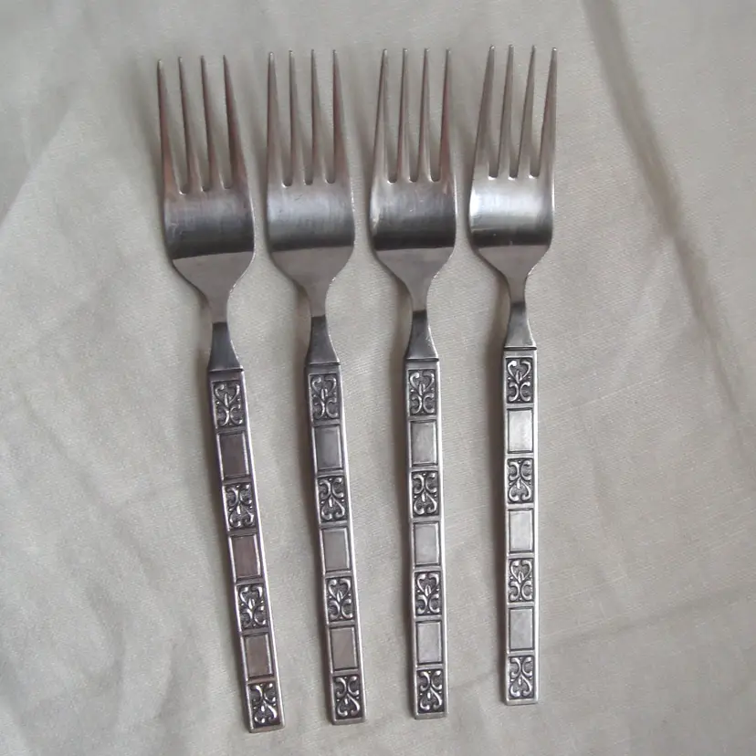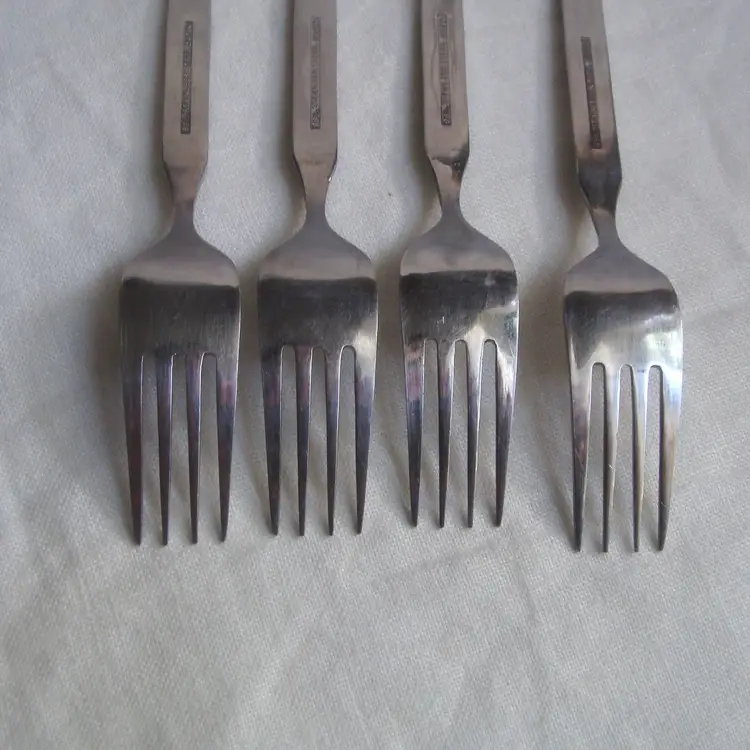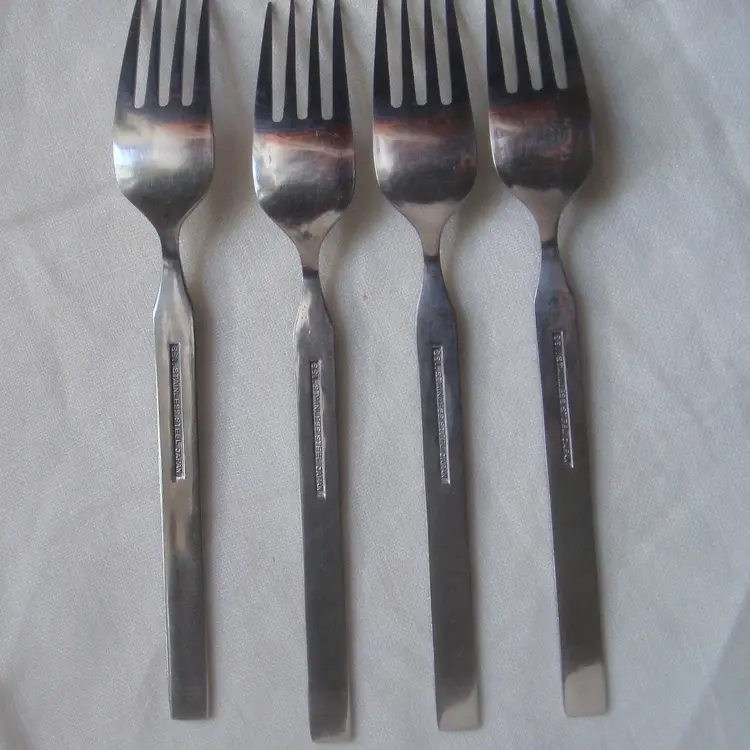 Stainless steel flatware Small Dessert fork: 4 Glossy shiny Stamp on reverse Nice condition & weight. Best estimate, 70s.