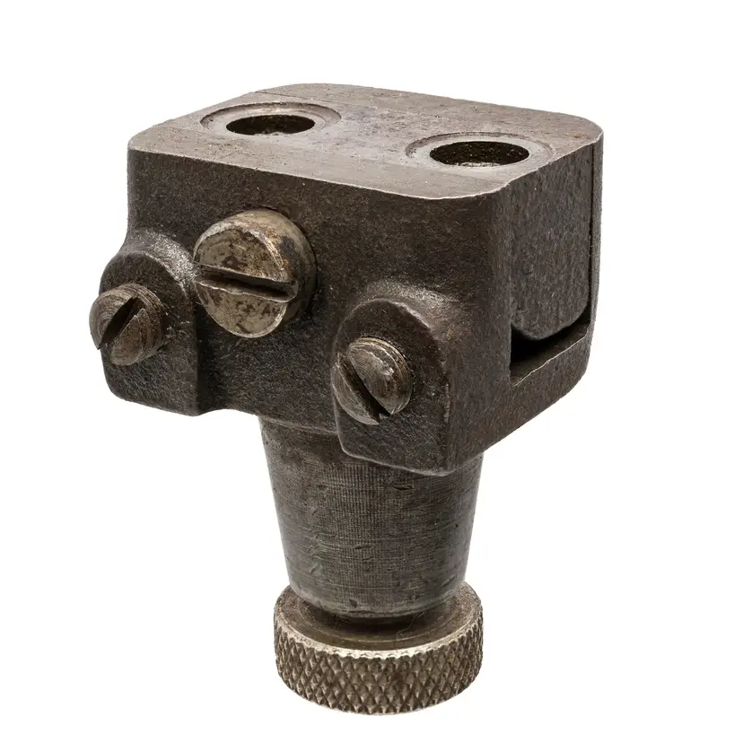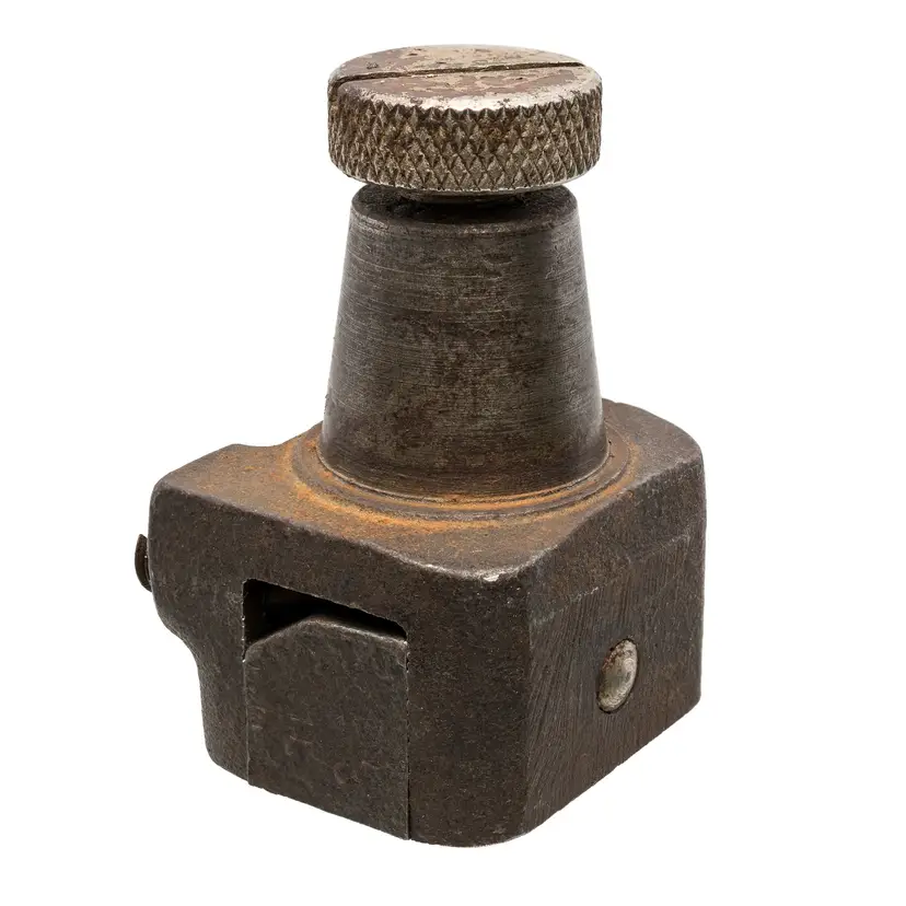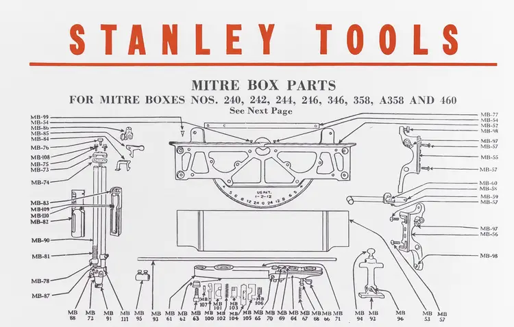 An Good Plus "T" base assembly for Stanley's vintage cast iron mitre boxes. It works perfectly and will work with any model that used this feature - No. 240, 242, 244, 246, 346, 358, 360, & 460 but has the black finish (japanning) used from 1912 to about 1935. Includes all of the parts shown. The 1912 patent date stamp is barely visible, as is an "F" for front (although it can also be used on the back side of the swivel).