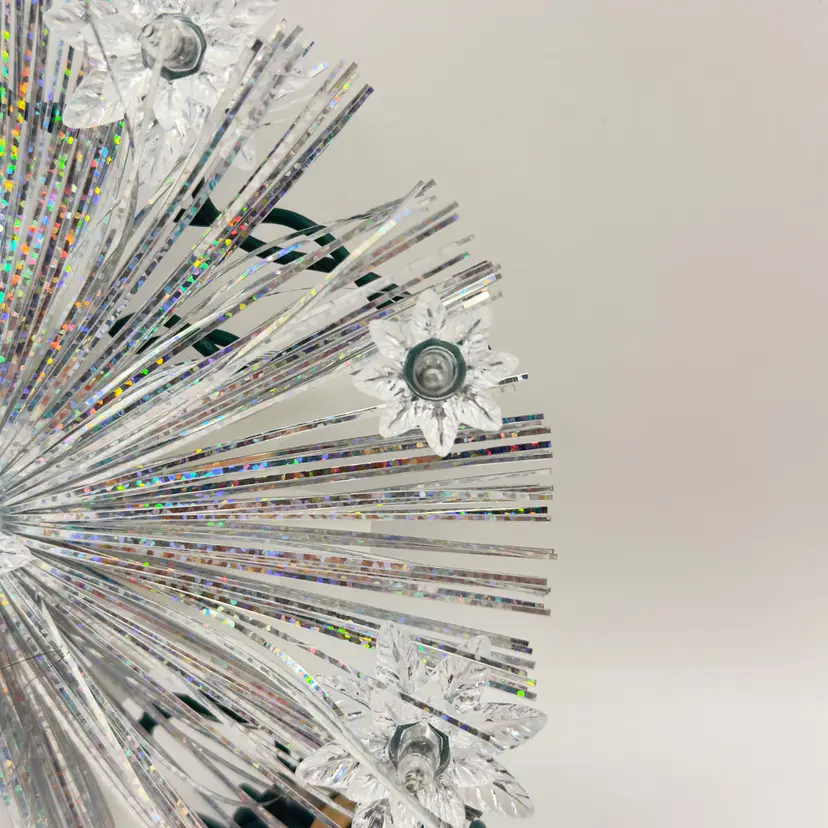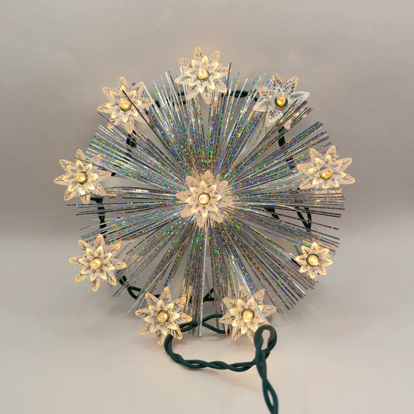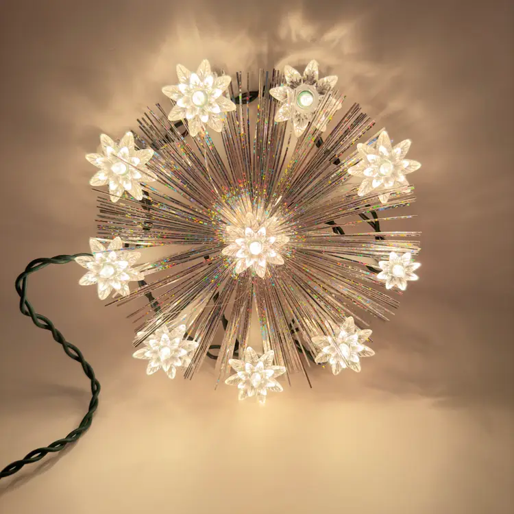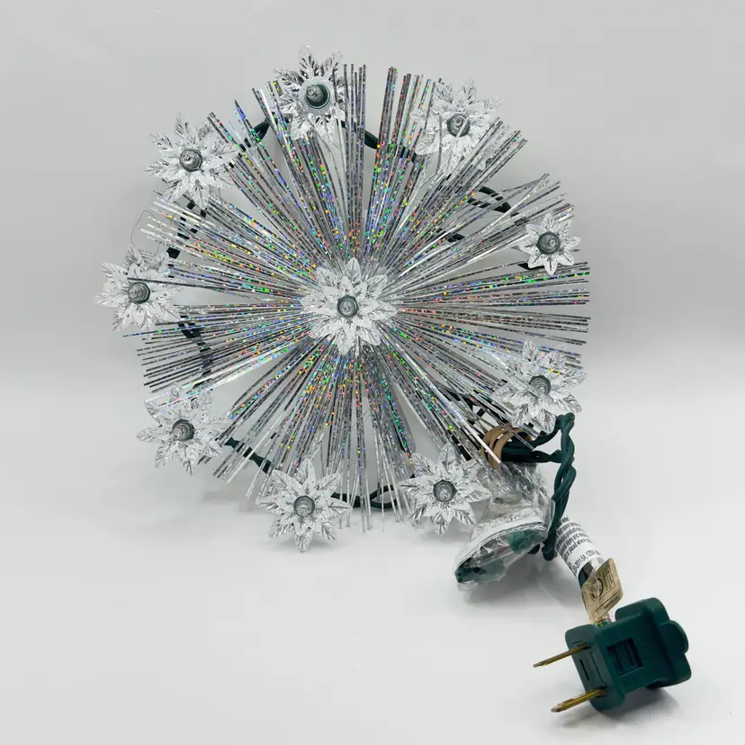 Add a touch of vintage sparkle to your holiday decor with this stunning starburst Christmas tree topper. Featuring lighted silver accents, it creates a dazzling display atop your tree. Perfect for adding a festive and nostalgic charm to your celebrations. In great working condition. One flower pedal missing (see pic). Measures 8 inches. Weighs 10oz.