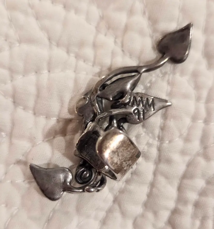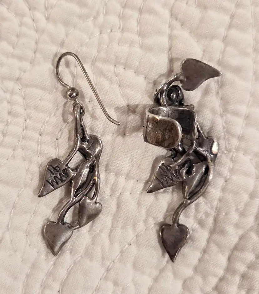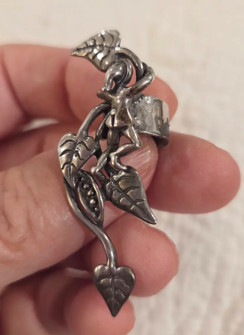 Absolutely whimsical. Check out the tiny climbing Jack with his little cap and skinny legs and the stalks with bean pods. Jack is a cuff and measures 2" long while the leaves on earring wire are just shy of 2" long. Signed MM 91. These earrings acid test as positive for Sterling silver.