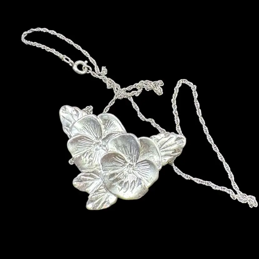 All stamped 925 Twisted rope chain is about 18” 3 flower pendant is about 1.75” x 1.25”