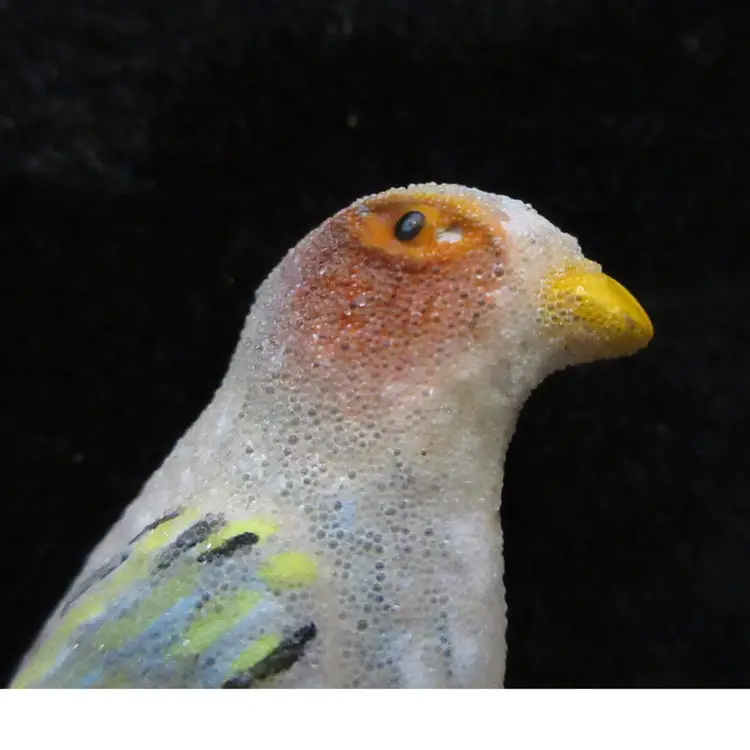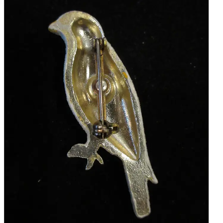 This is an AMAZING VINTAGE brooch shaped like a parrot or lovebird. The brooch is made of gold tone metal and painted in a rainbow of colors. The paint is then "sugar" coated to make the bird feel sandy. The effect is AMAZING! This bird brooch has a pin back with a sliding C closure. It is 2 inches tall.