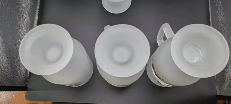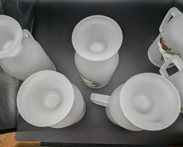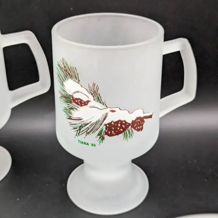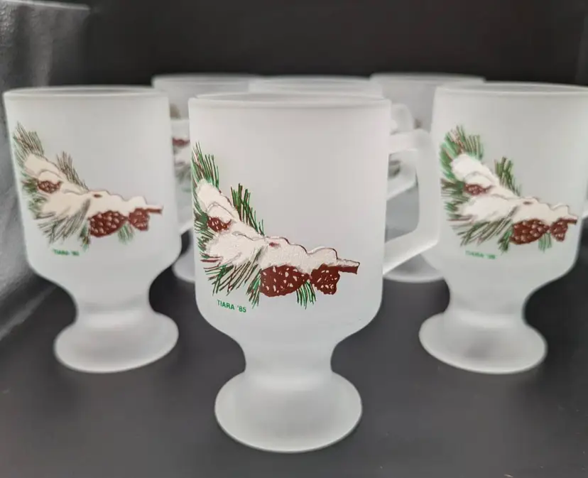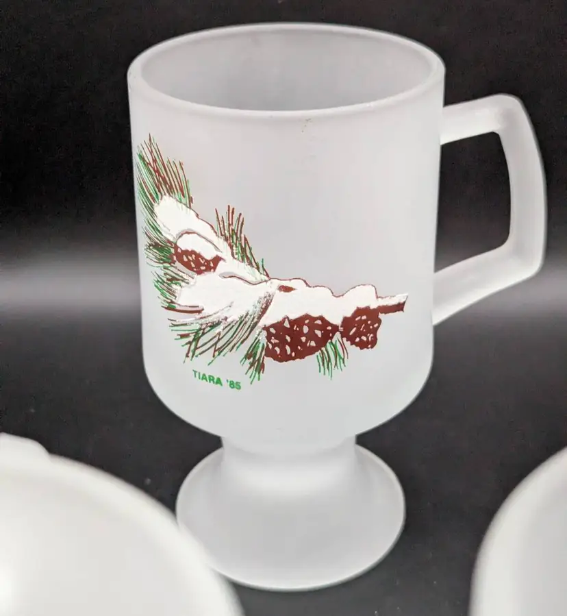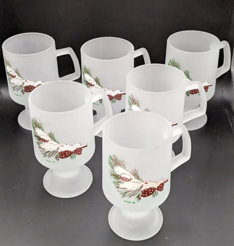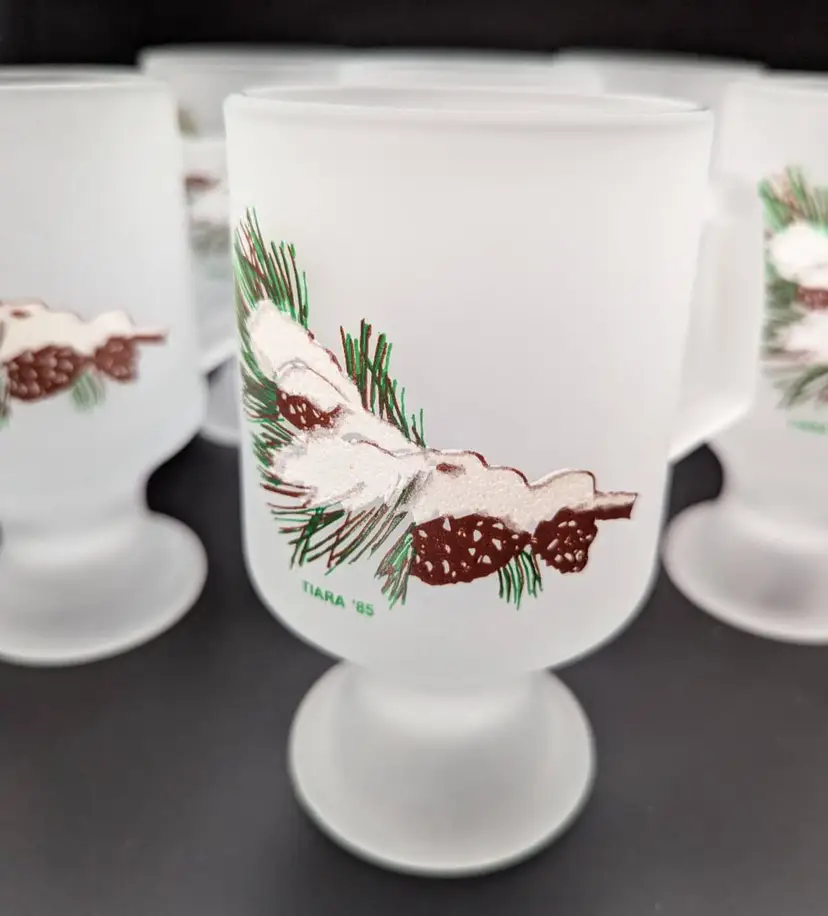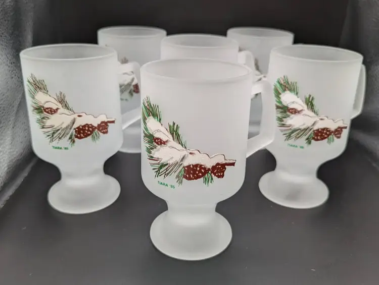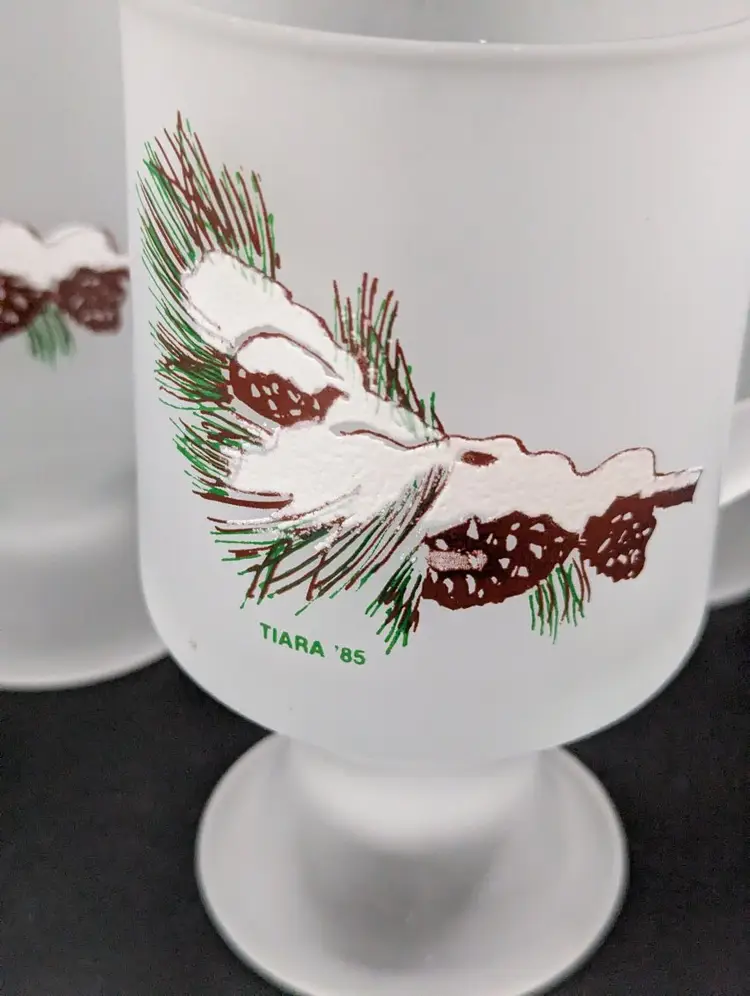 This is a hard to find Vintage Tiara brand- Frosted Winter Scene with Pinecones Mug They are footed mugs.Great size handle. This is a set of 6. The mugs are frosted - adding to their very nice wintery feeling! They stand 5.5 inches tall with a mouth diameter of 3.5 inches. Holds approx. 10 oz.