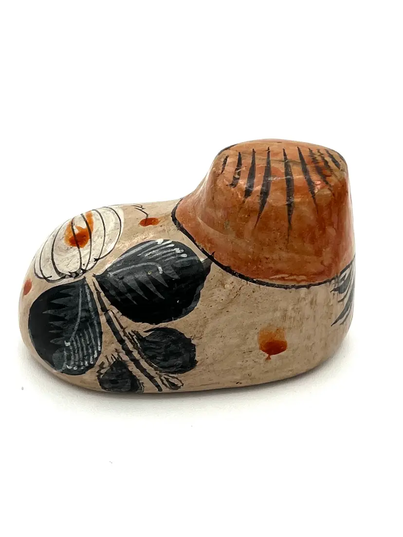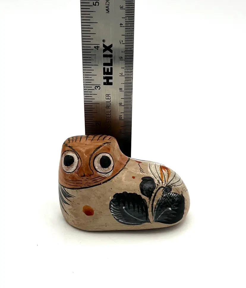 This vintage Tonala Mexican pottery cat figurine is a beautiful piece of art that showcases the rich Mexican culture. The floral hand-painted design adds to its unique charm and makes it a great addition to any collection. It was made in Tonala, Mexico and perfectly represents the artistry of the region. This piece is perfect for collectors of Mexican culture and pottery enthusiasts alike. • Excellent pre-owned vintage condition. • Measures approximately 3.5” long x 2.25” tall.