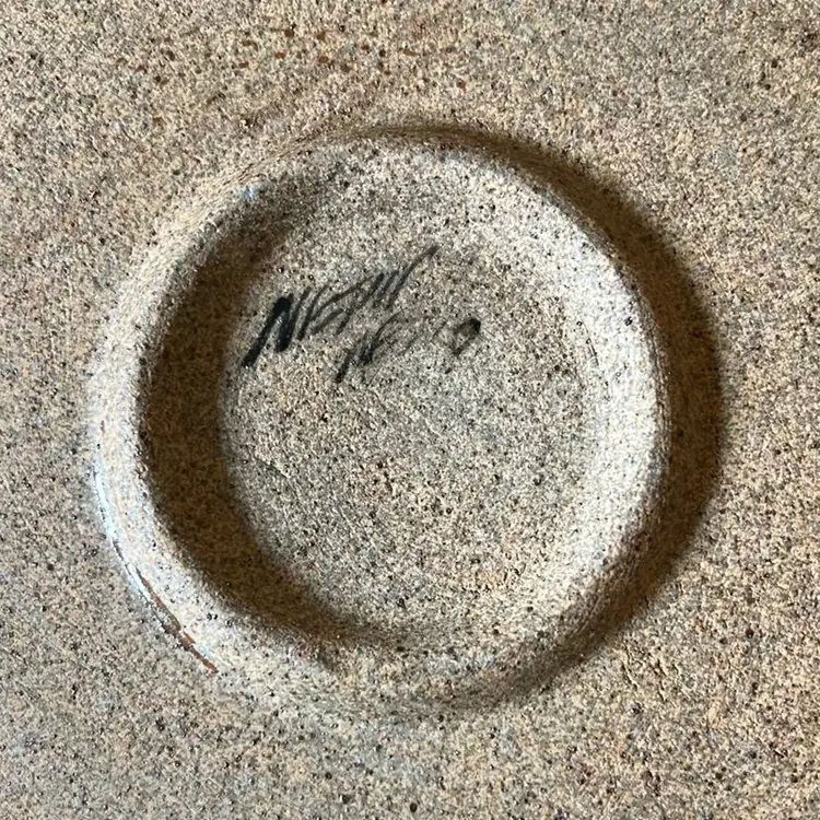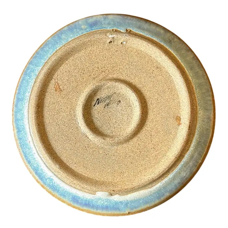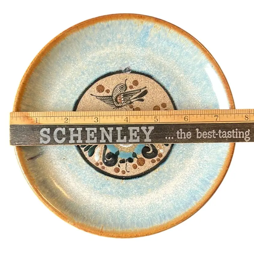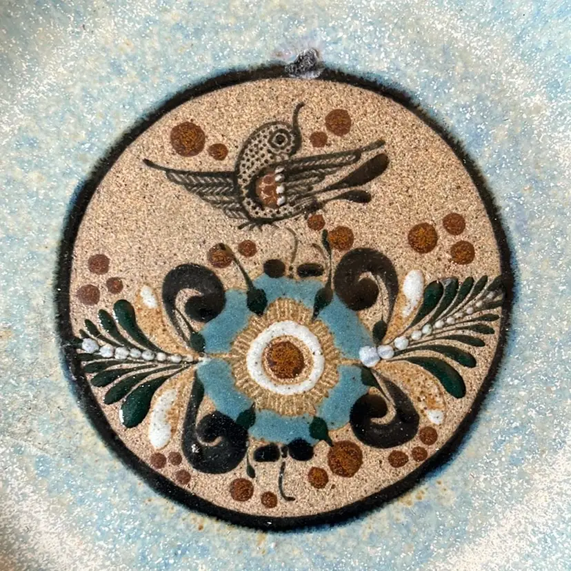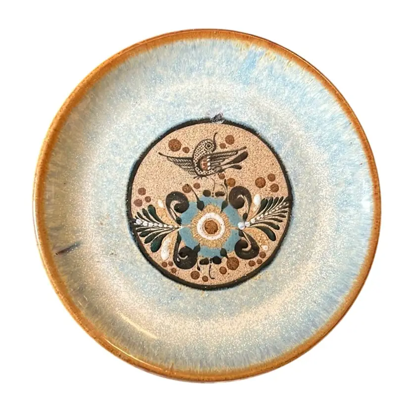 Beautiful Tonala plate with signature bird and flower design. Signature I believe is Netzi Mexico upon research. Great condition with a slight flaw on front of plate above the bird. Looks like they attempted to make holes on the back for hanging but glazed over them. Great earth tone colors in this design. Plate is 7.5” in diameter