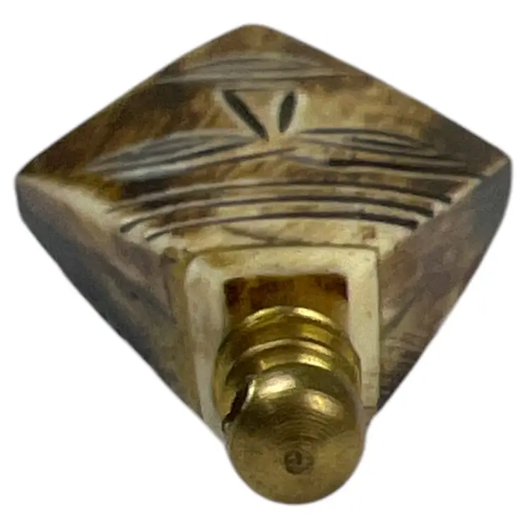This vintage pendant is a unique piece that reflects the 1970s bohemian style. The wooden pendant shape resembles a diamond and is made from glazed wood with a totem face and brass screw on bail which also acts as a wand to apply perfume or essential oil. The pendant is designed as a perfume or essential oil bottle and was made between 1970-79. The pendant is a perfect addition to any jewelry collection with its nature, western, tribal, retro, and ethnic themes. It is a diamond-shaped pendant with a unique design that will make a statement. This a gorgeous original piece!