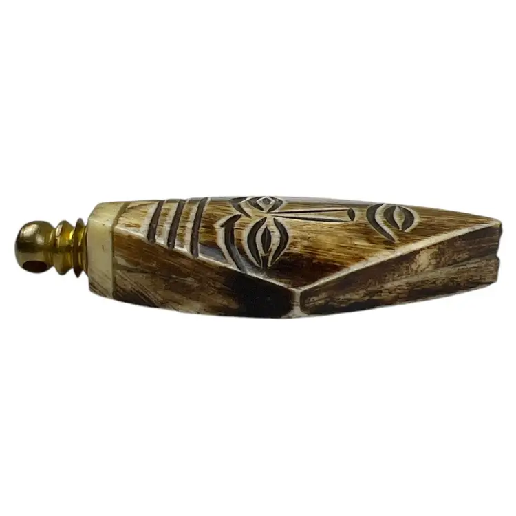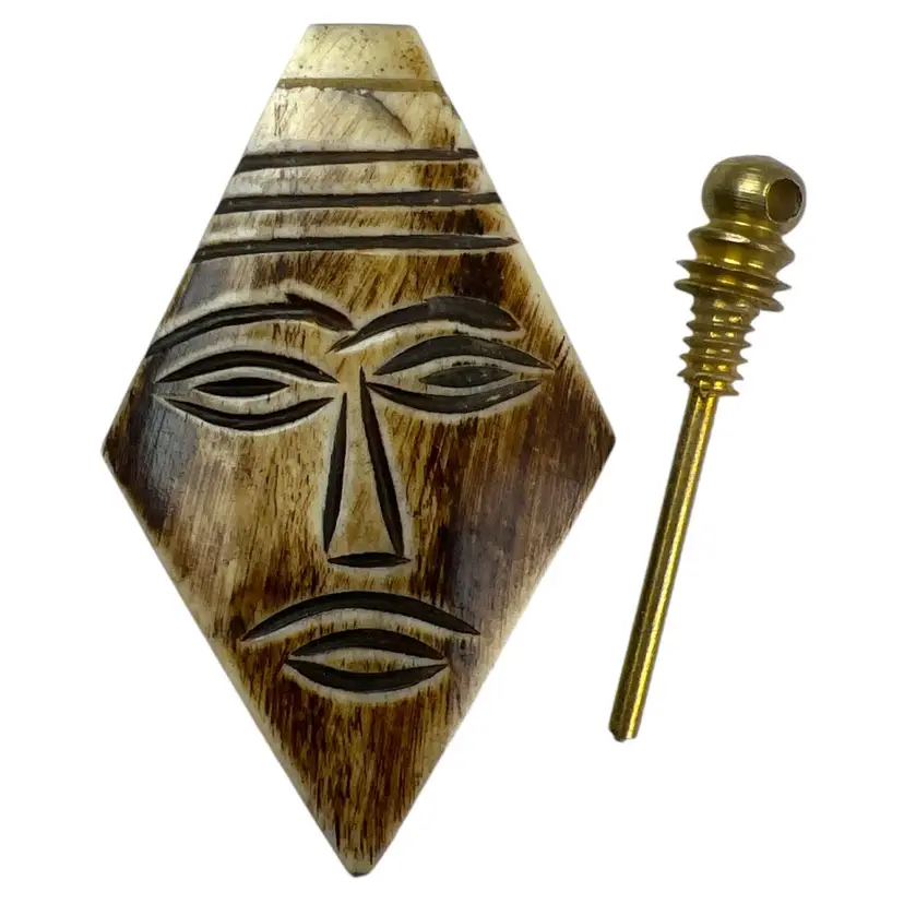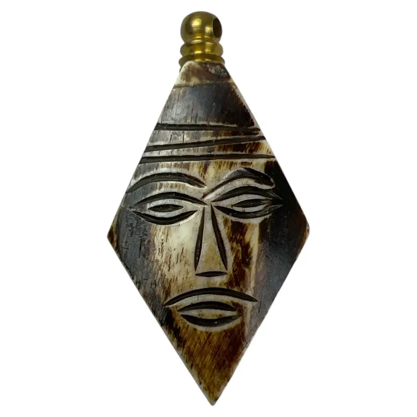 This vintage pendant is a unique piece that reflects the 1970s bohemian style. The wooden pendant shape resembles a diamond and is made from glazed wood with a totem face and brass screw on bail which also acts as a wand to apply perfume or essential oil. The pendant is designed as a perfume or essential oil bottle and was made between 1970-79. The pendant is a perfect addition to any jewelry collection with its nature, western, tribal, retro, and ethnic themes. It is a diamond-shaped pendant with a unique design that will make a statement. This a gorgeous original piece!