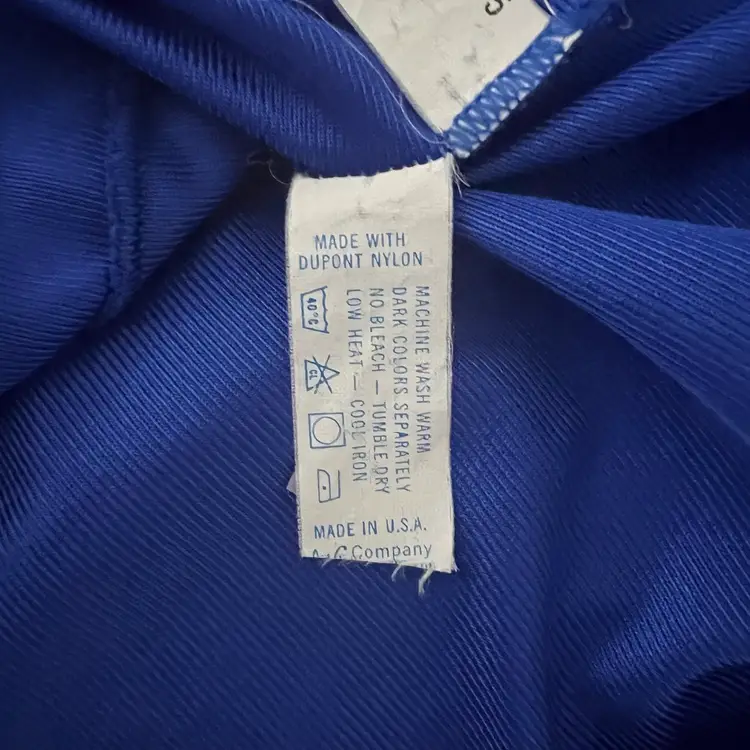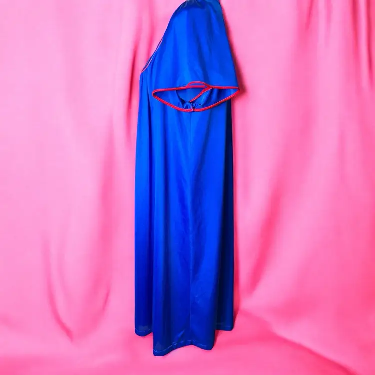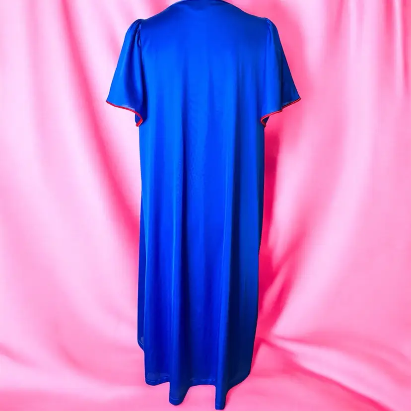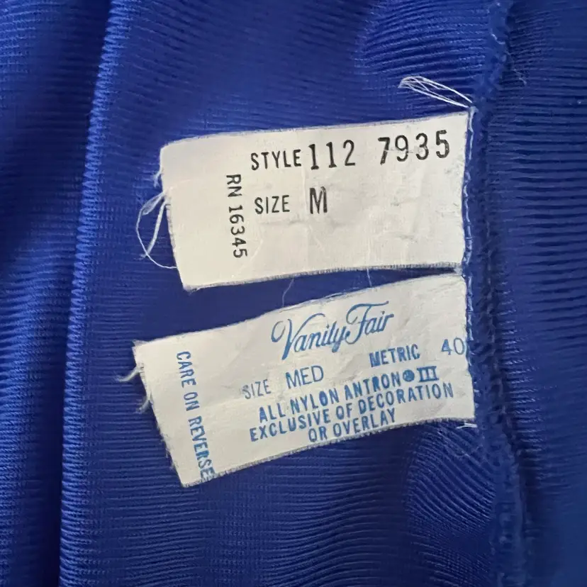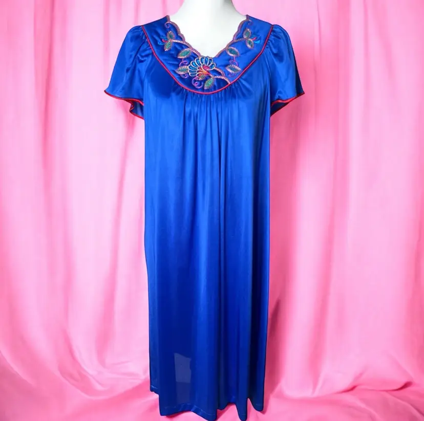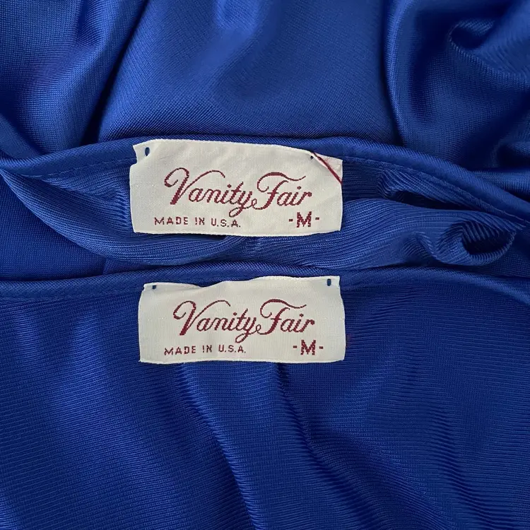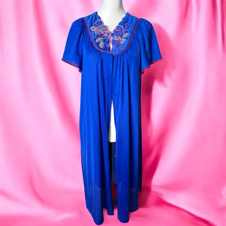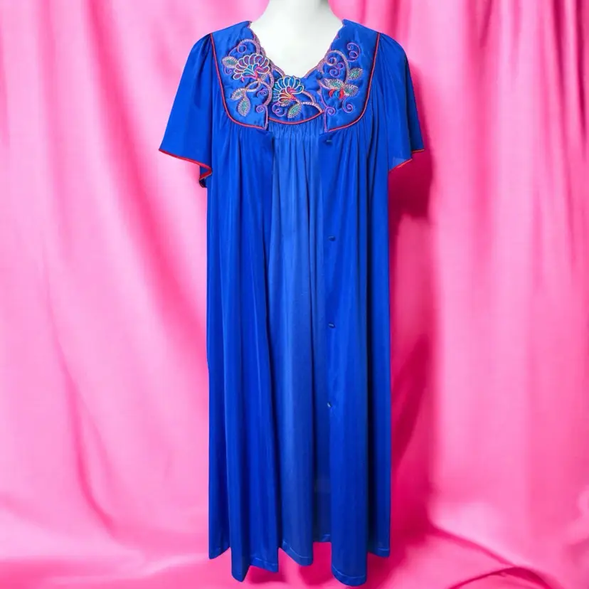 This vintage Vanity Fair nightgown and robe set is a stunning addition to any collection. The bright blue color and multi color embroidery adds a pop of color to the nylon material, making it perfect for evening wear. The set includes a comfortable nightgown and robe, both in size M, and is an original piece from the 1960s. The brand is known for its quality and this set is no exception. Made in the United States, this peignoir set is a must-have for any vintage clothing enthusiast.