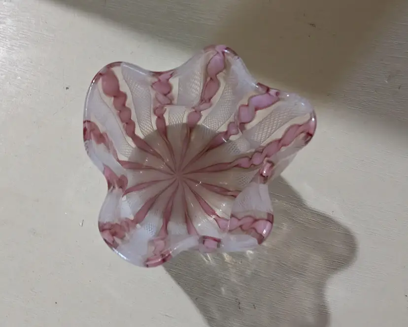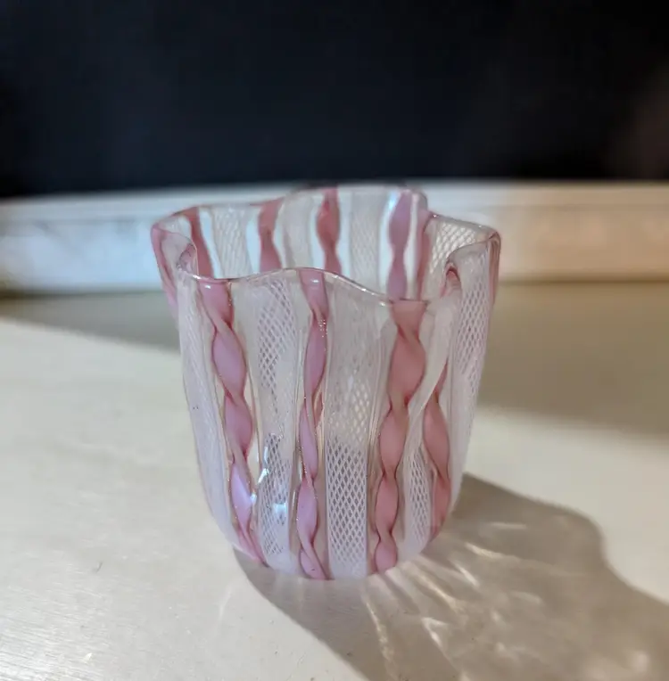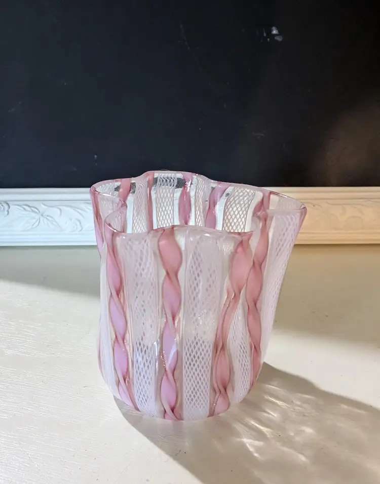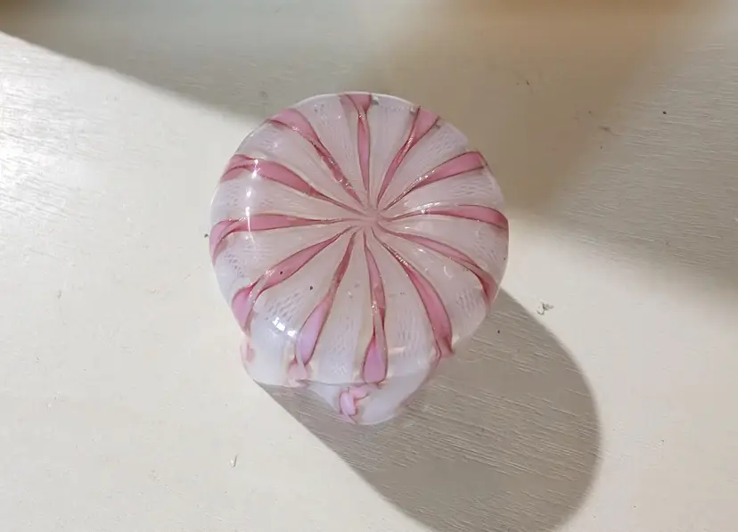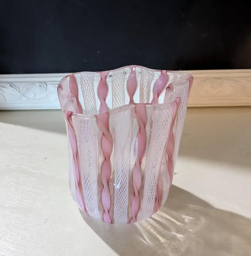 Beautiful vintage glass vase featuring a delicate pink and white swirled design. This elegant piece is in excellent condition with no cracks or chips, making it a perfect addition to your collection or as a stylish decorative piece. The vase measures approximately 2.5 inches in height and 2 inches in diameter. Ideal for adding a touch of vintage charm to your home decor.