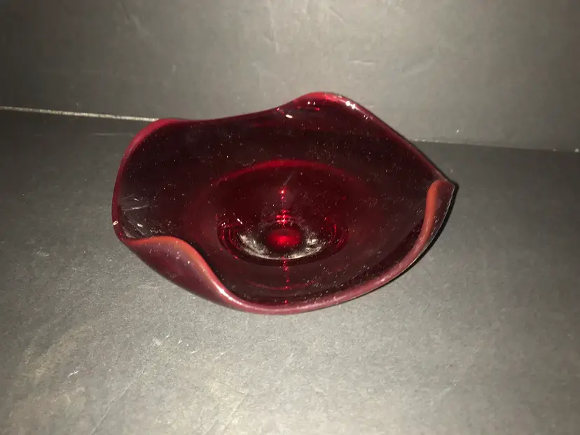 This vintage Viking art glass candy dish is a stunning addition to any collection. The ruby red round shape is accentuated by a cupped edge and adorned with the iconic Vikings logo. Hand wash only to maintain the quality of this ruby glass candy dish, which is perfect for serving candy or other small treats. The dish is part of the Royal Ruby product line and is a true piece of history. Ideal for collectors, this candy dish is a must-have for anyone who appreciates Viking art and design. No chips or cracks. 7”x2”