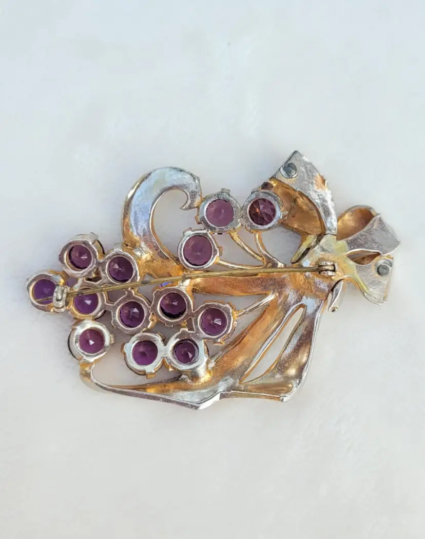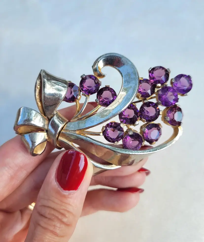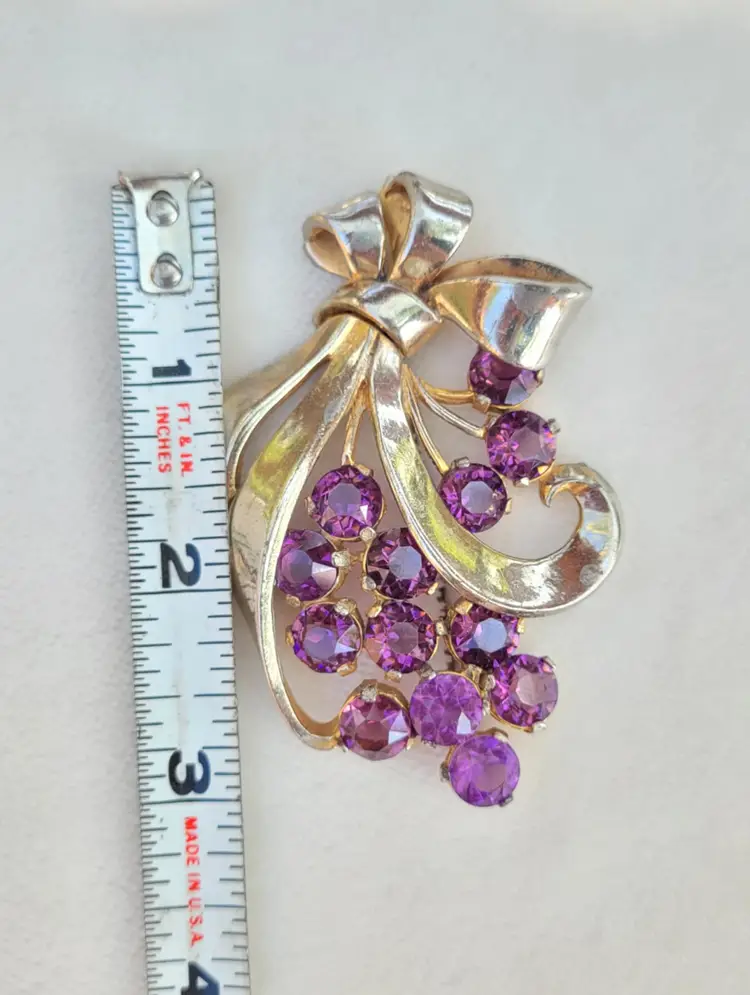Beautiful large 1940s/50s brooch, with deep purple rhinestones. It's in good condition from an estate, please see pictures for details and measurements.