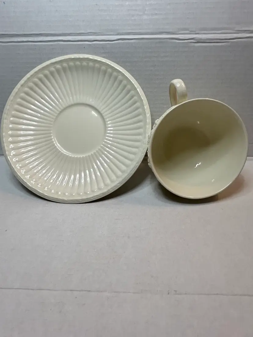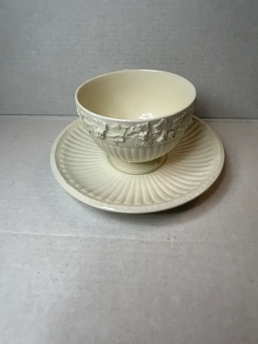 This is a Wedgwood Edme teacup and saucer set. The Edme pattern, which features embossed ribbing and a grape leaf design, was introduced in 1908 and remained in production for many years.