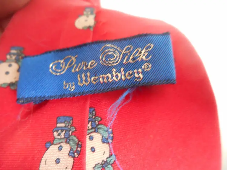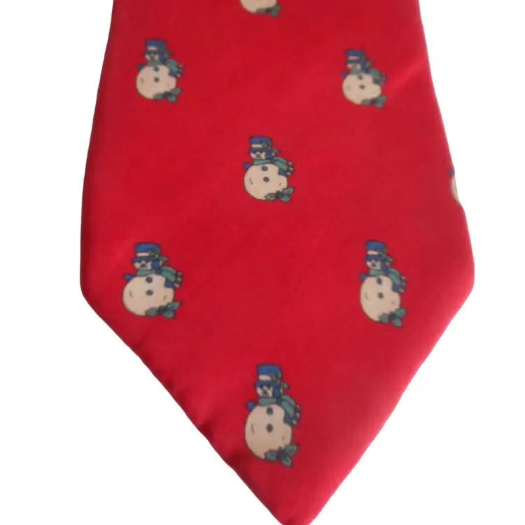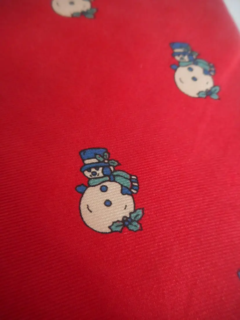 Vintage tie from an Estate - Beige snowmen with blue hat and green scarf on red background
