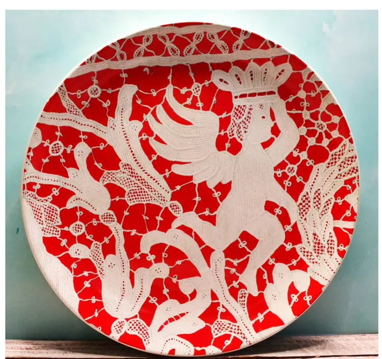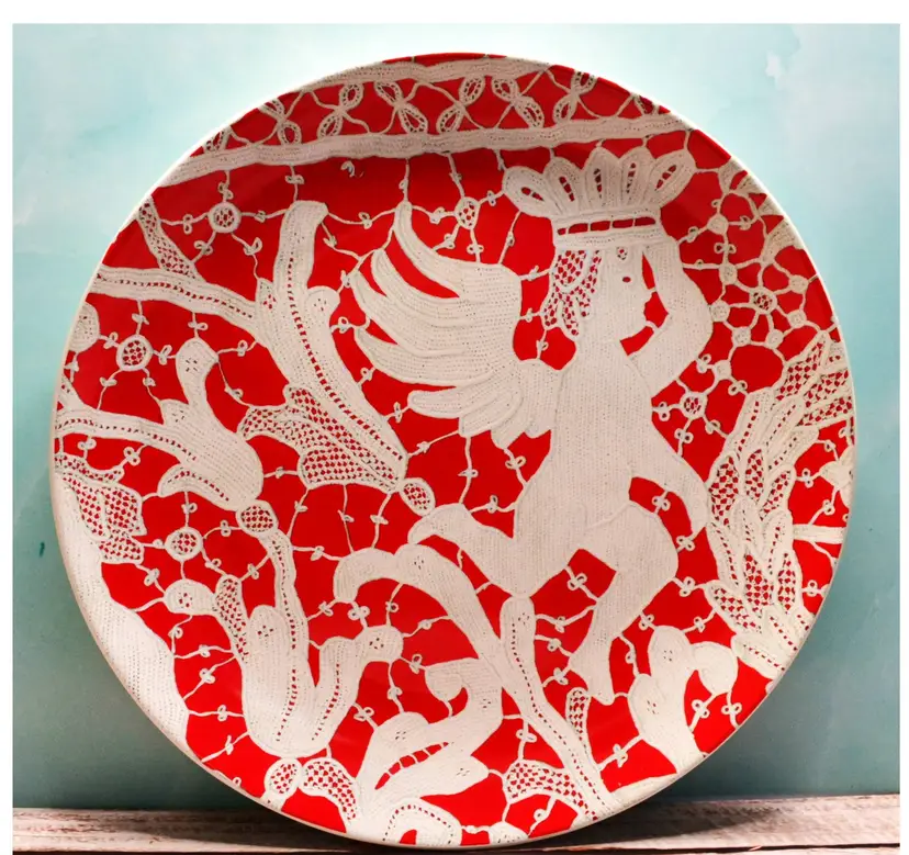 Set of 4 vintage Wisteria plates featuring a striking red-and-white palette with stencil-style designs. Crafted for both beauty and function, these plates are microwave and dishwasher safe, making them ideal for display or everyday use. Estimated production: late 1980s to early 2000s.