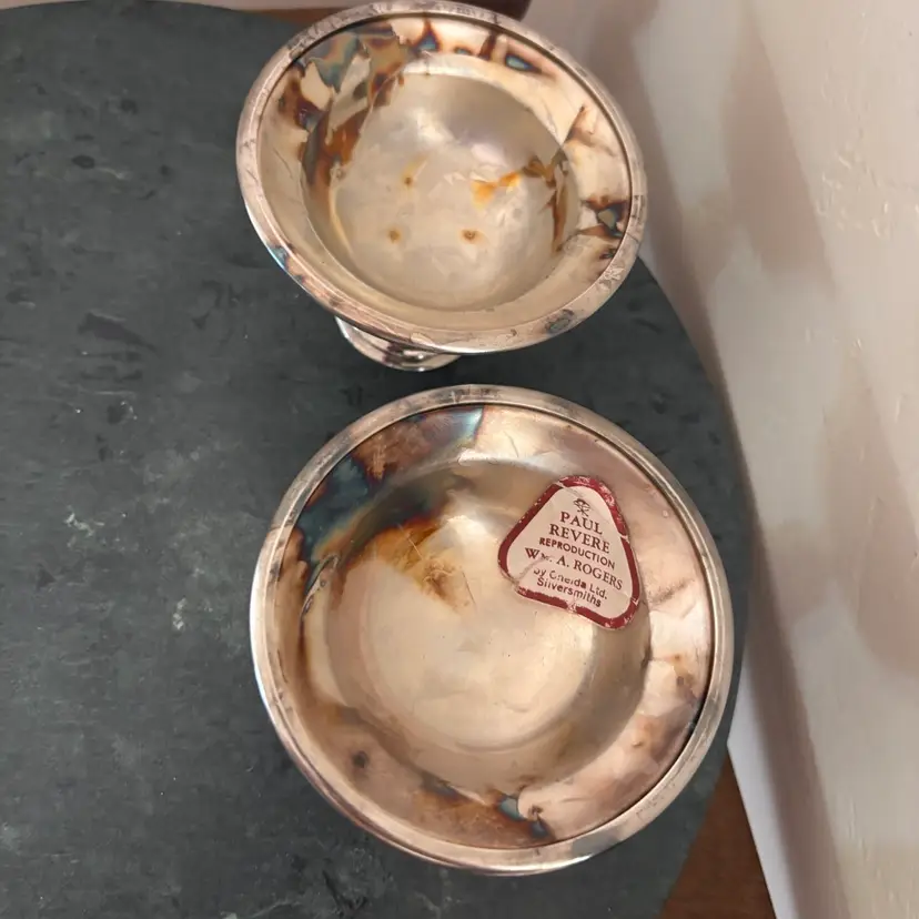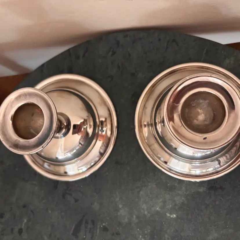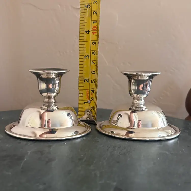 Elegant silver candle holders 2 1/2”tall x 3 1/4” at base Vintage wear and patina as shown