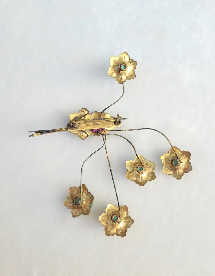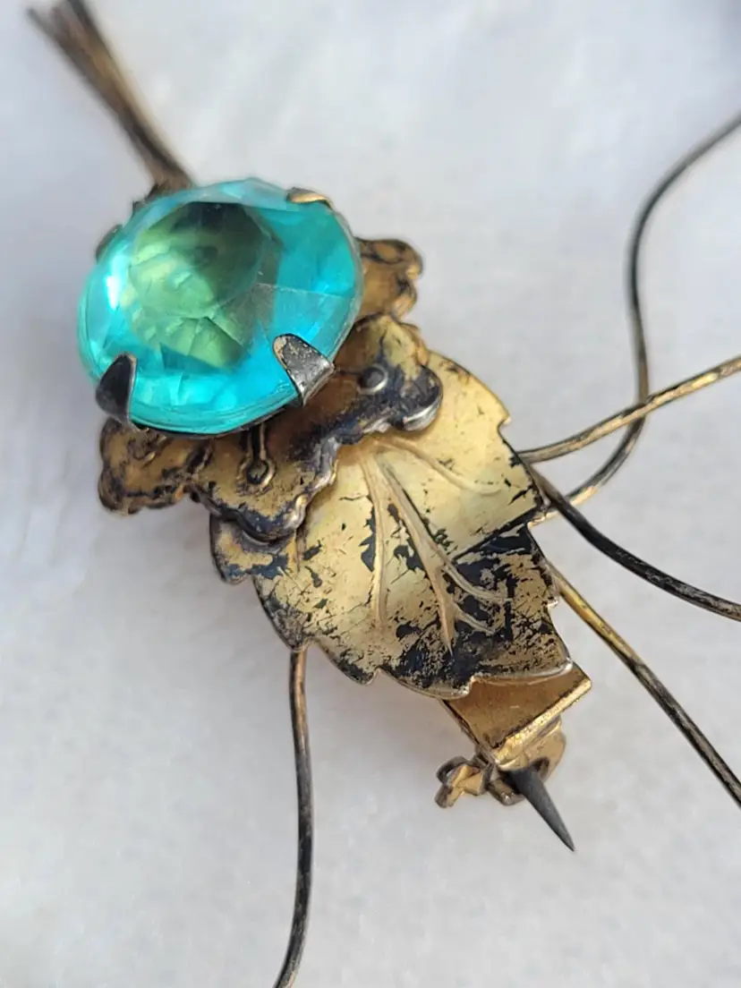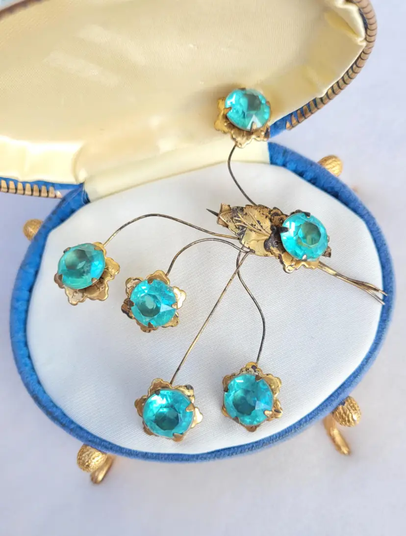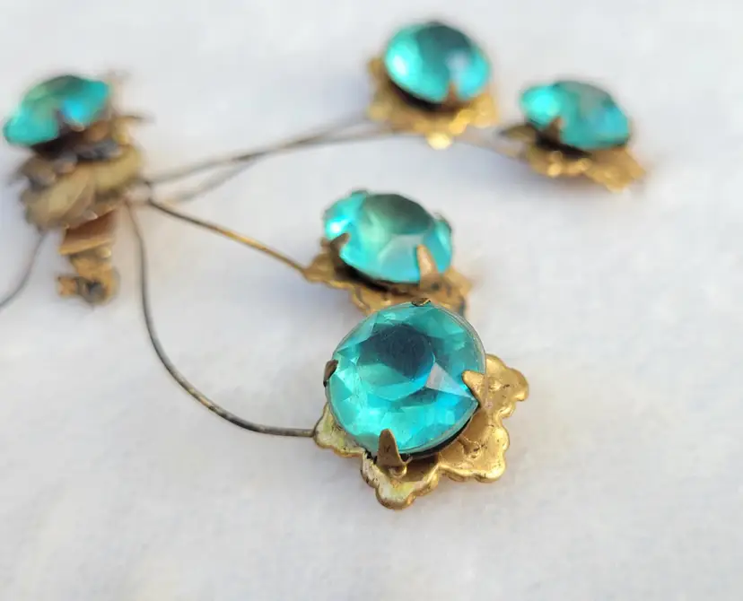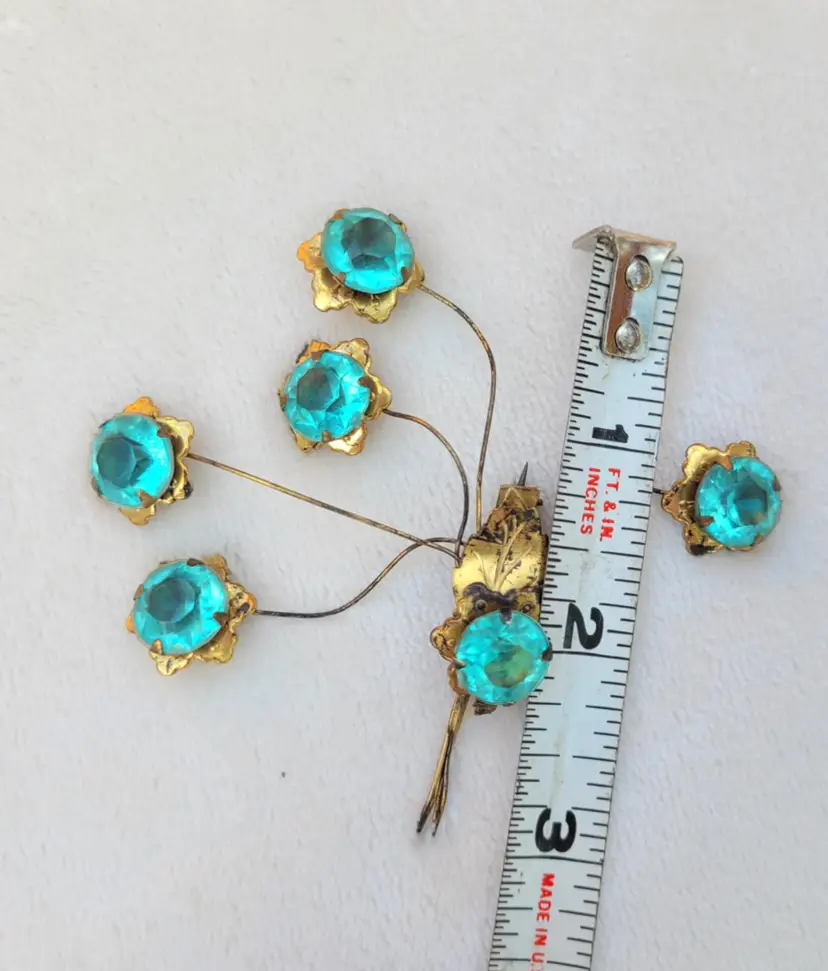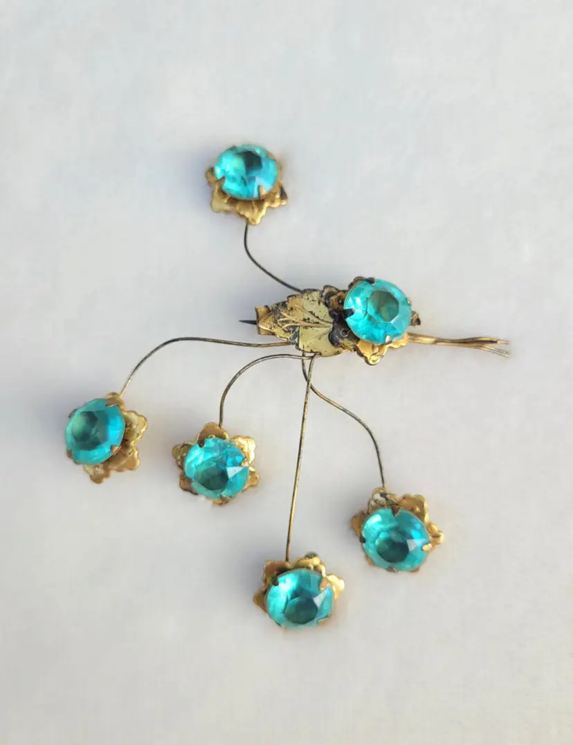 Beautiful large 1940s statement brooch, with flexible wired floral stems with large aqua rhinestones. It can easily be bent into whatever positions you'd like the flowers to be in. It's in good condition with some wear to the gold plating that I've shown in pictures, please see pictures for details and measurements.