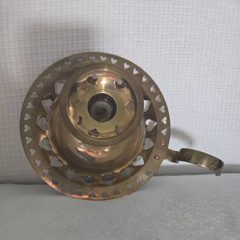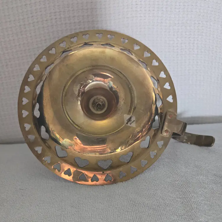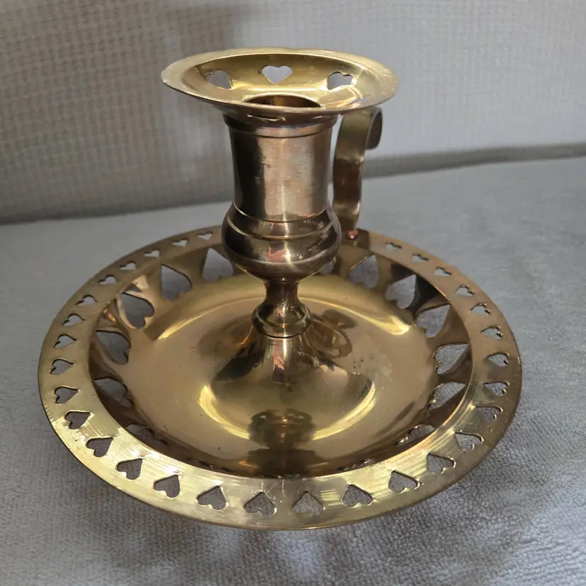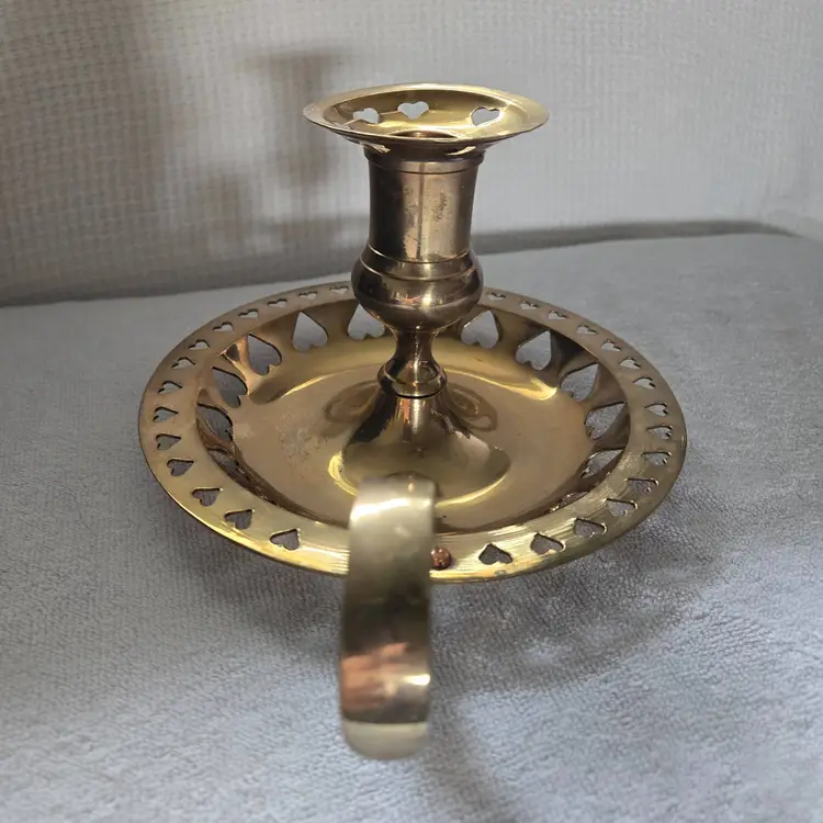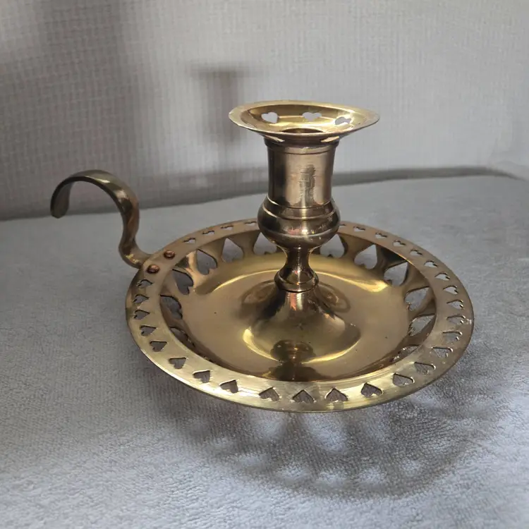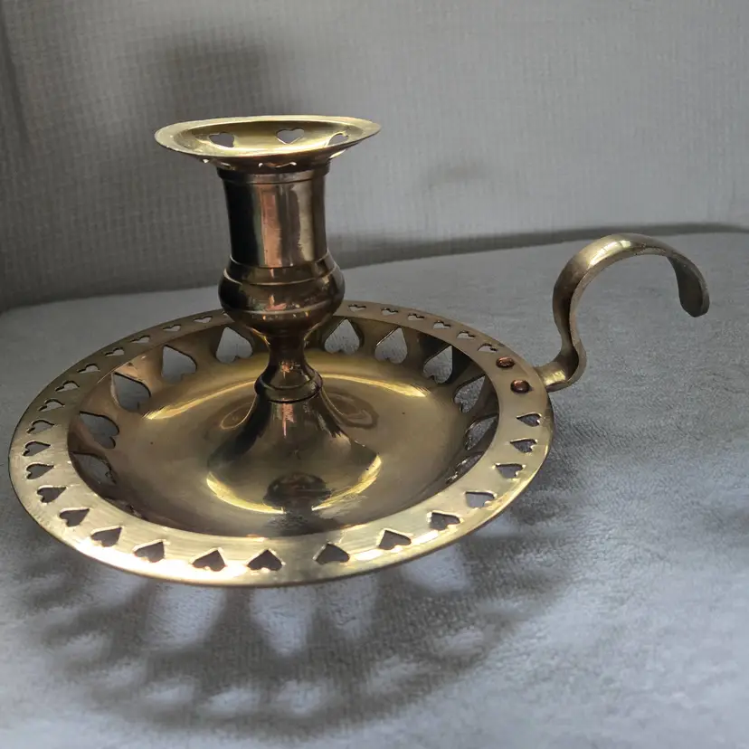 Featuring heart shaped cut-outs around the bottom edge and on the top. Commonly used from the 17th to the 20th centuries as a portable light source. Designed to catch wax while walking from room to room. Has a Made in India sticker on the bottom. Solid brass with a polished finish. (Candle not included). 5" tall ,9" across bottom to handle, 2 1/2" across top. In good condition. Has scratches across the bottom from being moved on a table.