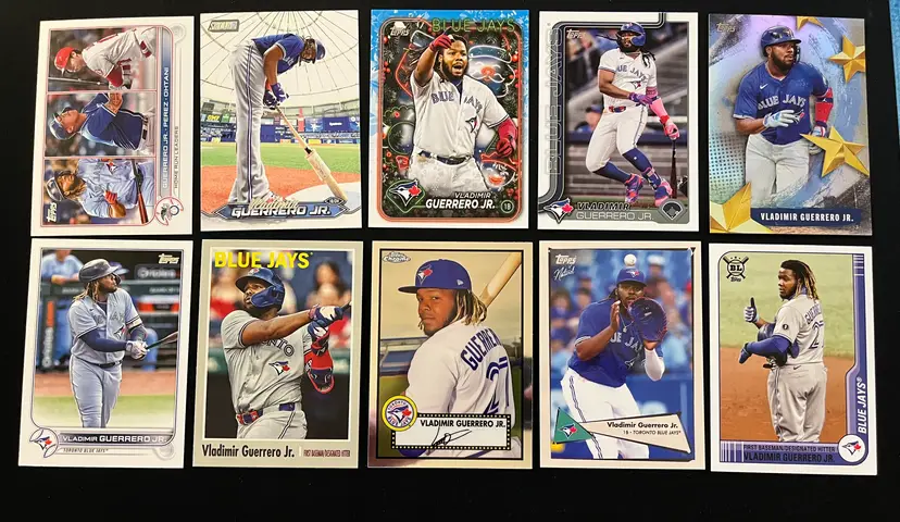 You are bidding on a lot of 10 Vladimir Guerrero Jr. baseball cards.