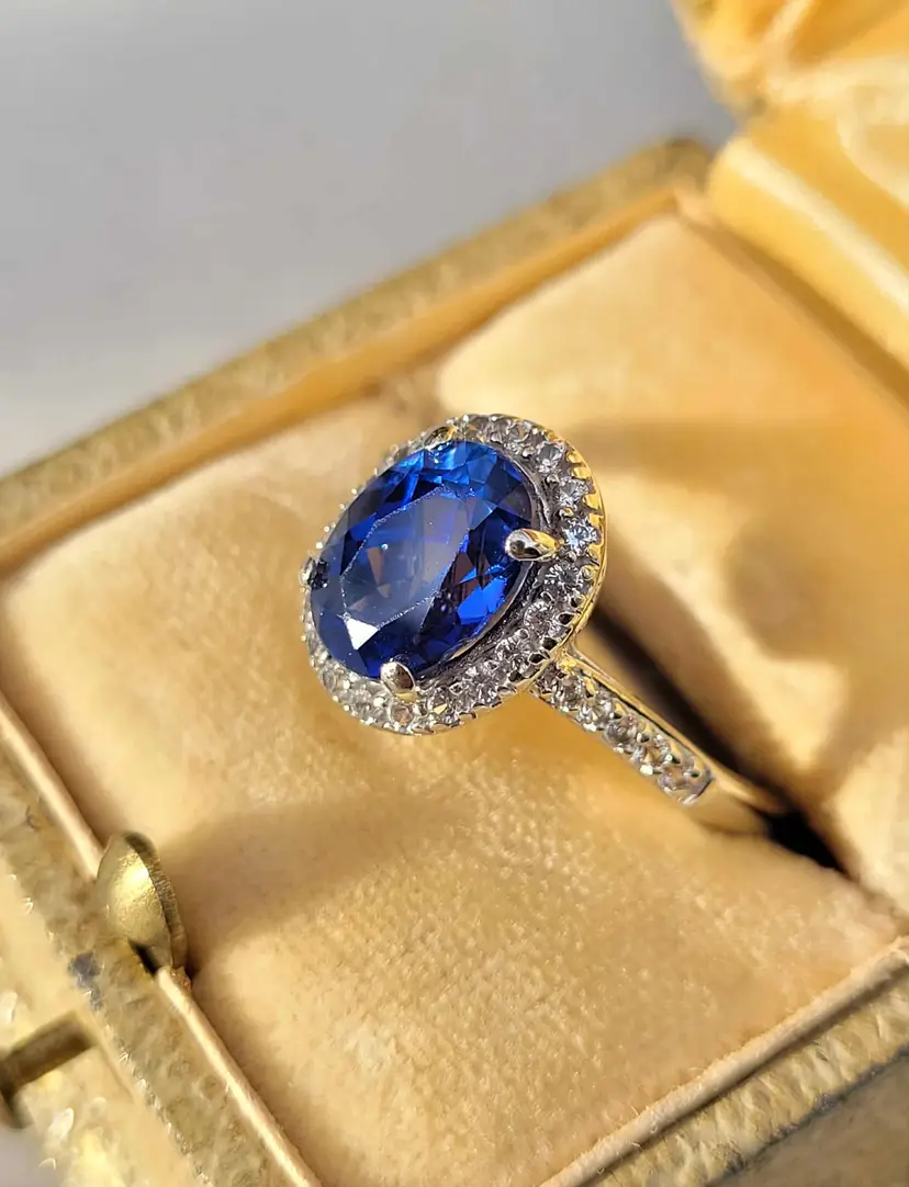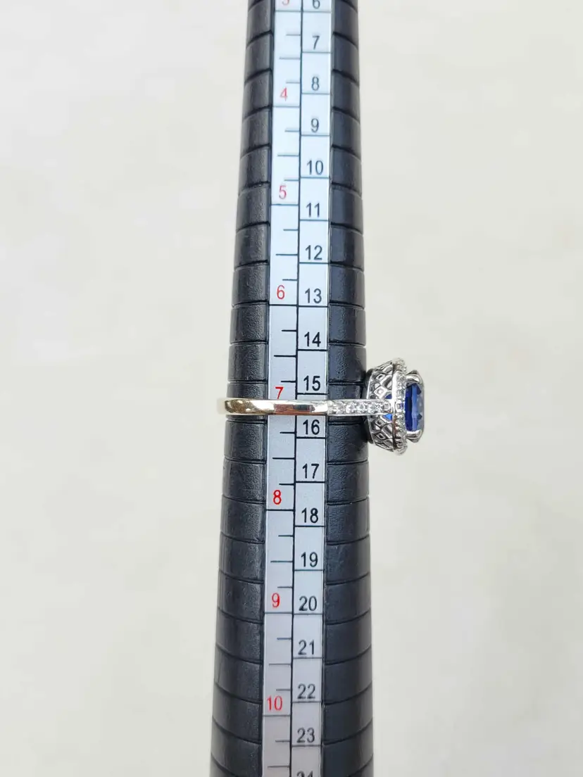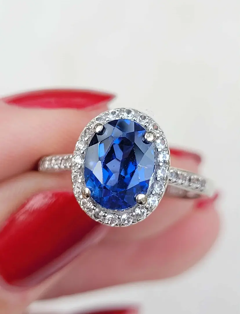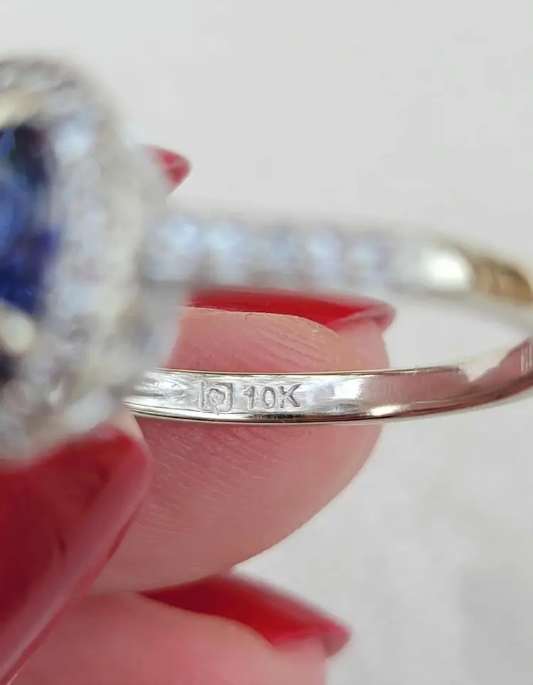 Gorgeous 10k white gold sapphire ring, in the style of Princess Diana's famous sapphire! This would make a lovely engagement ring, or special little treat for yourself. The rich ocean blue center sapphire is surrounded be a halo of white sapphires, all verified via Presidium tester and Spectrometer. It is in good condition and circa 1990s, with some minor abrasions to the facets that I could only see when zoomed in with the camera. Please see pictures for details, does not include my ring box.