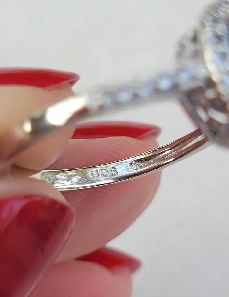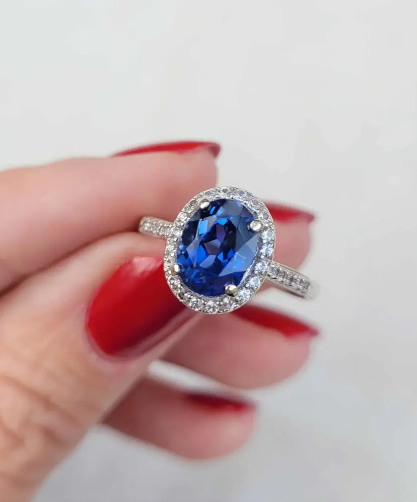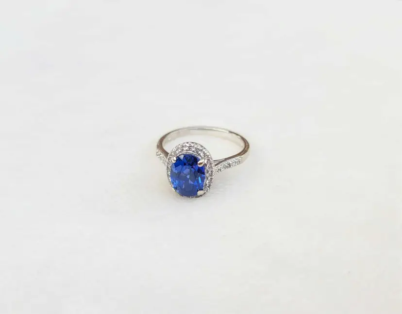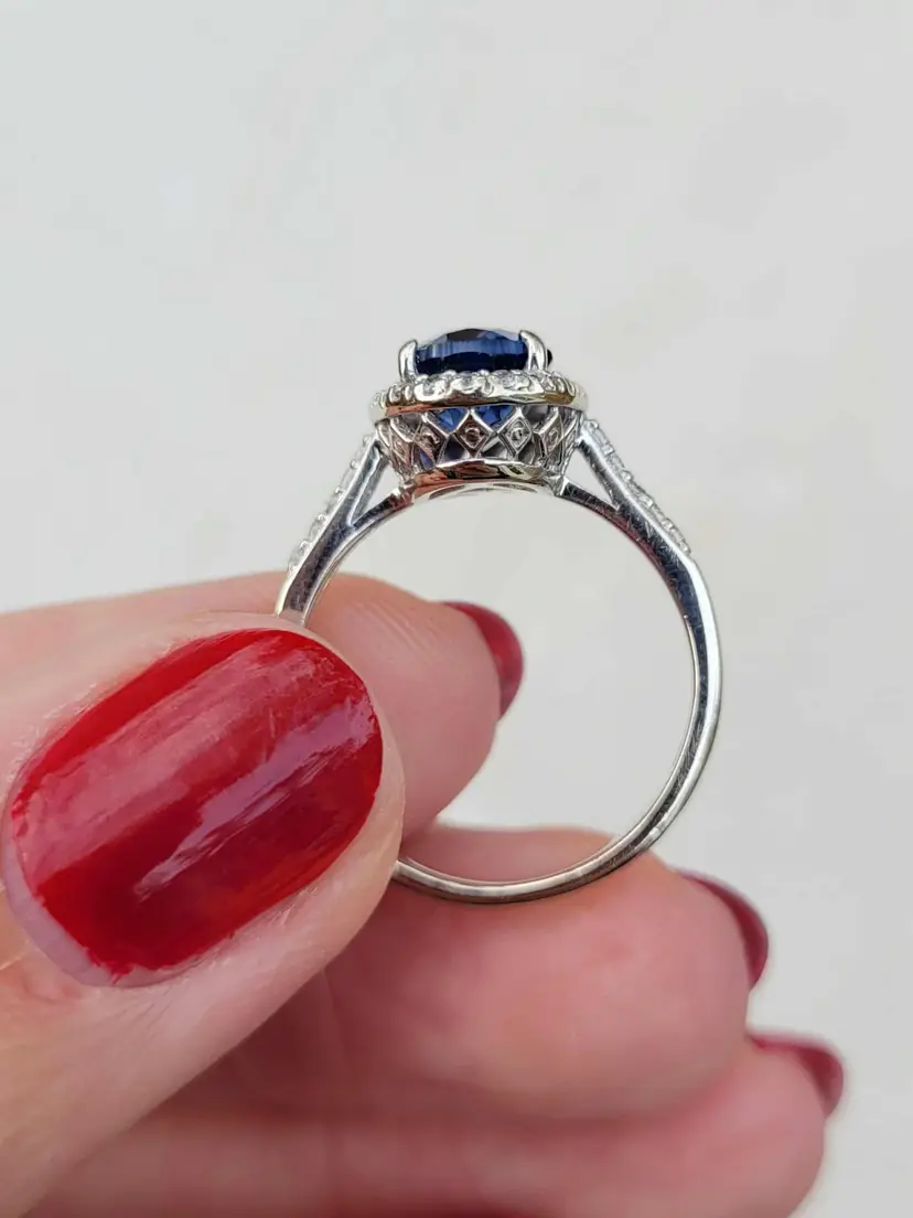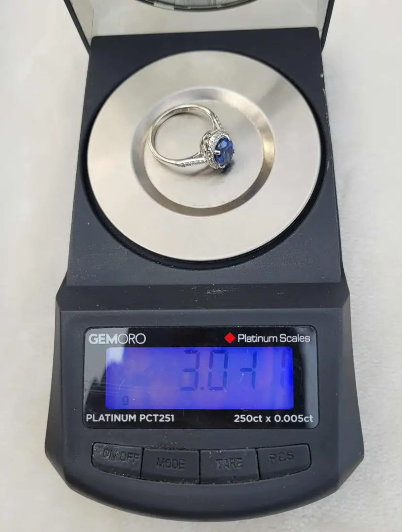 Gorgeous 10k white gold sapphire ring, in the style of Princess Diana's famous sapphire! This would make a lovely engagement ring, or special little treat for yourself. The rich ocean blue center sapphire is surrounded be a halo of white sapphires, all verified via Presidium tester and Spectrometer. It is in good condition and circa 1990s, with some minor abrasions to the facets that I could only see when zoomed in with the camera. Please see pictures for details, does not include my ring box.