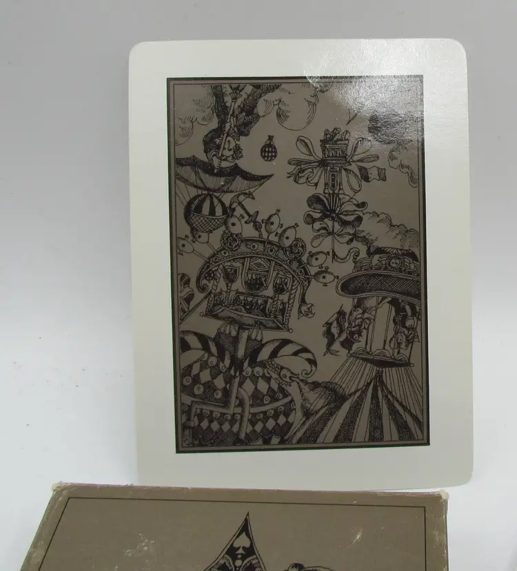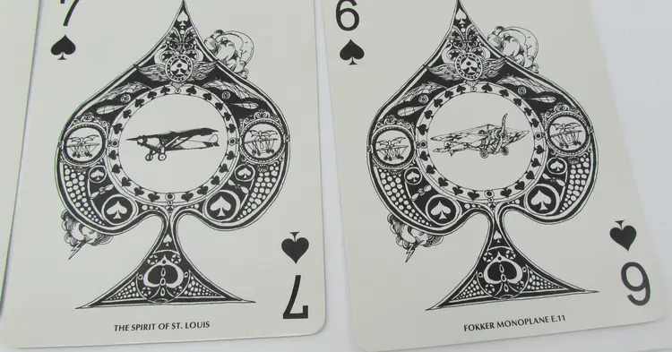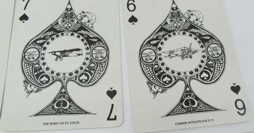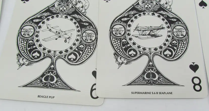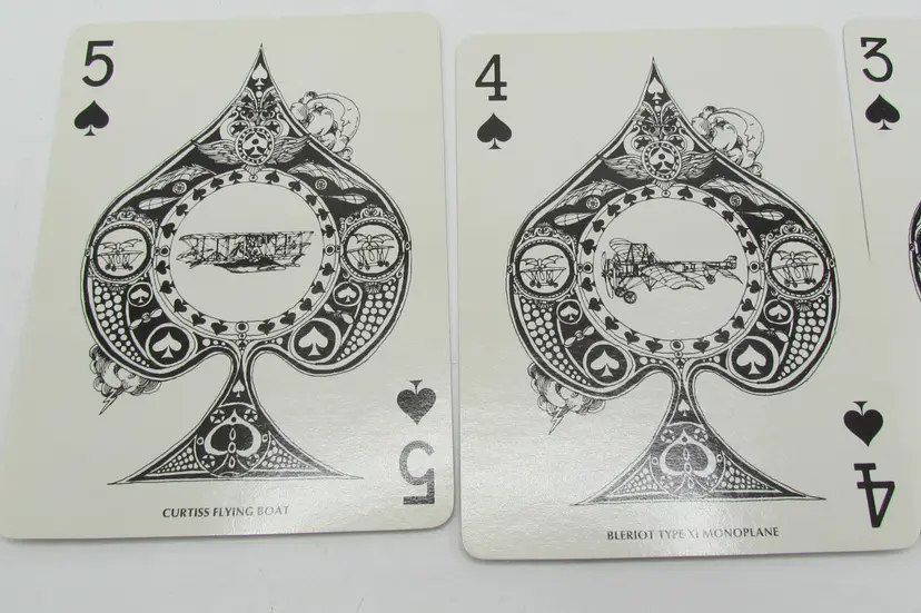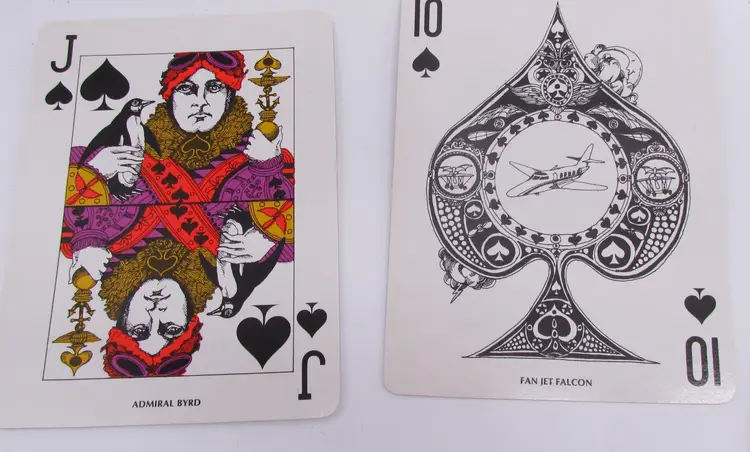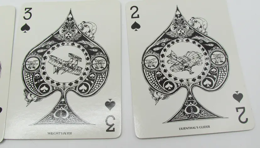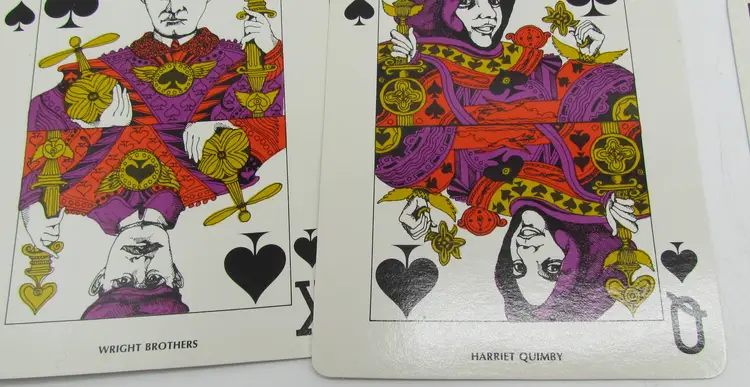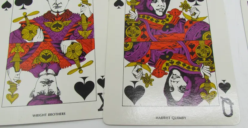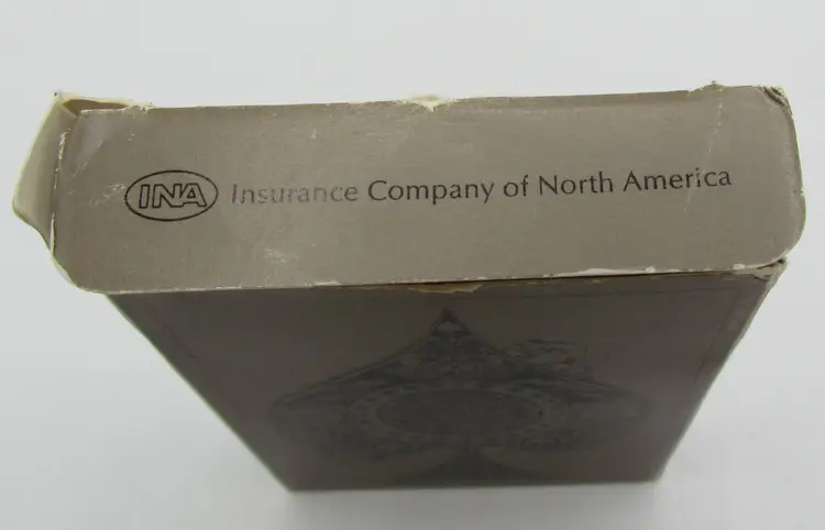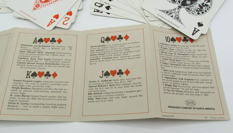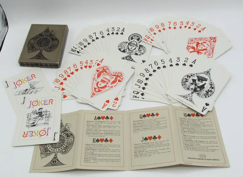 The product is a rare set of vintage 1972 INA historical playing cards featuring an aviation theme. These oversized cards were manufactured in the United States and come with a guide. They are 3 1/4" x 4 1/4". INA is Insurance company of North America. Each face card has a different person famous in the aviation world and each of the numbered cards have different airplanes, all of the 2's have one plane, all of the 3's have a different plane etc. Pictures show close up of one suit to give you an idea. The guide booklet gives background information on the photos. All cards including 2 Jokers are in great condition, box showes wear consistant with age. Please see photos.