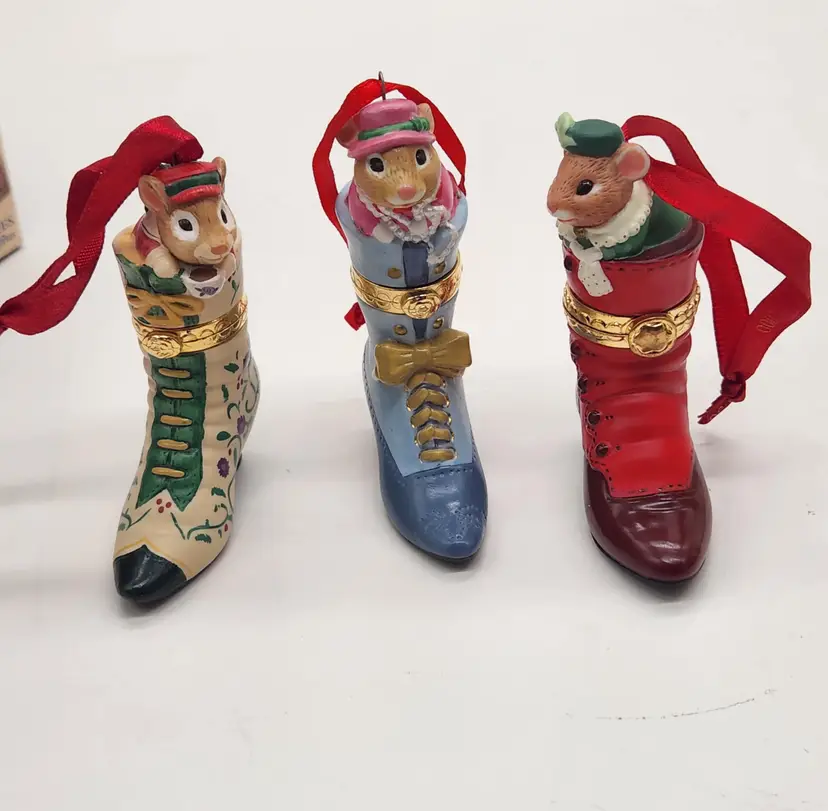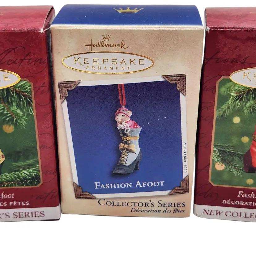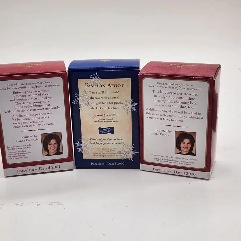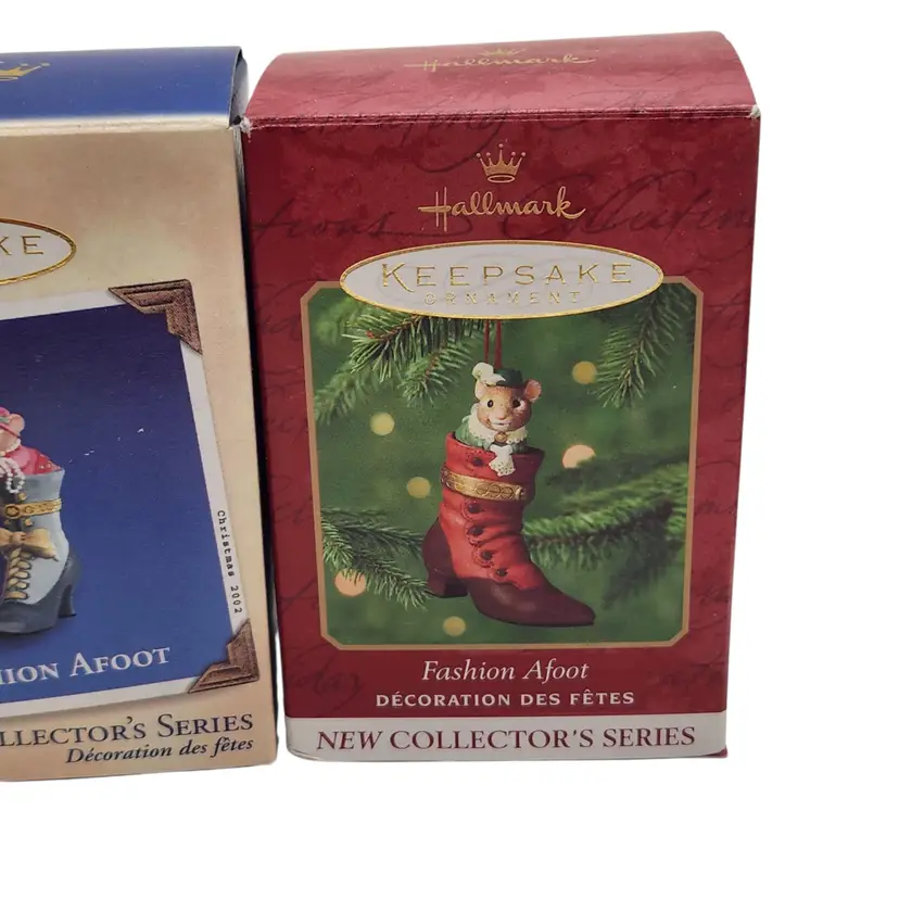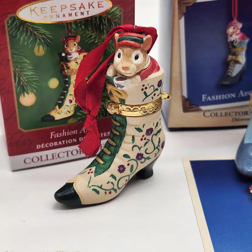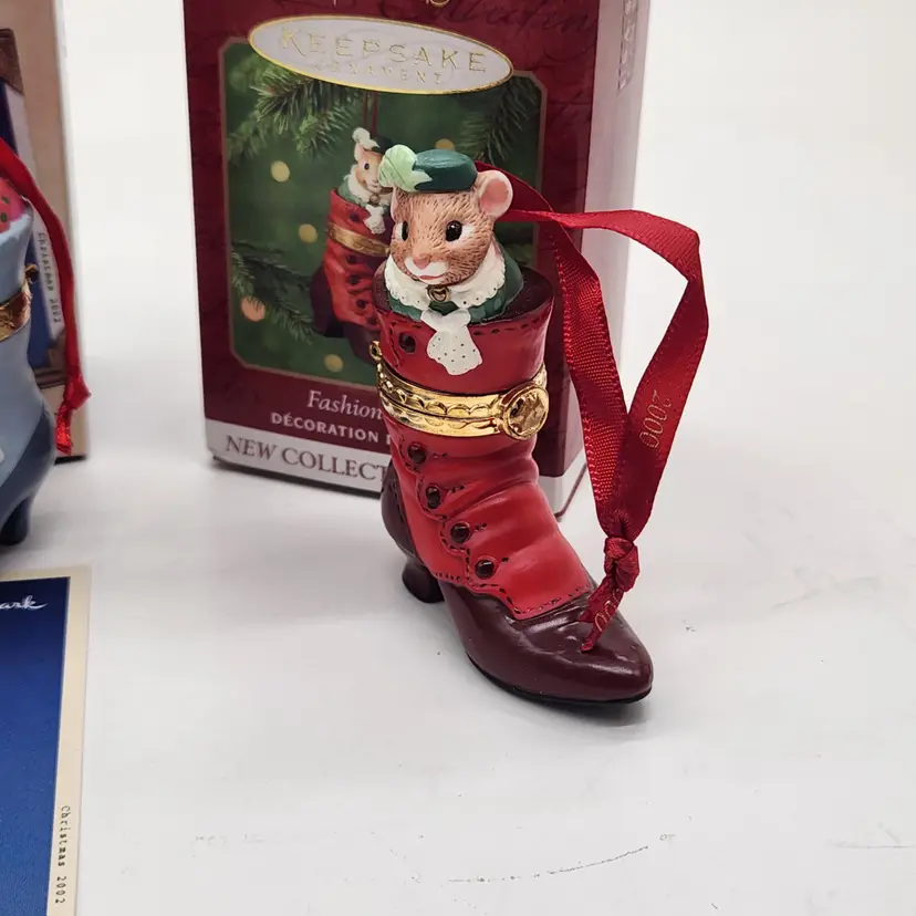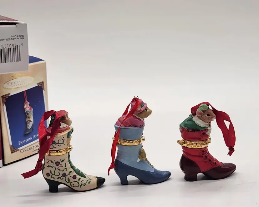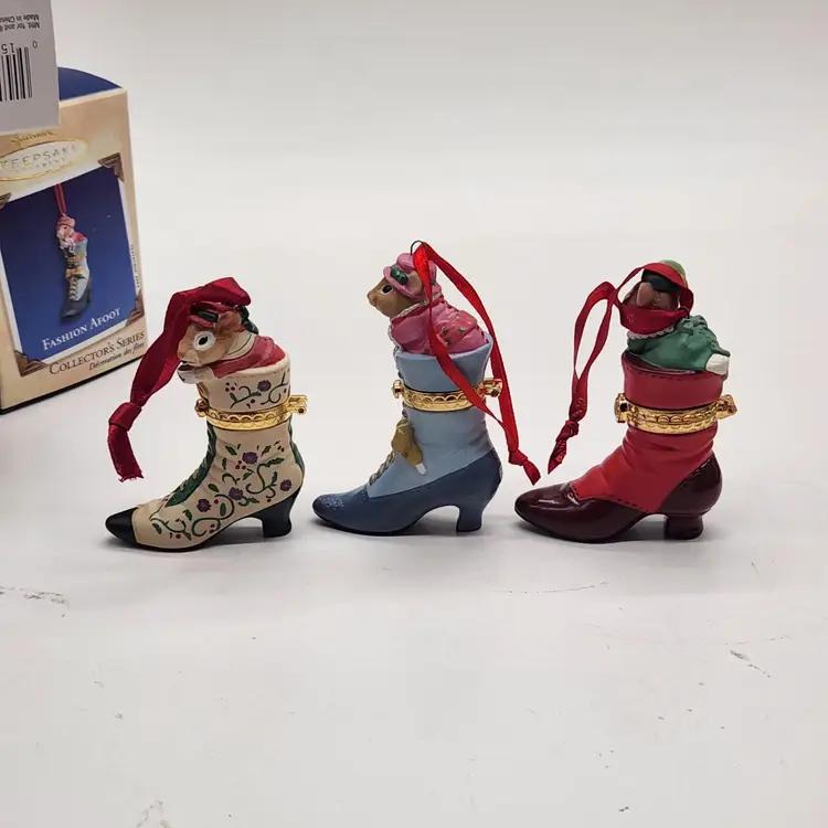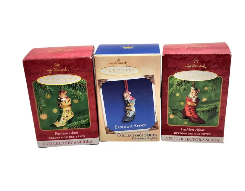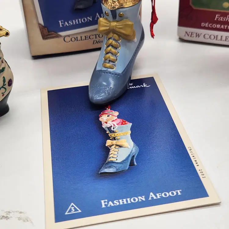 2000, 2001 & 2002 Hallmark Keepsake Christmas Ornament Fashion Afoot Series Set. Each ornament is decorated with a multicolor all-over pattern and includes a hanging feature plus a hinge to use these as a holder for something. All of these Christmas tree ornaments are in one series. Each one is dated and their series number. Year 2000 and #1 are the red boot, 2001, #2 are the white boot, and 2002, #3 are the blue boot.