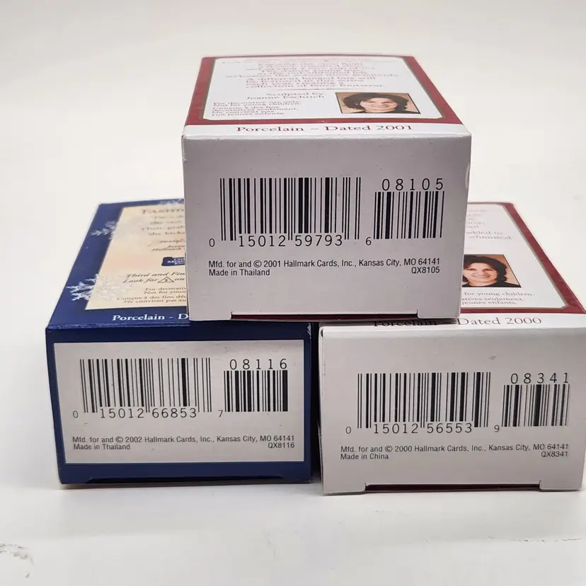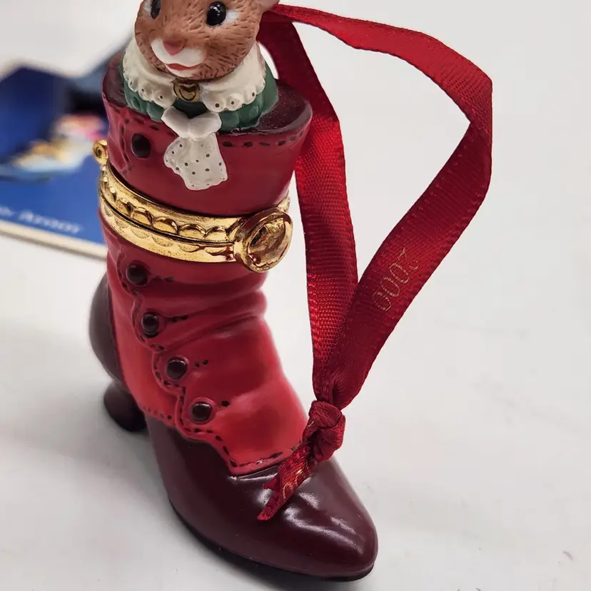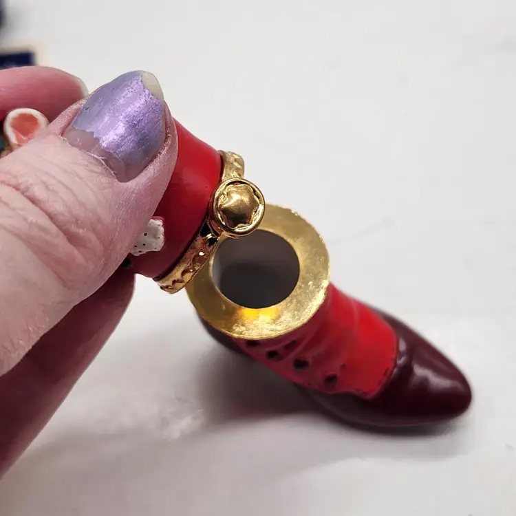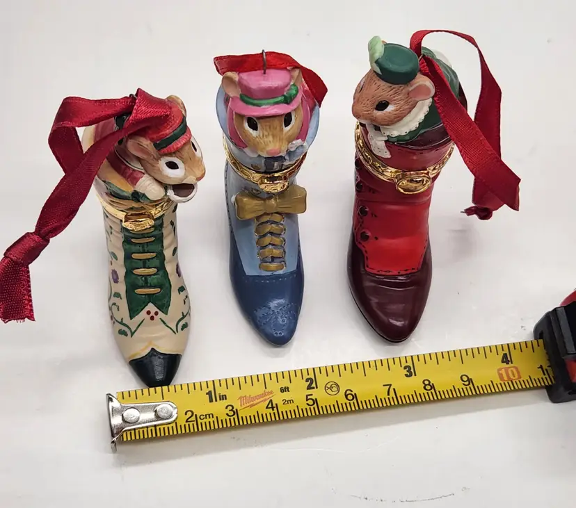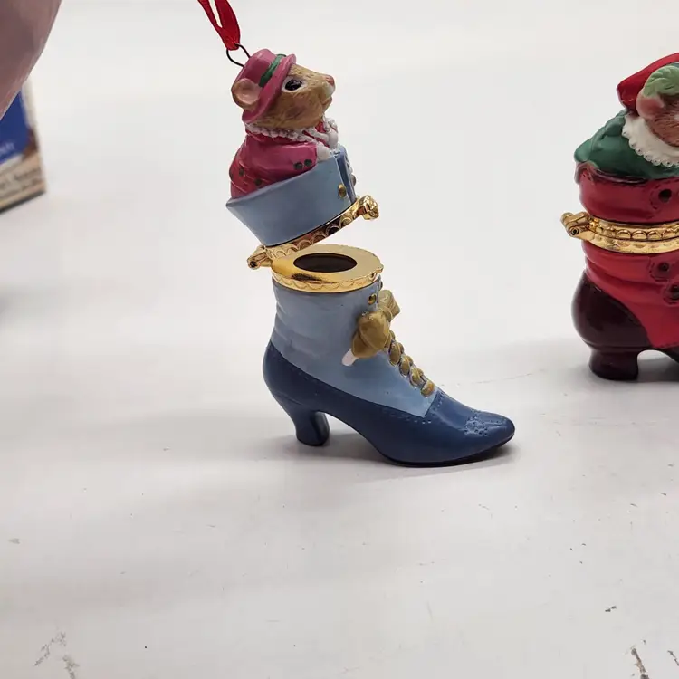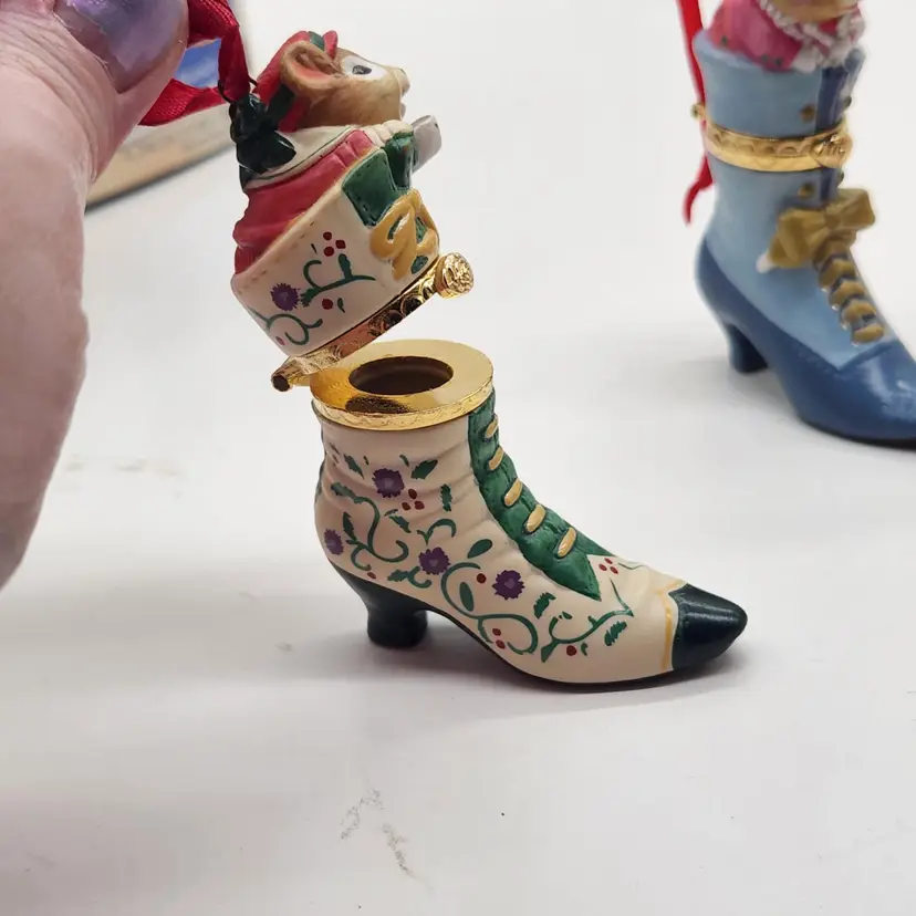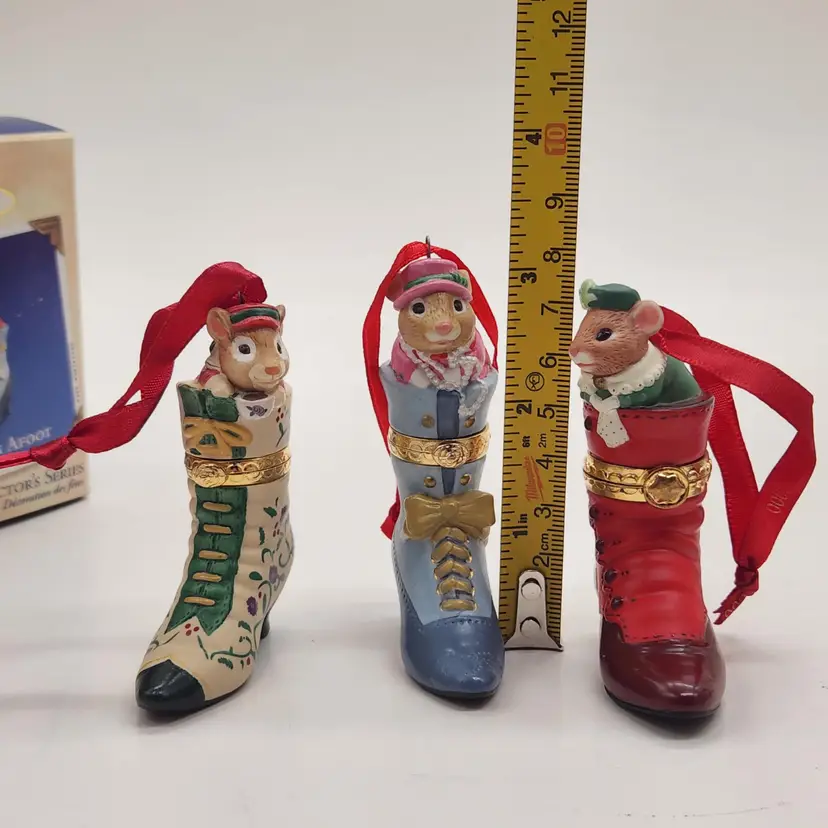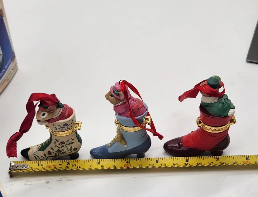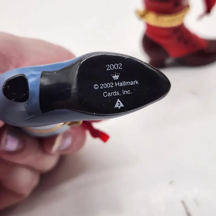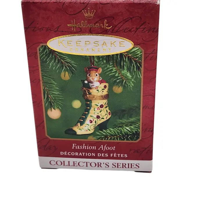 2000, 2001 & 2002 Hallmark Keepsake Christmas Ornament Fashion Afoot Series Set. Each ornament is decorated with a multicolor all-over pattern and includes a hanging feature plus a hinge to use these as a holder for something. All of these Christmas tree ornaments are in one series. Each one is dated and their series number. Year 2000 and #1 are the red boot, 2001, #2 are the white boot, and 2002, #3 are the blue boot.