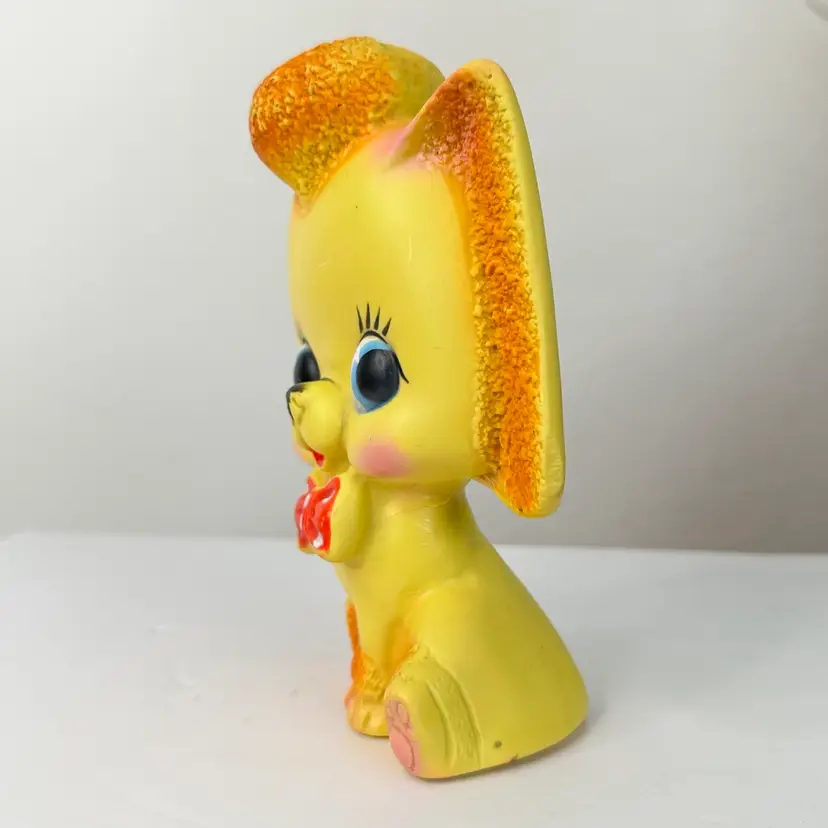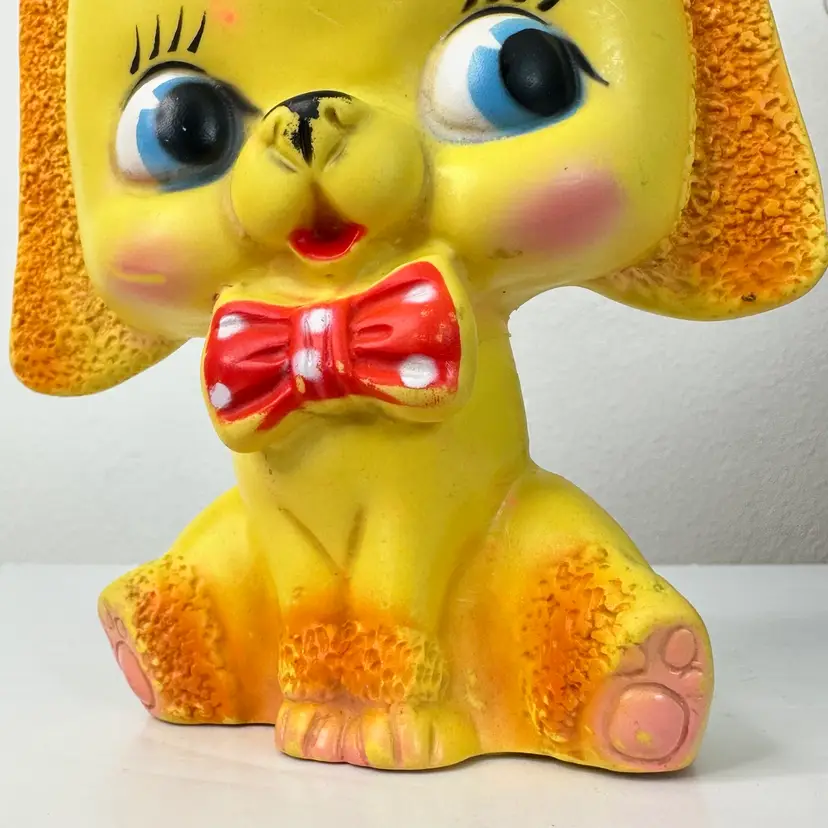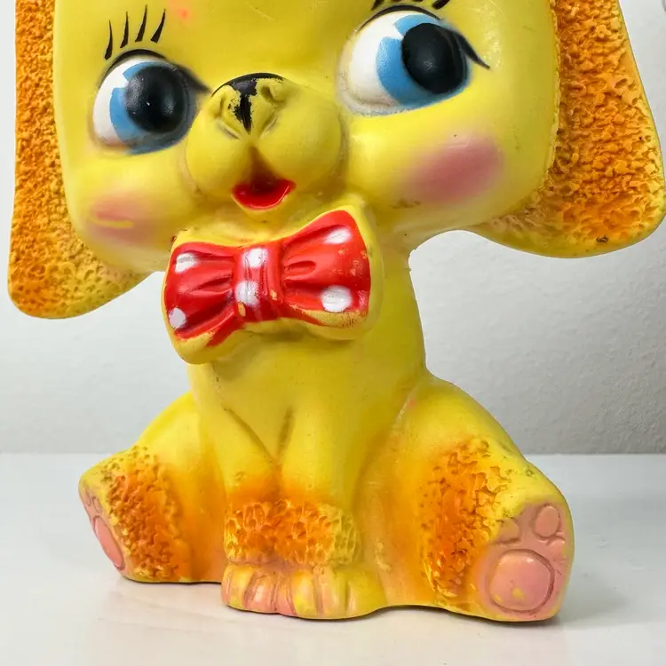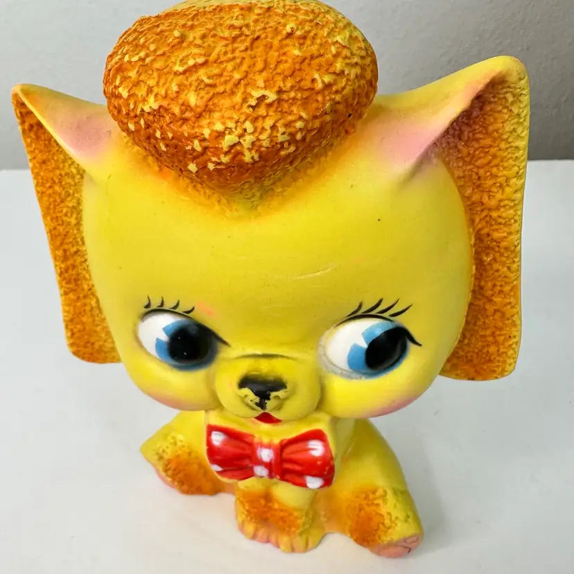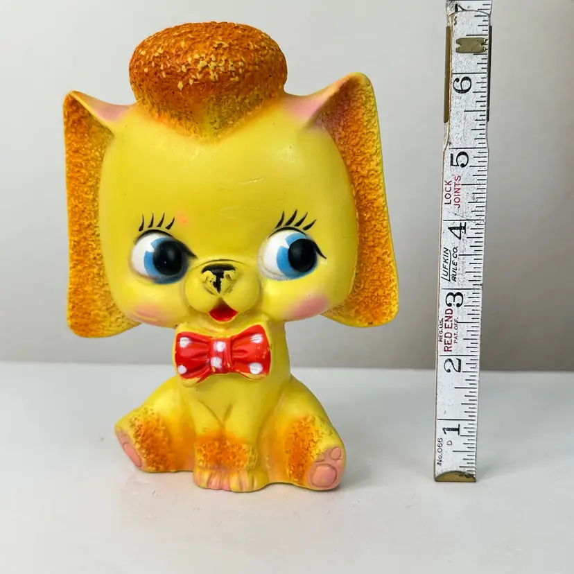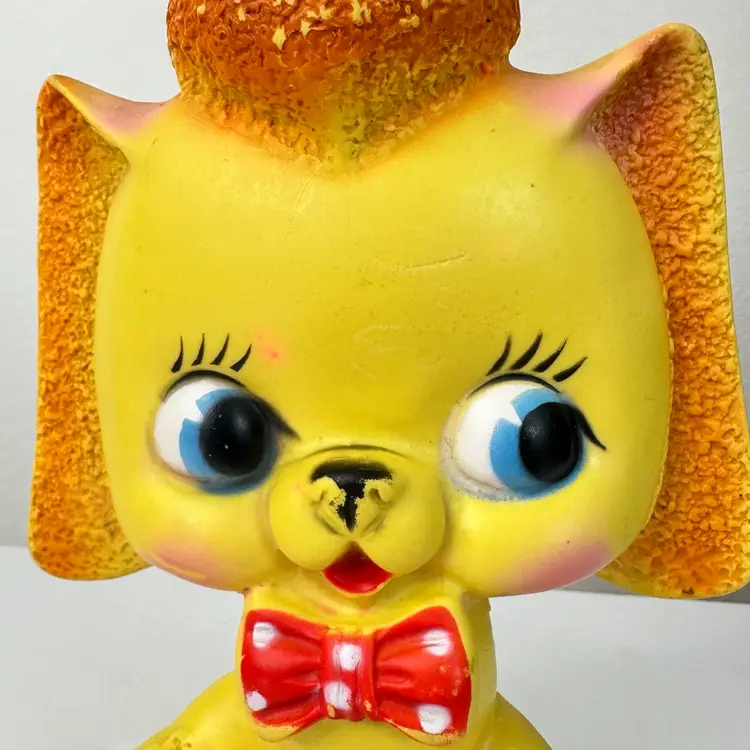 The product is a vintage AlanJay bowtie dog combex kit, a quirky and nostalgic toy from 1960. Made in the United States, this Arnold style poodle works collectible features a unique one-piece design that fits in the category of vintage and antique toys. Perfect for collectors of classic toys, this item brings a touch of whimsy and charm to any toy collection with its retro design and fun squeaking feature.see all photos for minor wear!
